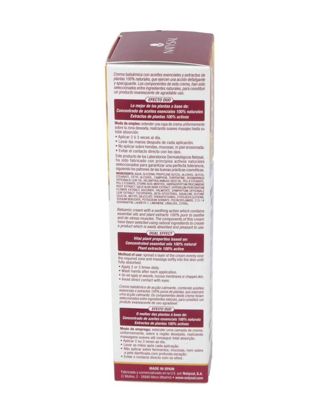 INCI: Aqua, glycerin, propylene glycol, alcohol, glycol stearate, cetyl alcohol, camphor, turpentine, rosmarinus officinalis leaf oil, helianthus annuus seed oil, peg 8 stearate, peg-2 stearate, stearic acid, menthol, harpagophytum procumbens root extract, salix alba bark extract, hypericum perforatum flower extract, ascorbyl palmitate, symphytum officinale leaf extract, tocopherol, beta-sitosterol, squalene, glycine soja oil, methyl salicylate, phenoxyethanol, ethylhexylglycerin, sodium benzoate, potassium sorbate, polyacrylamide, c13-14 isoparaffin, laureth 7, limonene, linalool, citral.
