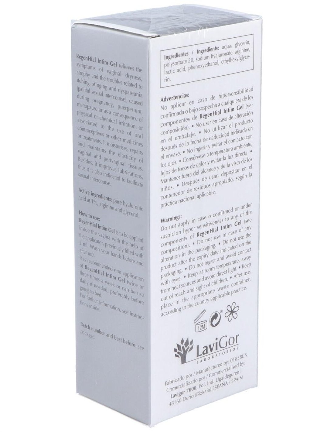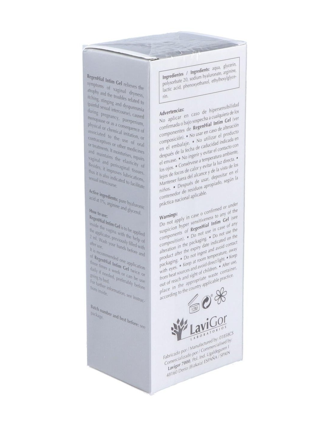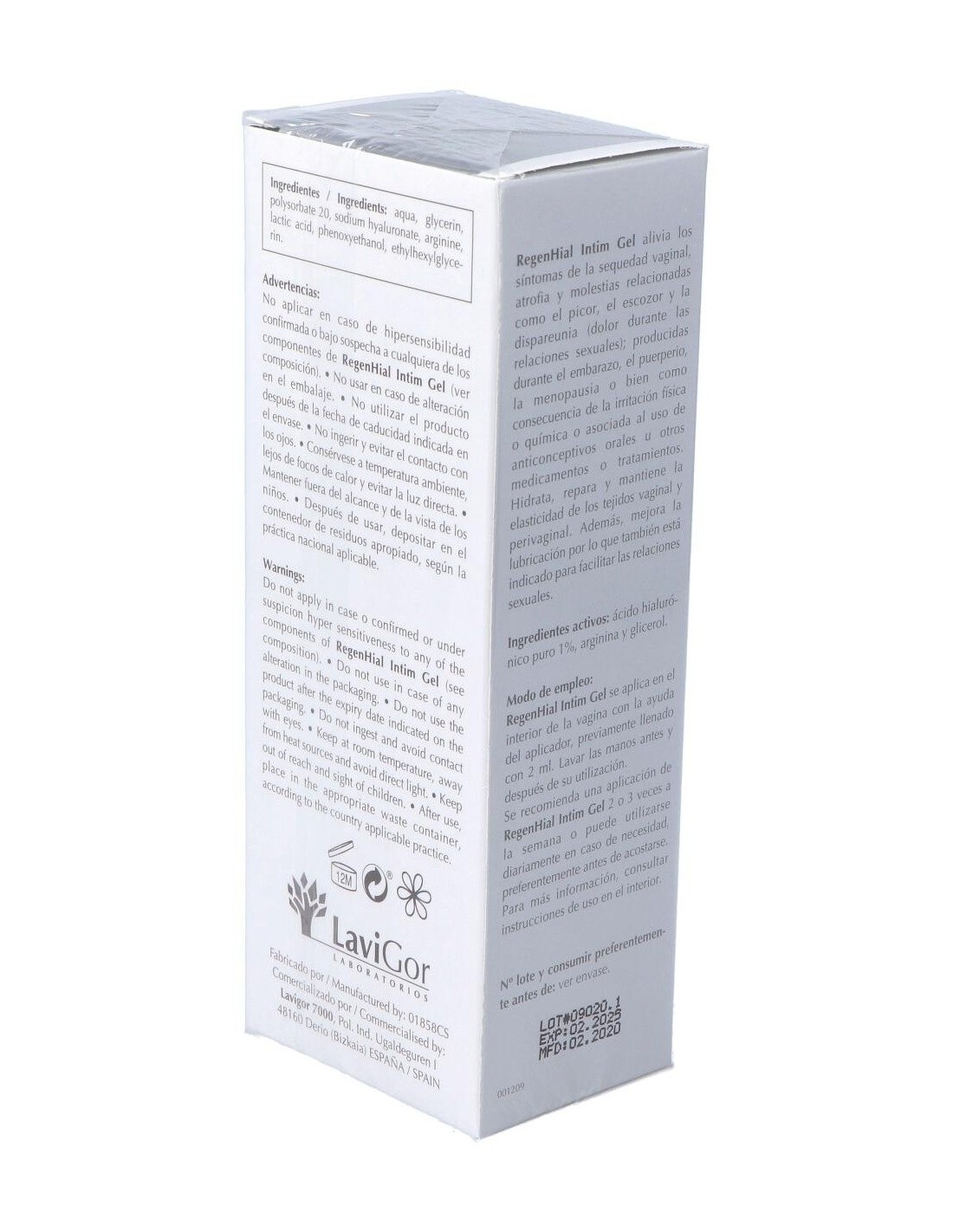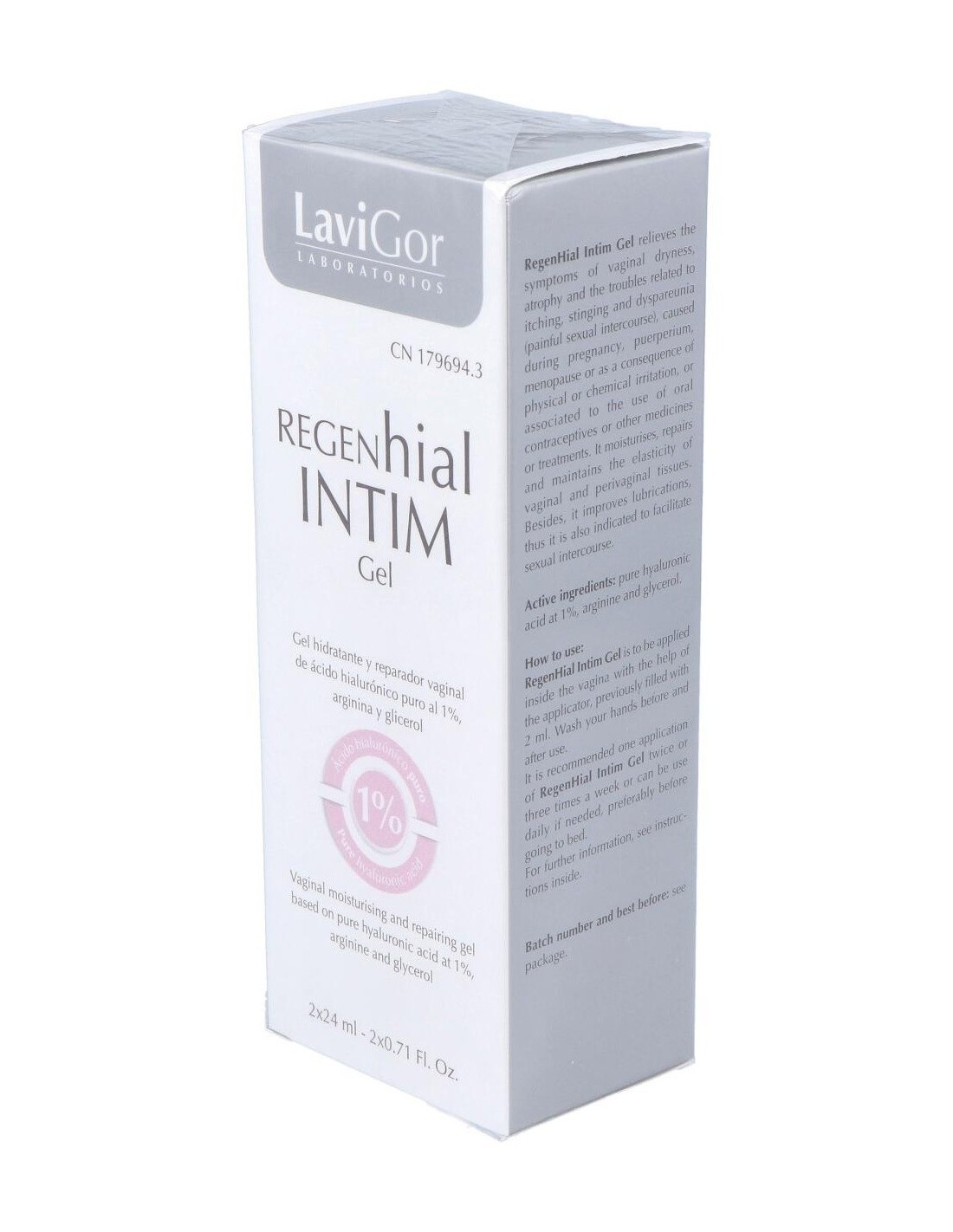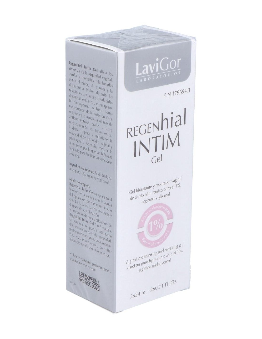 Gel hidratante y reparador vaginal de uso interno con ácido hialurónico al 1%, arginina y glicerol. Está especialmente indicado para aliviar los síntomas de la sequedad vaginal, atrofia y molestias relacionadas con el picor, el escozor y la dispareunia, producidas por reducción estrogénica, irritación física o química, anticonceptivos, medicamentos, etc. Su aplicación se recomienda también después de tratamientos de corrección de suelo pélvico, así como para mejorar la lubricación y facilitar las relaciones sexuales.
