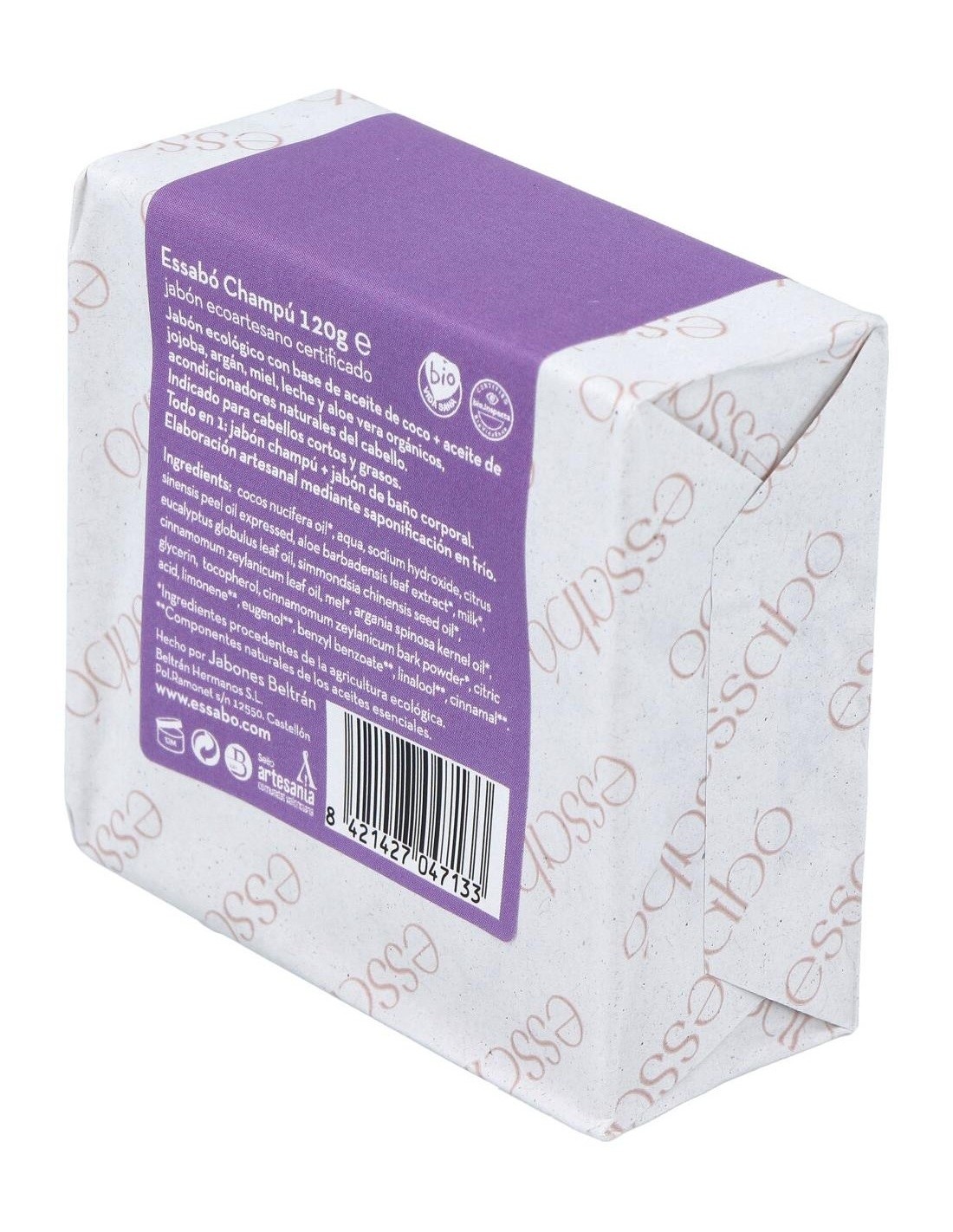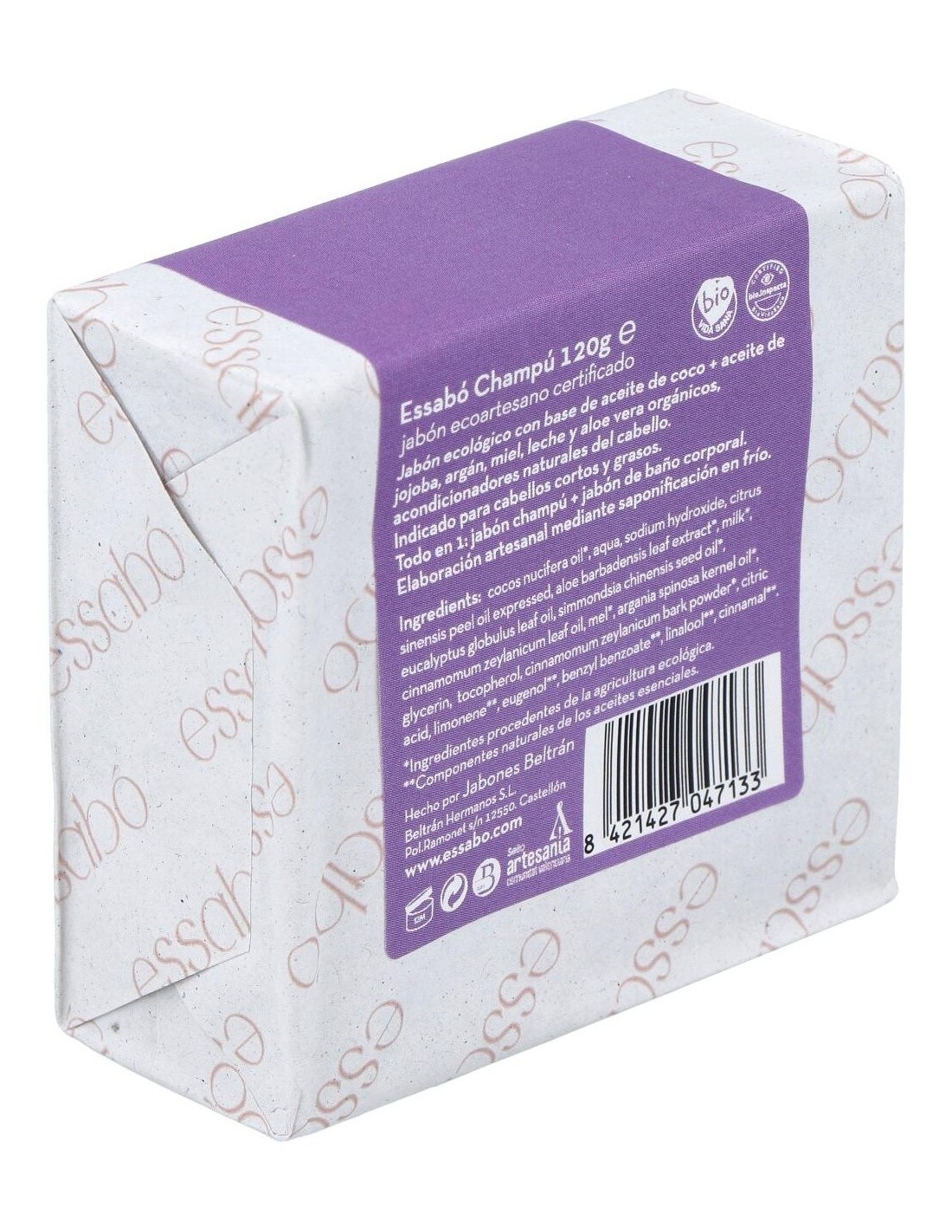 El champú ecológico Essabó, de la marca Jabones Beltrán, está formulado sin tensoactivos, a base de ingredientes naturales y ecológicos para asegurar una higiene efectiva del pelo. Esta barra contiene aceites de oliva, jojoba y coco, aloe vera y argán, además de leche y miel, para acondicionar de manera natural la fibra capilar. Es un producto cosmético ecológico, completamente libre de siliconas, parabenos y fosfatos.