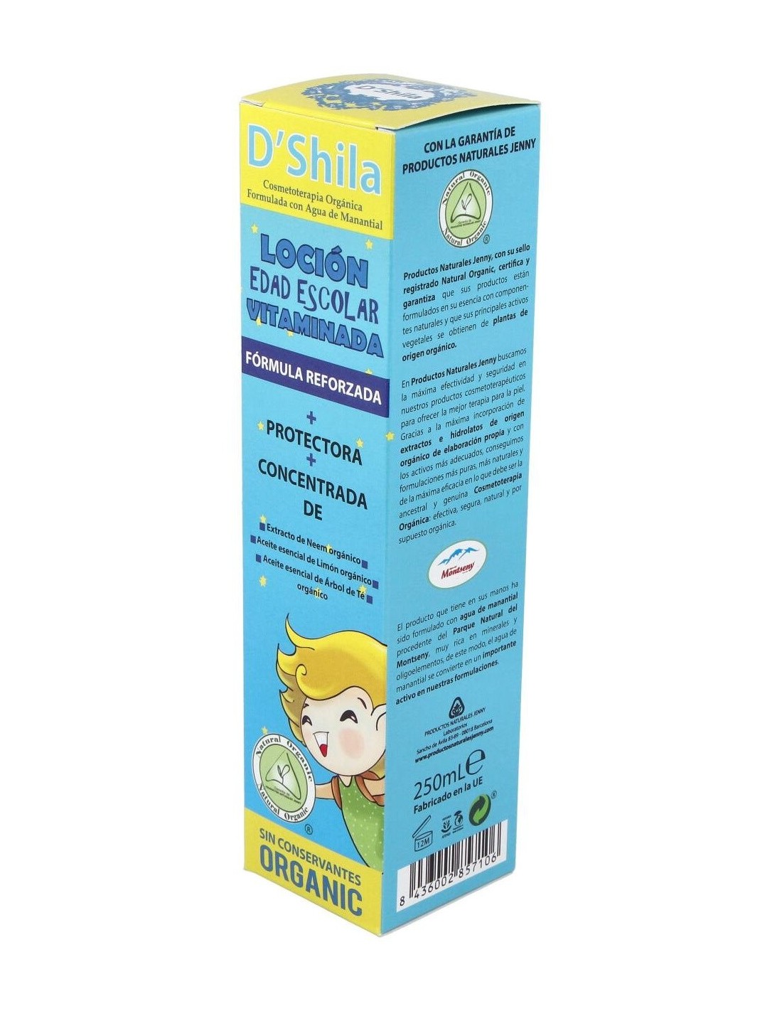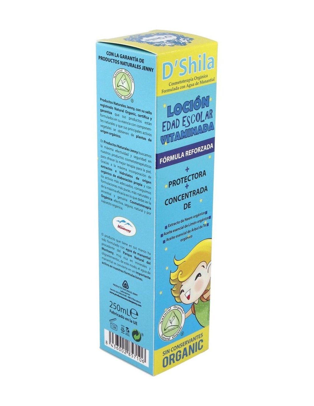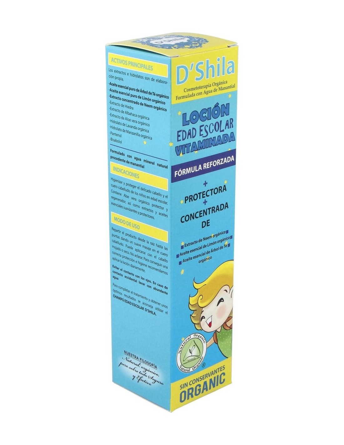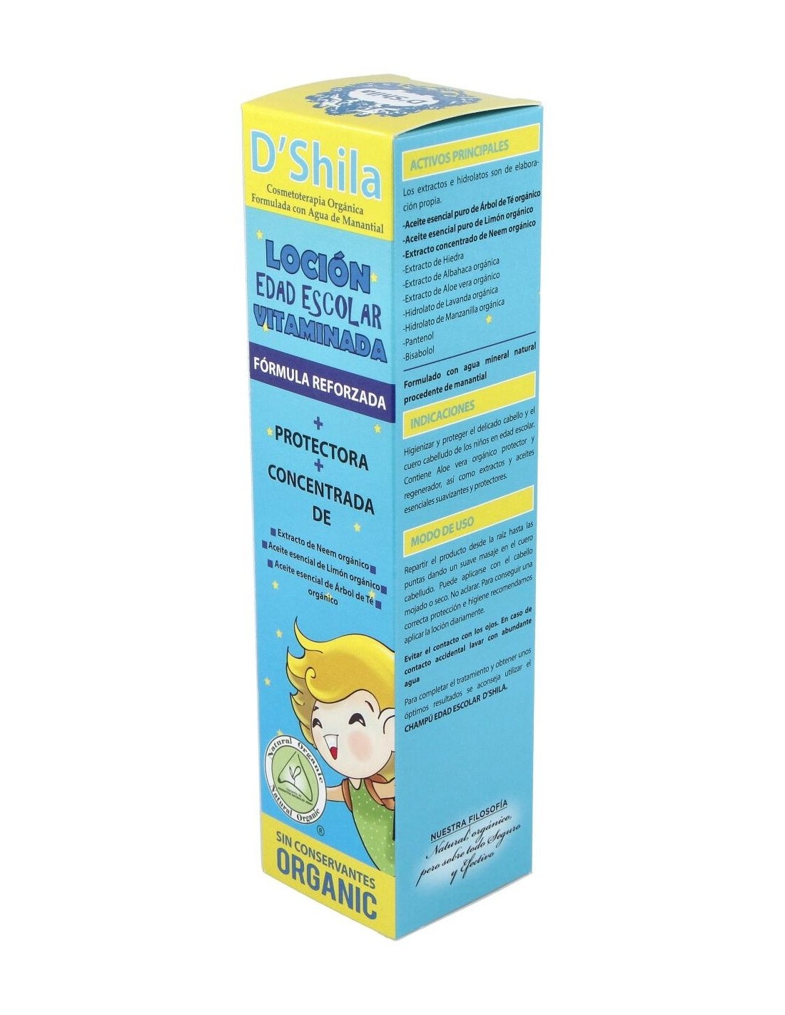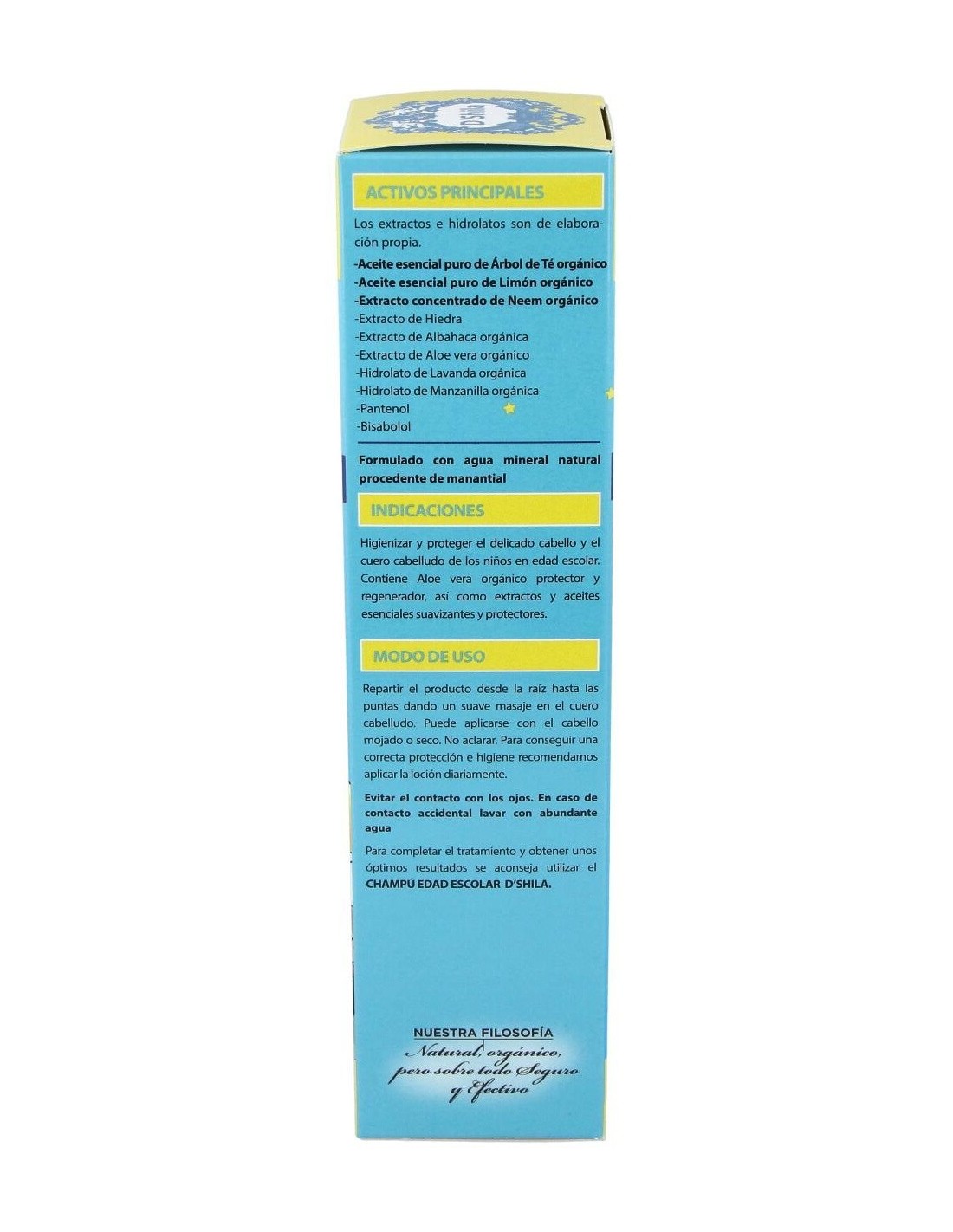 La loción vitaminada para niños de D'shila higieniza el cabello de los niños en edad escolar. Indicado para prevenir la formación de piojos, es una loción preventiva y totalmente natural. Contiene proteínas reestructurantes de trigo, albahaca, aloe vera obtenido de cultivo orgánico y aceites esenciales de limón con propiedades suavizantes.
