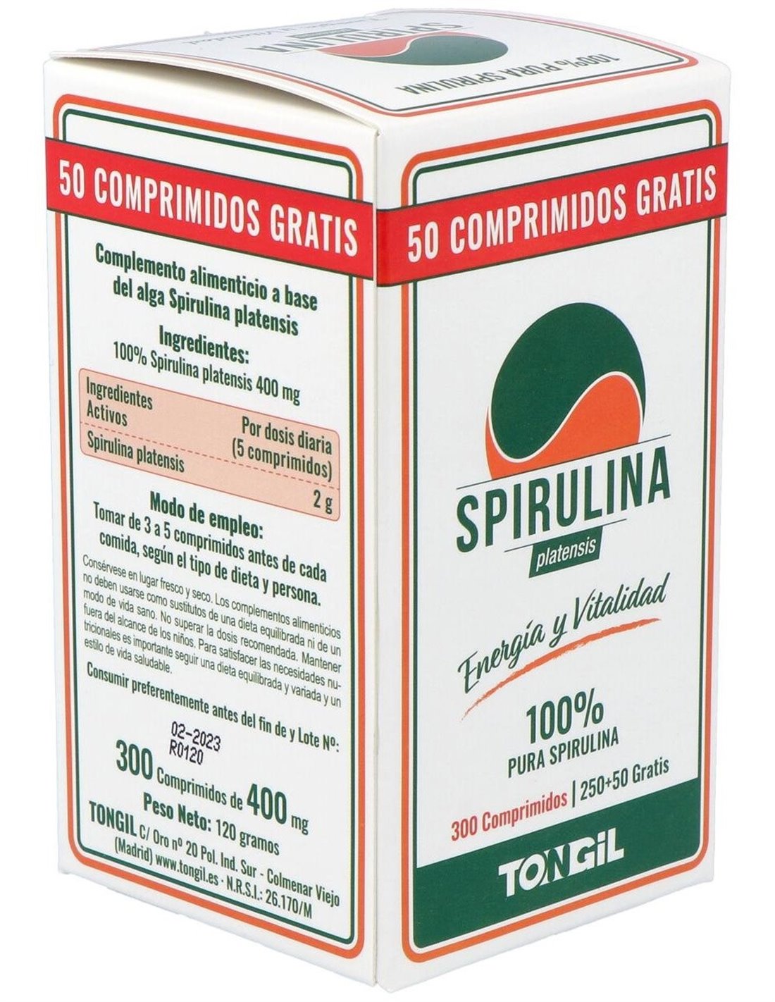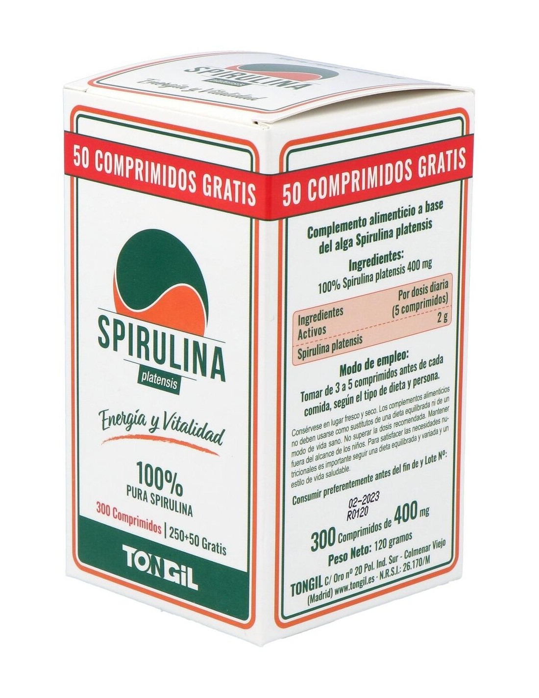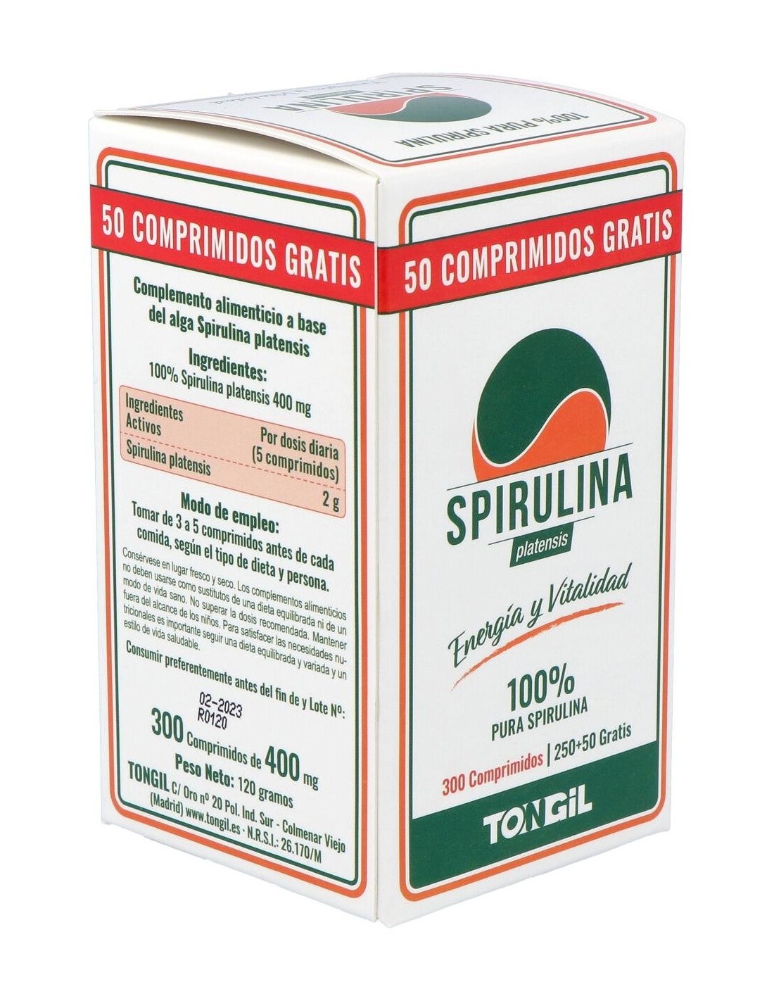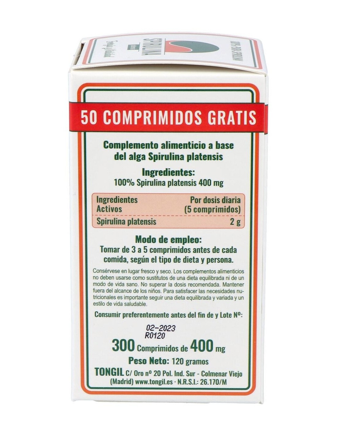Por 5 comprimidos: 100% Spirulina platensis (2 g).