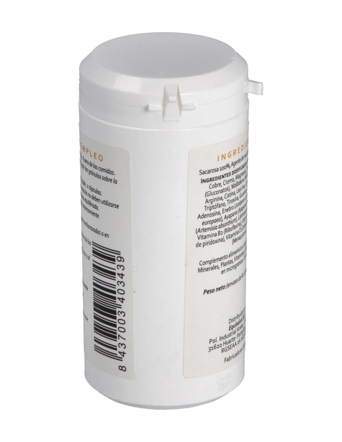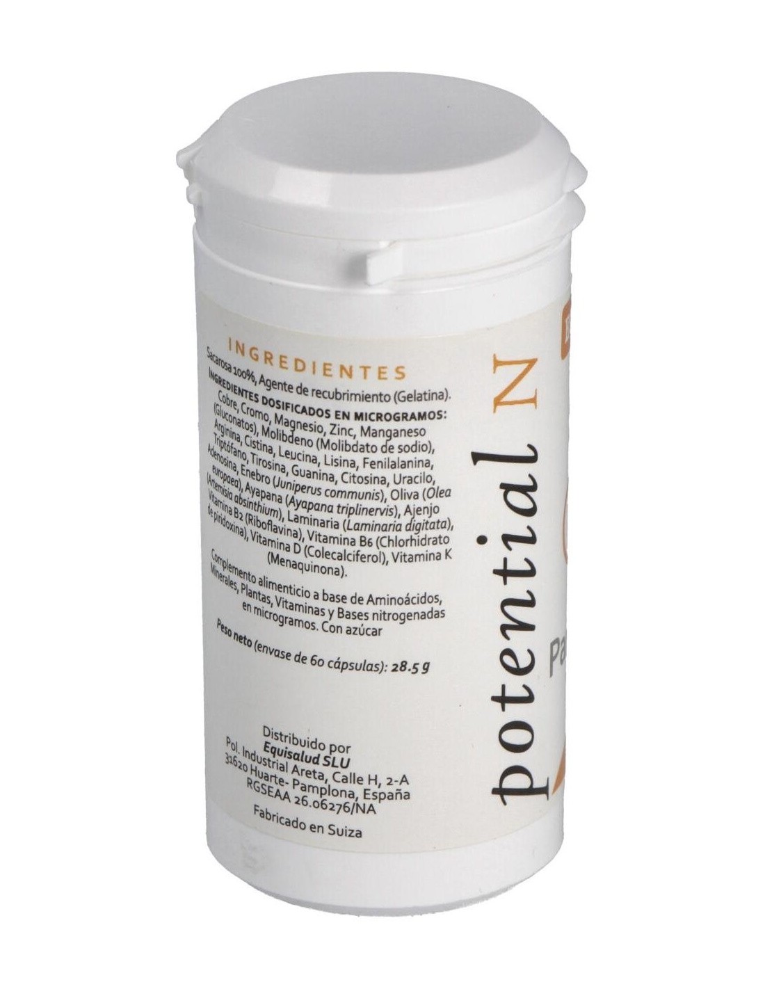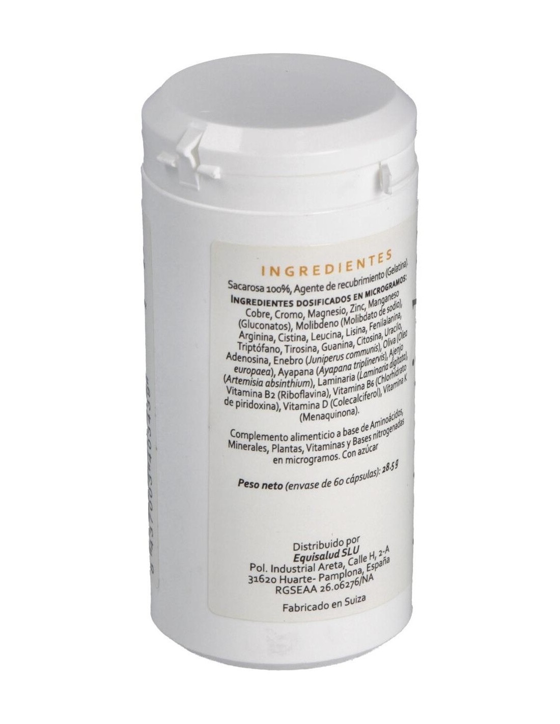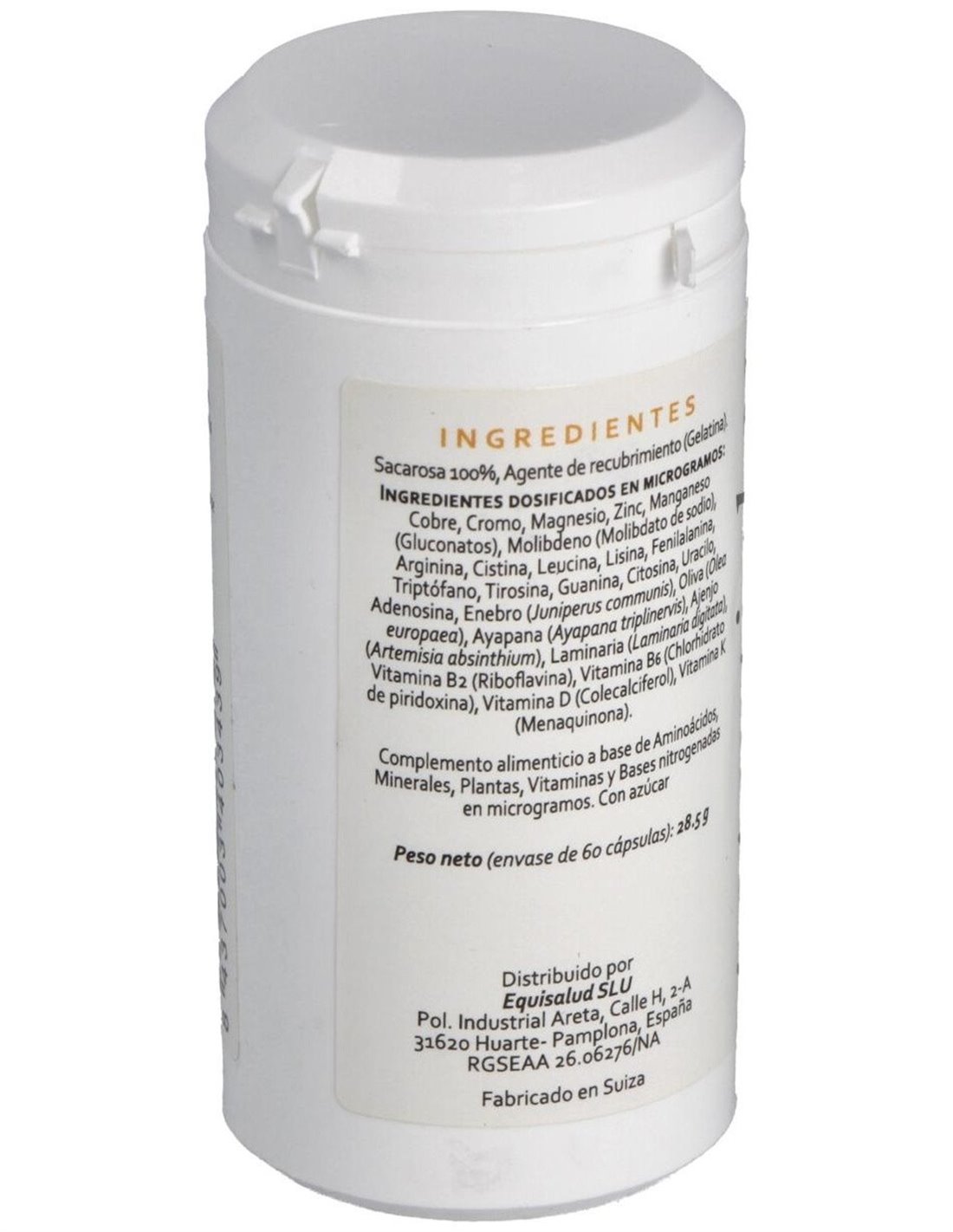 Minerales: cobre, cromo, magnesio, zinc y manganeso (gluconatos), molibdeno (molibdato de sodio). Aminoácidos: arginina, cistina, leucina, lisina, fenilalanina, triptófano, tirosina, guanina, citosina, uracilo, adenosina. Plantas: enebro (Juniperus communis), oliva (Olea europaea), ayapana (Ayapana triplinervis), ajenjo (Artemisia absinthium), laminaria (Laminaria digitata). Vitaminas: vitamina B2 (riboflavina), vitamina B6 (clorhidrato de piridoxina), vitamina D (colecalciferol), vitamina K (menaquinona). Envoltura: Agente de recubrimiento (gelatina), sacarosa 100%.
