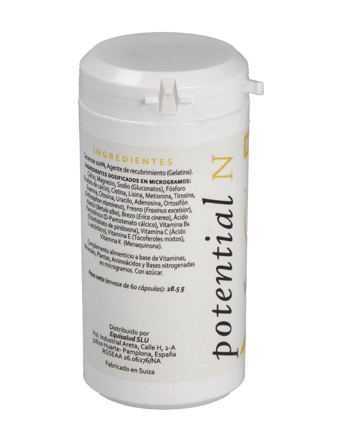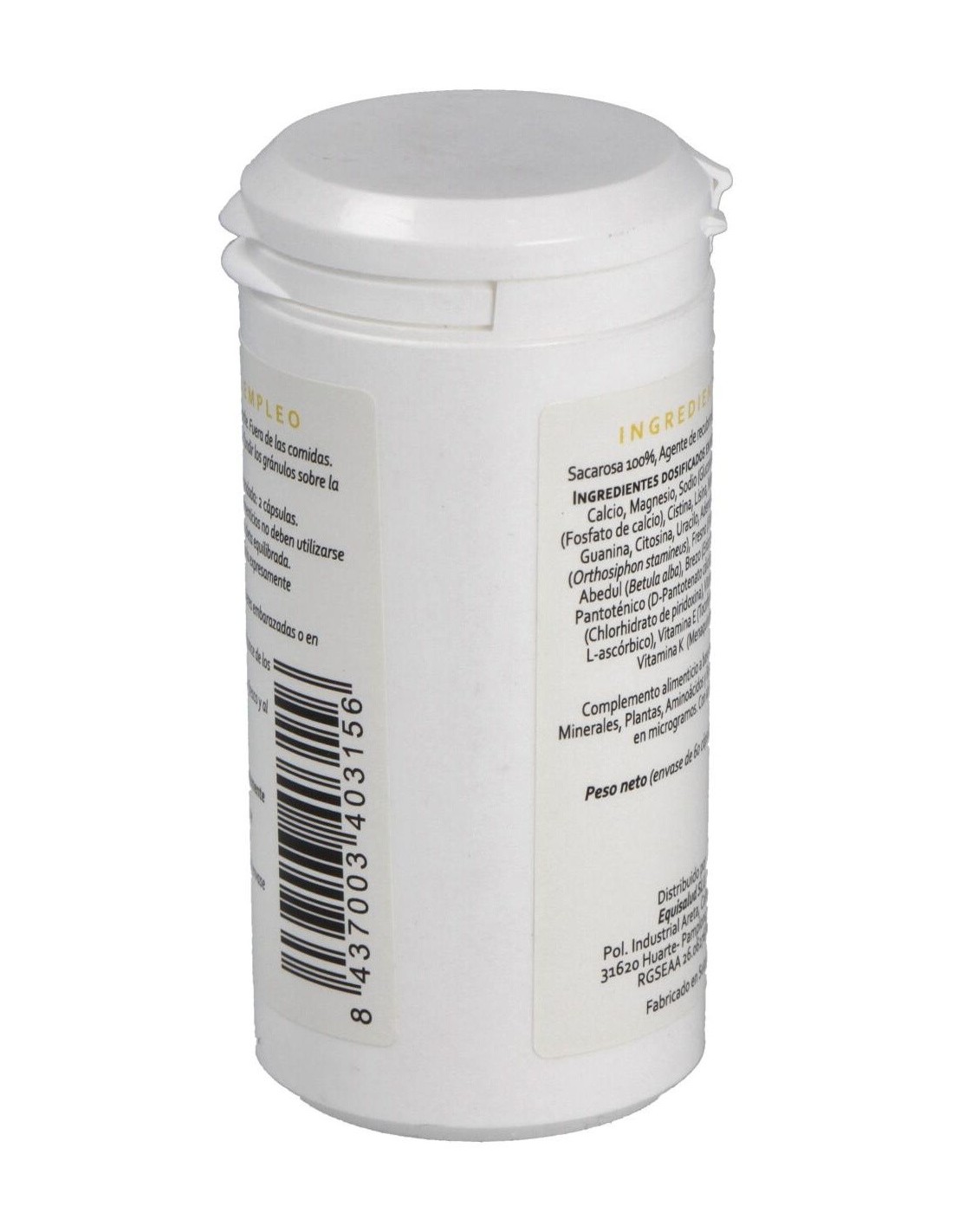 Minerales: calcio, magnesio y sodio (gluconatos), fósforo (fosfato de calcio). Aminoácidos: cistina, lisina, metionina, tirosina, guanina, citosina, uracilo, adenosina. Plantas: ortosifón (Orthosiphon stamineus), fresno (Fraxinus excelsior), abedul (Betula alba), brezo (Erica cinerea). Vitaminas: ácido pantoténico (D-pantotenato cálcico), vitamina B6 (clorhidrato de piridoxina), vitamina C (ácido L ascórbico), vitamina E (mezcla de tocoferoles), vitamina K (menaquinona). Envoltura: Agente de recubrimiento (gelatina), sacarosa 100%.