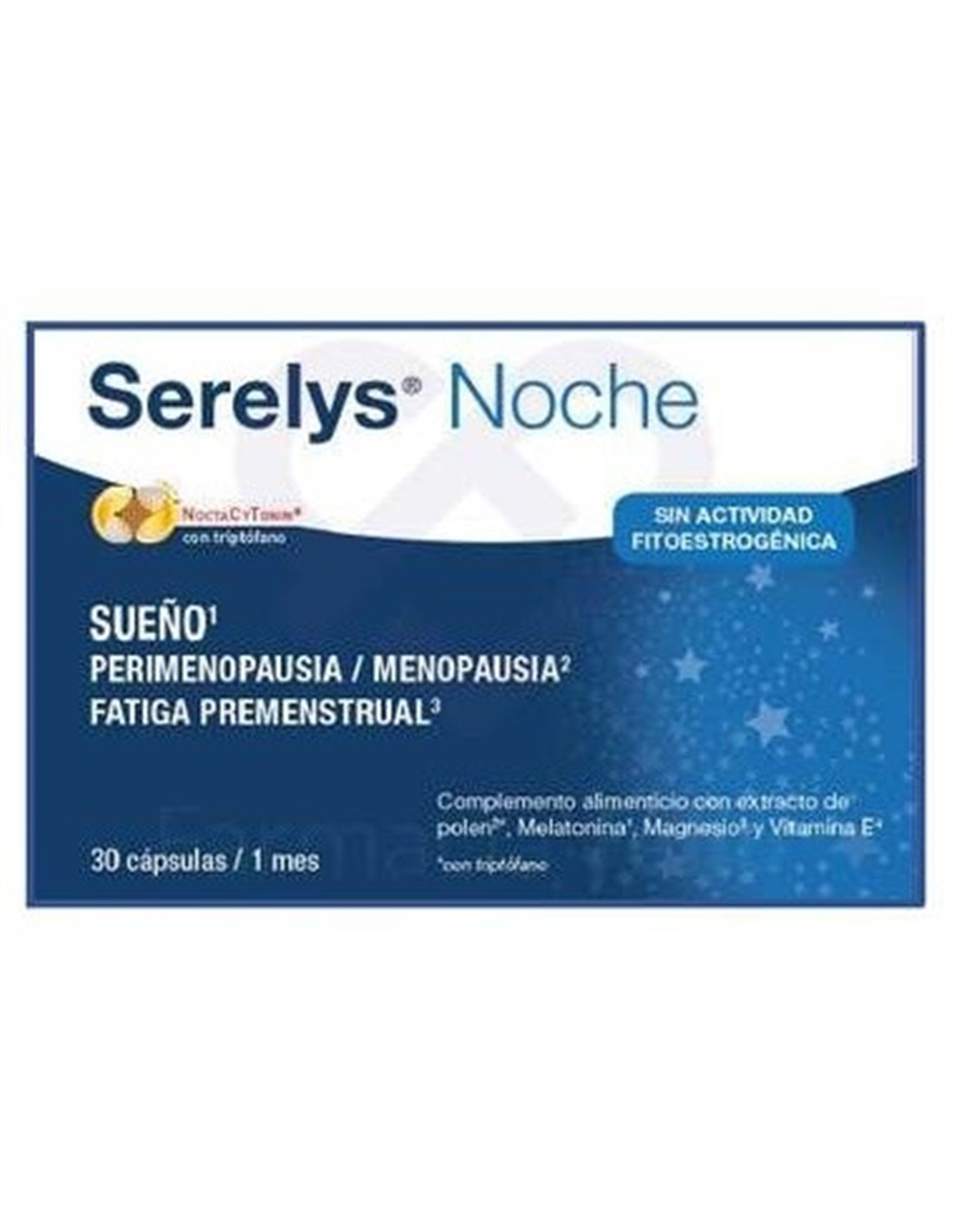 Complemento alimenticio Serelys Noche, presentado en formato de cápsulas para el insomnio durante la menopausia. Producto con una fórmula exclusiva que contiene extractos citoplasmáticos de polen purificado, melatonina, magnesio y vitamina E.La composición ayuda a conciliar el sueño con las diferentes etapas de la mujer: etapa premenstrual, premenopausia y menopausia.Contribuye además al bienestar durante la menopausia reduciendo los sofocos.