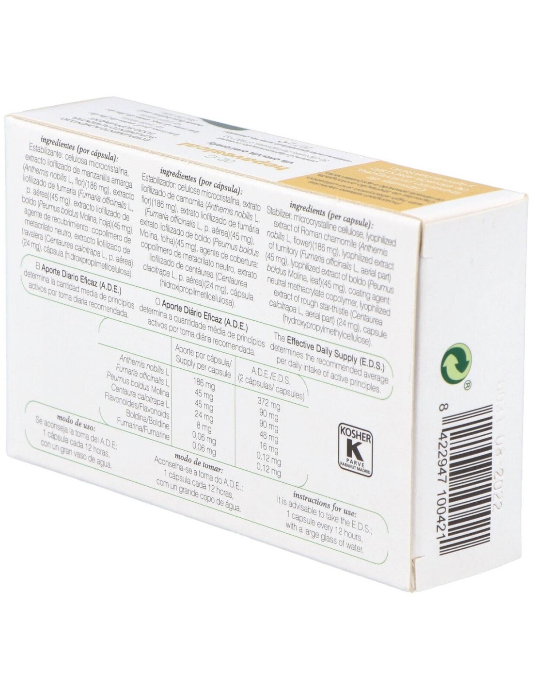 Cápsulas de liberación prolongada y de elevada absorción y aprovechamiento indicadas para el cuidado hepático y biliar. A base de plantas que tienen la capacidad natural de estimular la producción y liberación de bilis en el hígado y la vesícula biliar. Combina la acción de diferentes plantas conocidas tradicionalmente por tener estos efectos digestivos, como son la manzanilla amarga (Anthemis noblis L.), la fumaria (Fumaria officinalis L.), el boldo (Peumus boldus Mol) y la centáurea (Centaurium erythraea).