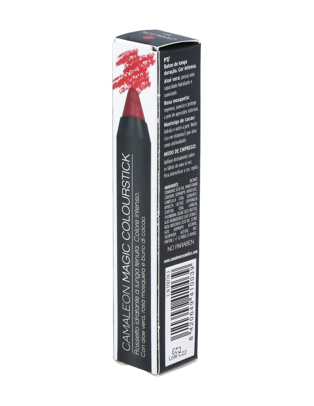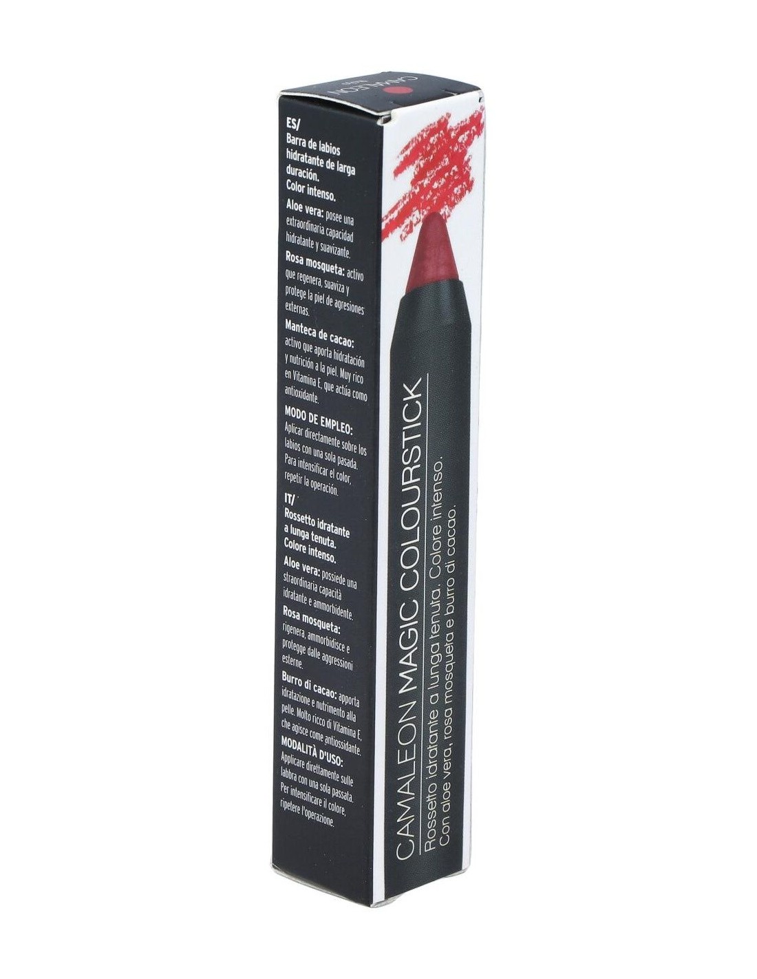 Camaleon ofrece la gama Magic Colour, formada por unos lápices labiales de colores intensos y vivos. En esta ocasión, la tonalidad rojo/burdeos es la elegida, cuya composición ha sido enriquecida con aloe vera, rosa mosqueta y manteca de cacao.