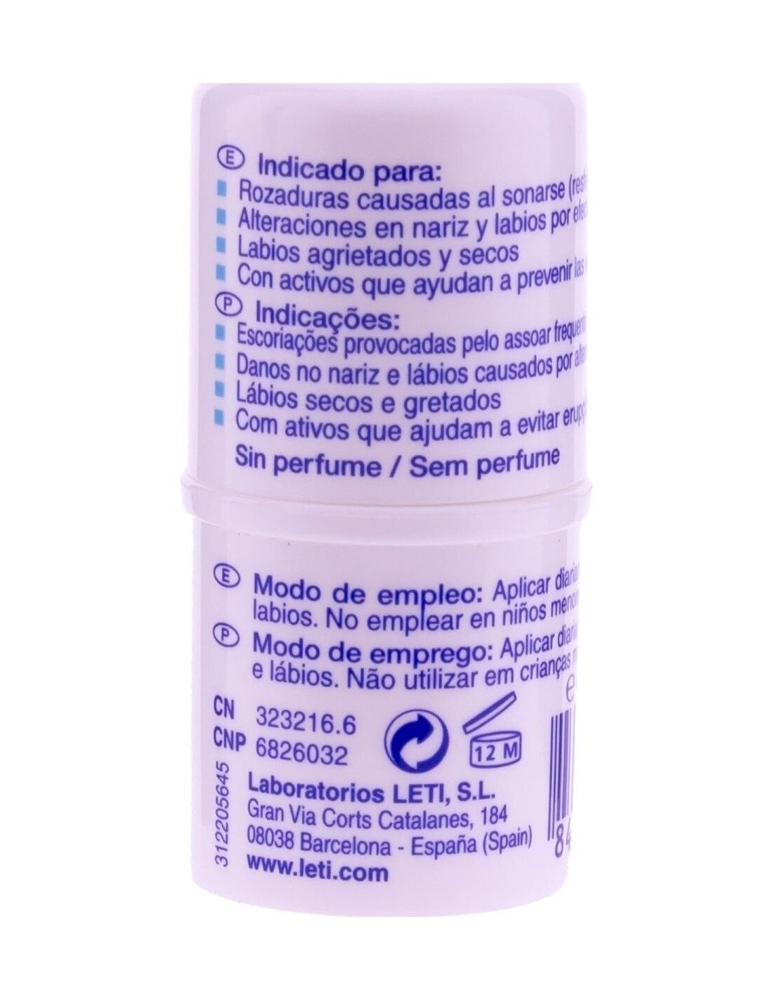 Bálsamo reparador con una fórmula única para el cuidado de nariz y labios durante todo el año. Calma, regenera y repara los labios secos y agrietados así como las irritaciones causadas al sonarse con su acción reparadora intensa, emoliente, hidratante y protectora. Nutre la piel reduciendo la tirantez y grietas de los labios y protege contra las agresiones externas. No comedogénico. Producto muy bien tolerado.