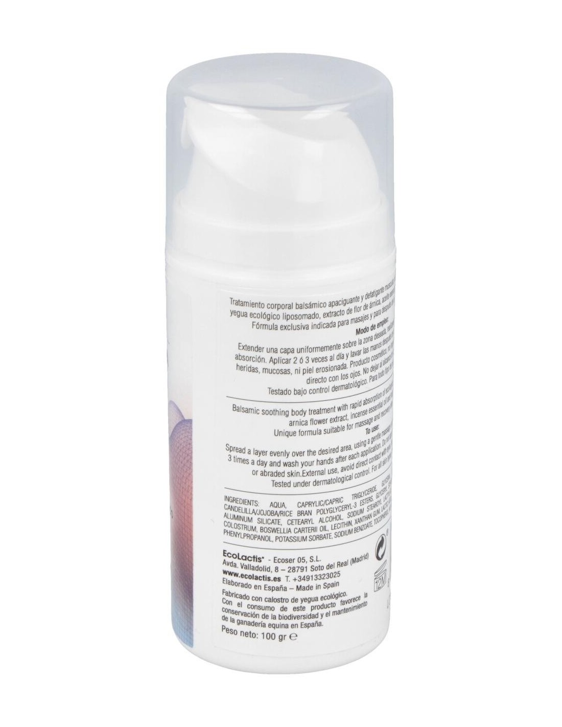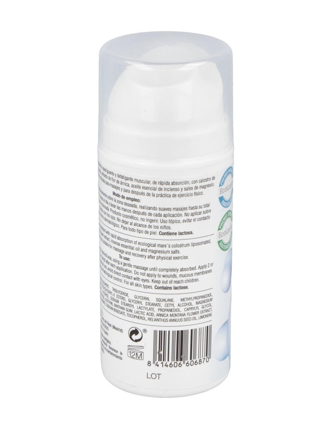 Crema que ayuda a proporcionar alivio frente al dolor muscular, articular, en tendones y huesos. Es un tratamiento regenerativo, defatigante y apaciguante muscular. Está enriquecido con calostro de yegua liposomado, extracto de flor de árnica, aceite esencial de incienso y sales de magnesio. Tiene una textura rica y cremosa que al contacto con la piel libera paulatinamente todos sus principios activos naturales regenerativos para los músculos, tendones, articulaciones y huesos, además de ser de rápida absorción. Testado bajo control dermatológico. Indicado para todo tipo de piel. Contiene lactosa.