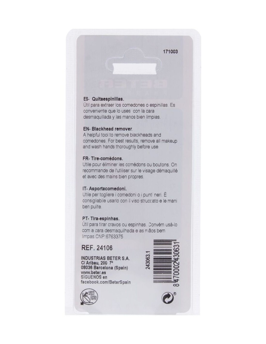 Beter Quitaespinillas cromado mango plástico 1 Unidad es útil para extraer los comedones o espinillas. Es conveniente usarlo con la cara desmaquillada y las manos bien limpias. Tiene un mango de plástico y una punta cromada que lo hacen mucho más agradable al uso.