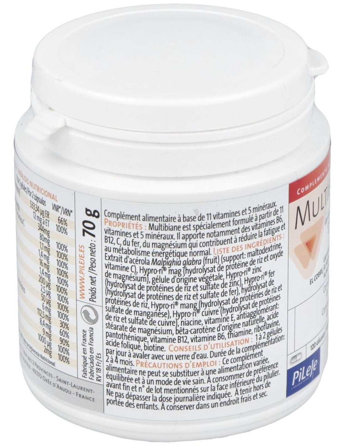 Multibiane es un complemento alimenticio que aporta 11 vitaminas y minerales para contribuir al funcionamiento óptimo del sistema inmunitario (vitaminas A, B6, B12 y C) y ayuda a la reducción del cansancio (vitaminas C, B6, B12, folatos, niacina y magnesio).