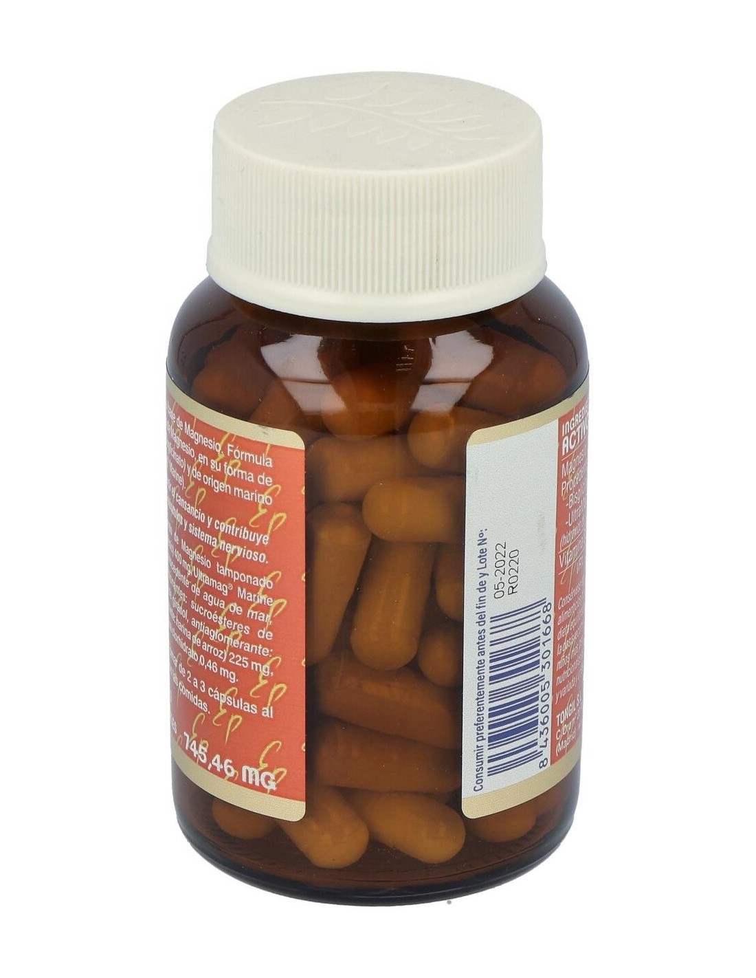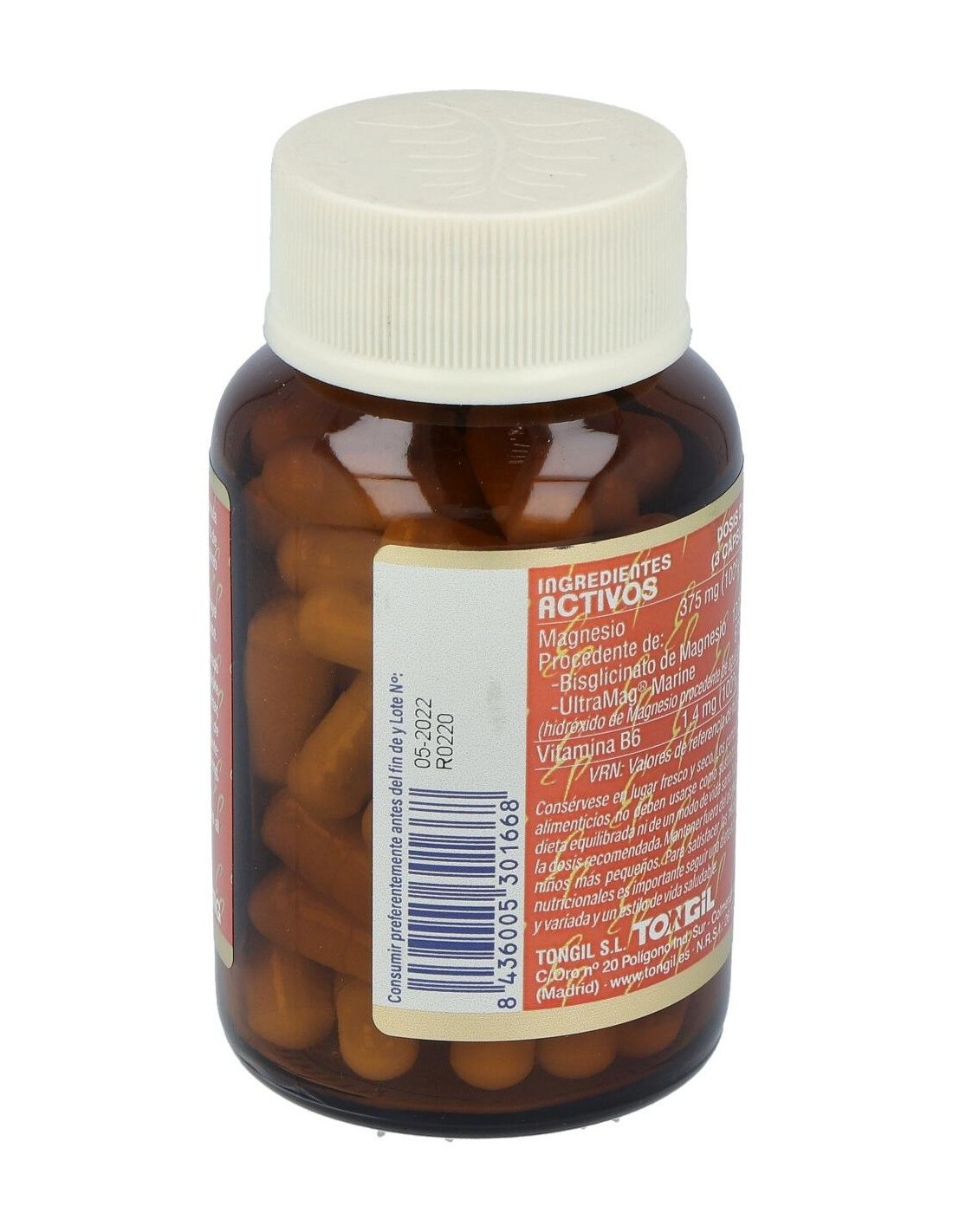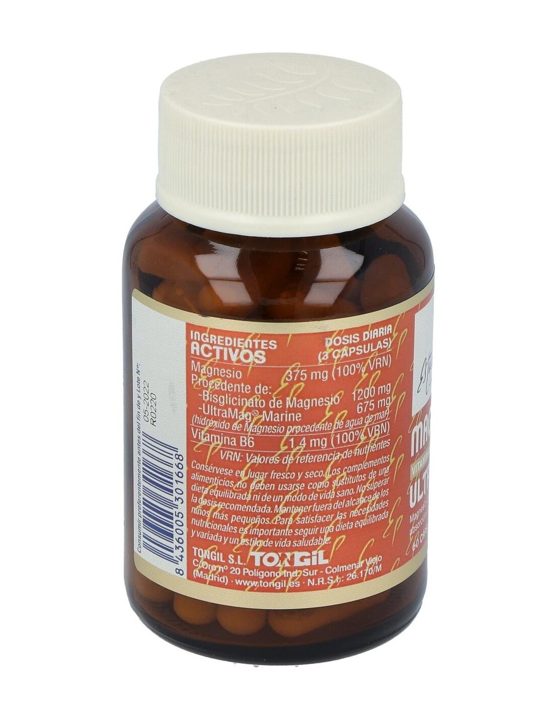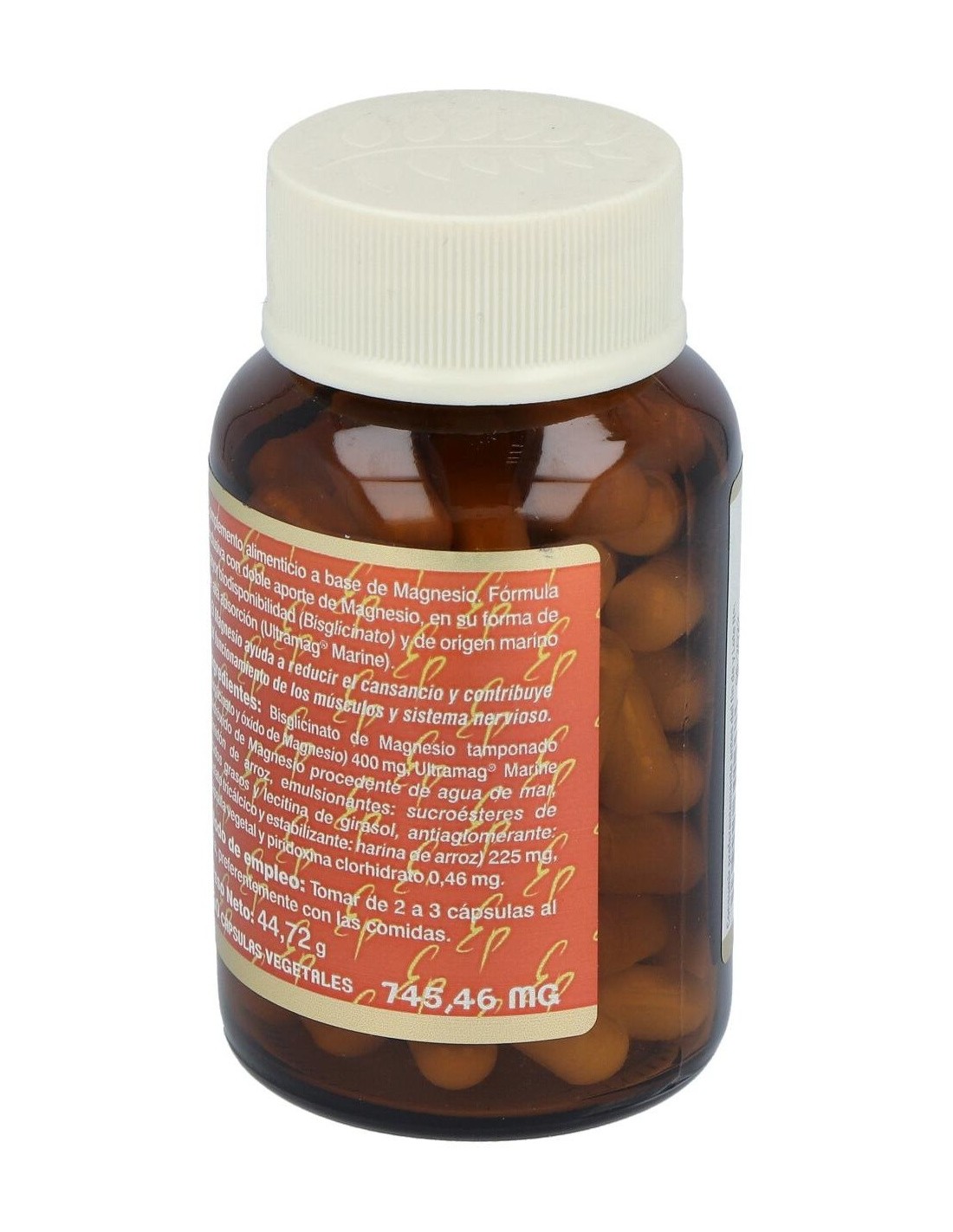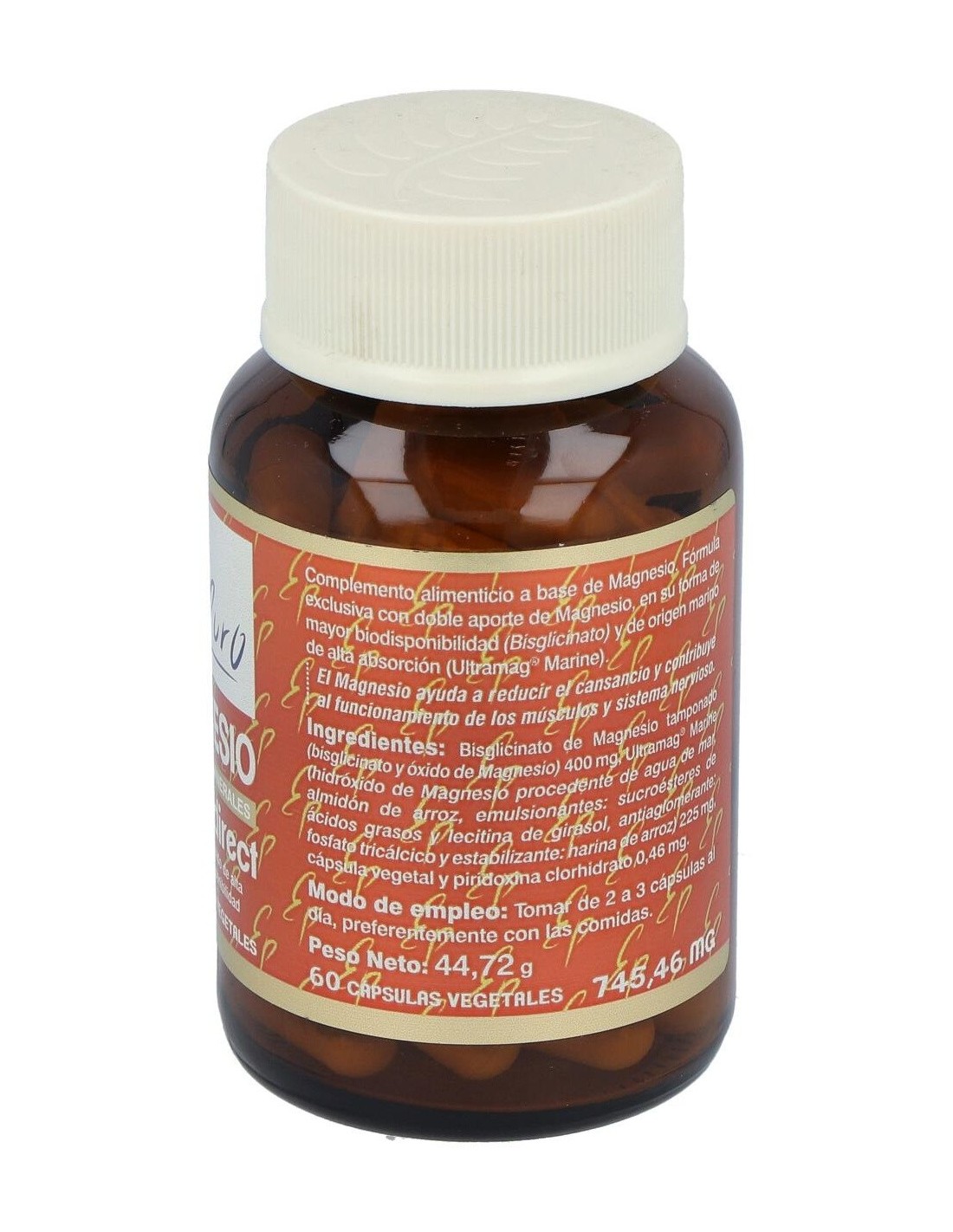 Bisglicinato de Magnesio tamponado (bisglicinato y óxido de Magnesio) 400 mg, Ultramag® Marine (hidróxido de Magnesio procedente de agua de mar, almidón de arroz, emulsionantes: sucroésteres de ácidos grasos y lecitina de girasol, antiaglomerante: fosfato tricálcico y estabilizante: harina de arroz) 225 mg, cápsula vegetal y piridoxina clorhidrato 0,46 mg