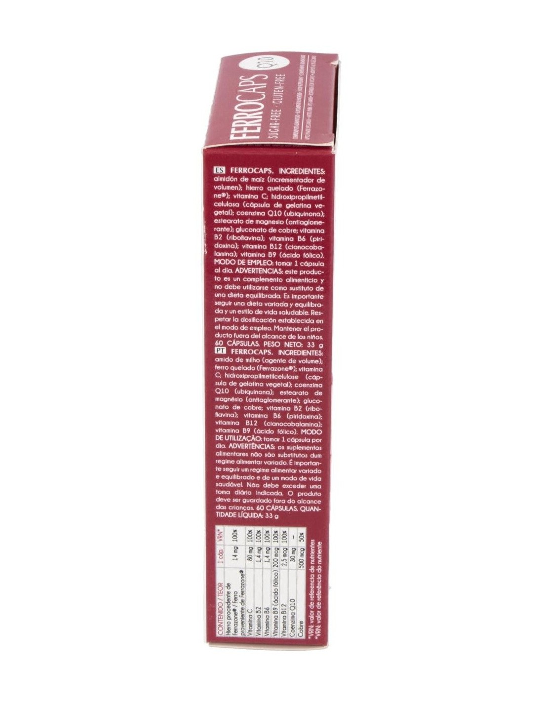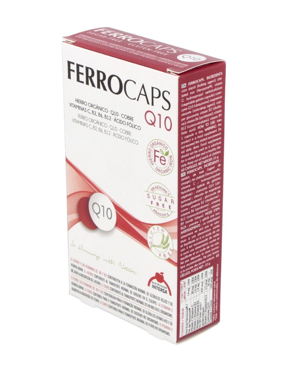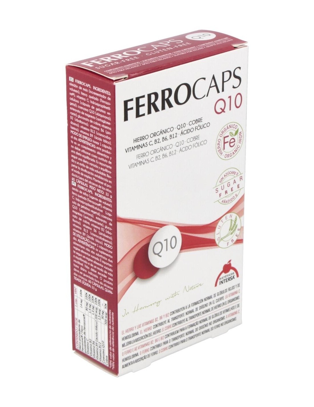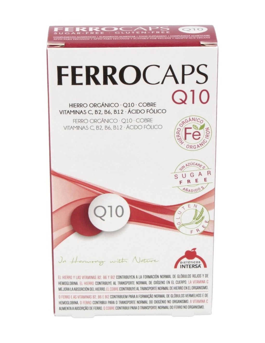 Suplemento alimenticio para mejorar la salud corporal. Aporta hierro, ácido fólico, vitaminas C, B2, B6 y B12 y coenzima Q10. La vitamina C ayuda a mejorar la absorción del hierro y tiene propiedades antioxidantes. El hierro favorece la formación de glóbulos rojos y hemoglobina de la sangre. Con folatos que ayudan a disminuir el cansancio y la fatiga. Sin sabor metálico.