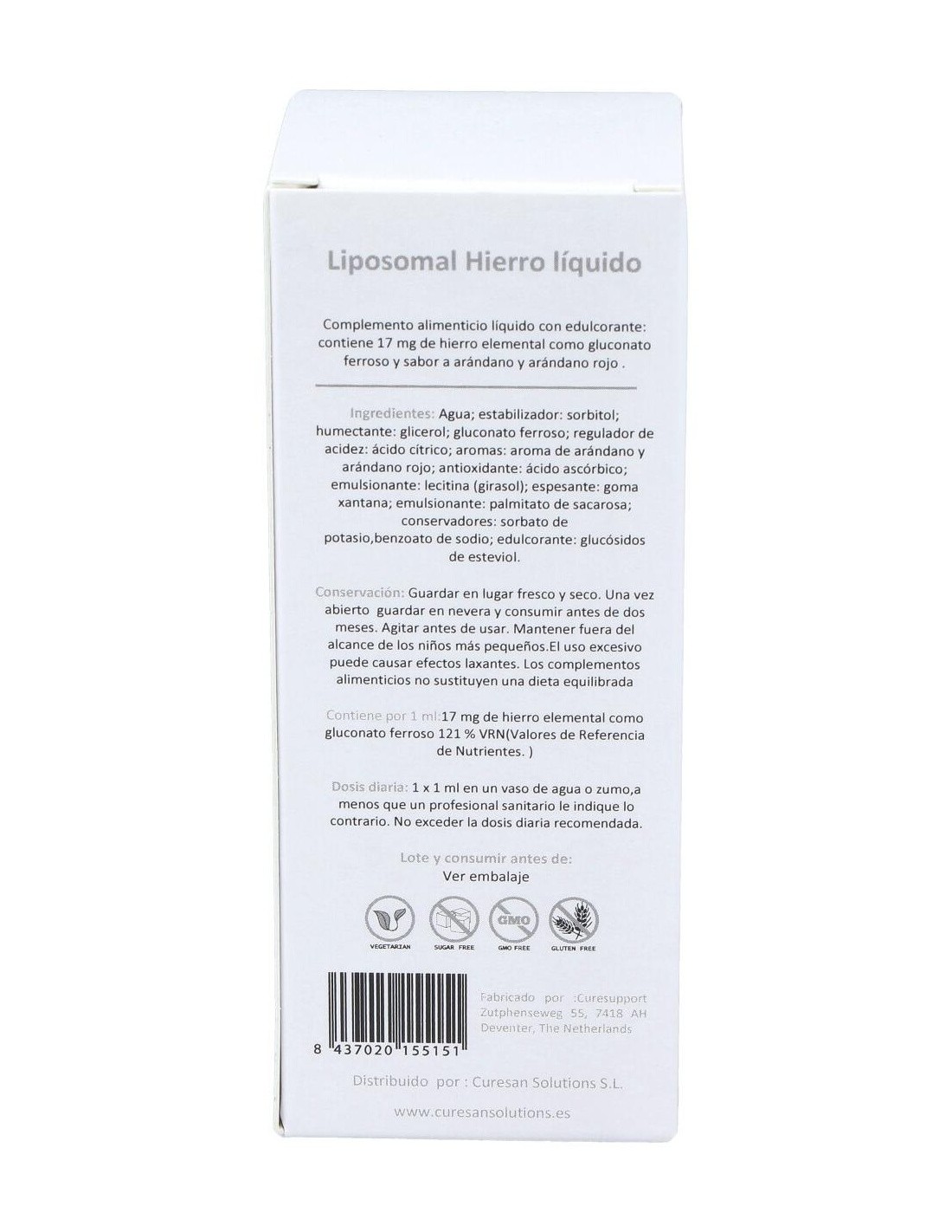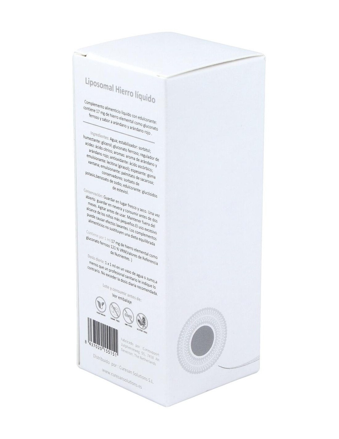 El hierro liposomado por su mecanismo de absorción no depende de los receptores intestinales para su absorción, mejorando la biodisponibilidad y la tolerabilidad del hierro. Sabor a arándanos.