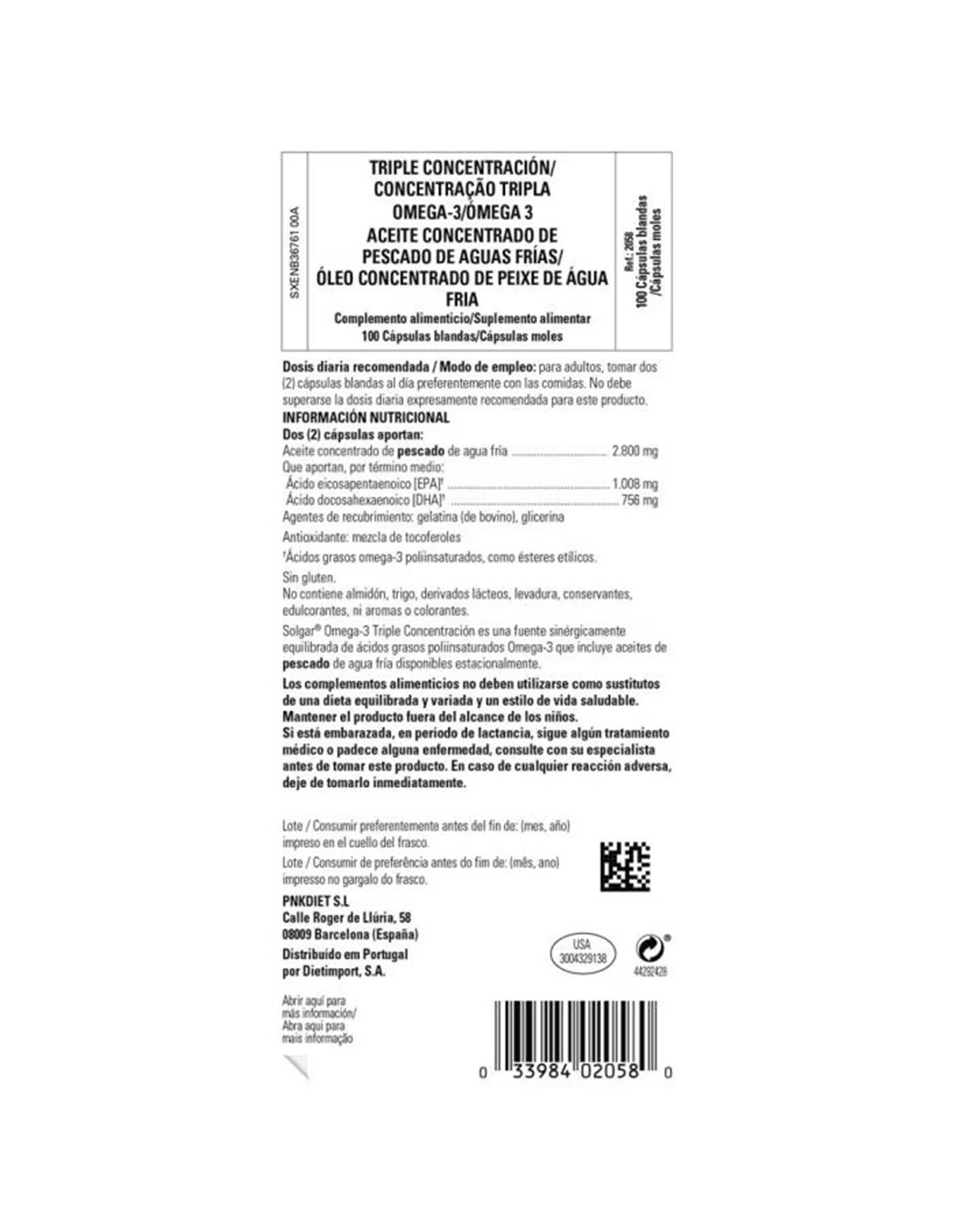 Solgar Omega-3 Triple Concentración 100 perlas es un complemento alimenticio a base de ácidos grasos Omega-3 que contribuyen a mantener unos niveles normales de colesterol, manteniendo así un corazón sano. Es un buen regulador de la presión arterial. Formulado con una combinación de omega-3, EPA (ácido eicosapentanoico) y DHA (ácido docosahexanoico) que se encuentran en pescado azul como la sardina, la caballa o el salmón. Apto para cualquier persona que quiera mantener un buen nivel del colesterol.