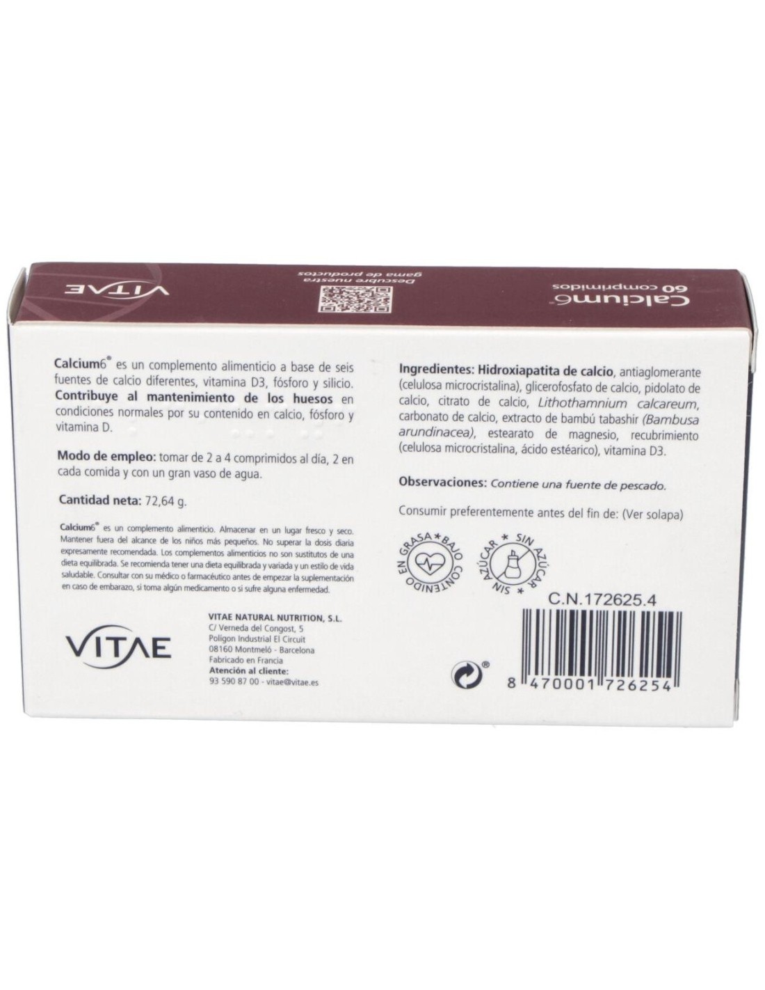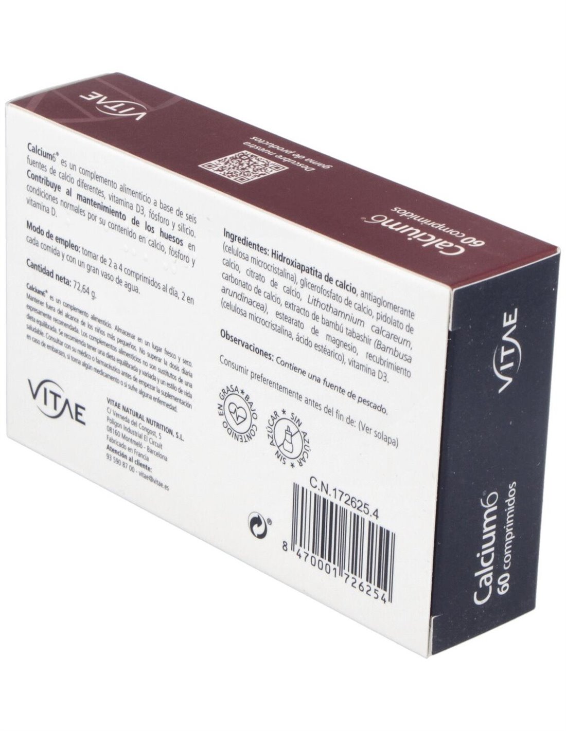 Vitae Calcium6 60 Comprimidos es un complemento alimenticio a base de sales de calcio, fósforo, vitamina D3 y extracto seco de bambú. Ayuda a que los huesos reciban un aporte de calcio y se mantengan sanos y fuertes. El calcio es necesario para el mantenimiento de los huesos en condiciones normales y contribuye al funcionamiento normal de los músculos. Por otro lado, la vitamina D contribuye a la absorción y uso del calcio y el fósforo, meintras que el fósforo y la vitamina D contribuyen al mantenimiento de los huesos en condiciones normales.