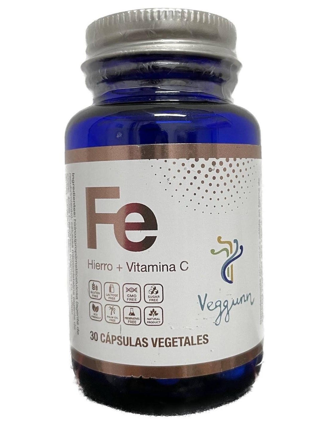 El hierro es un mineral esencial para una amplia variedad de funciones metabólicas en las que está implicado el transporte de oxígeno. El hierro con vitamina C de Veggunn tiene 25 mg de hierro elemental que contribuye a garantizar la necesaria ingesta diaria de entre 8 y 20 mg según necesidades. El producto contiene además vitamina C para que la biodisponibilidad sea óptima. Con certificado vegano.