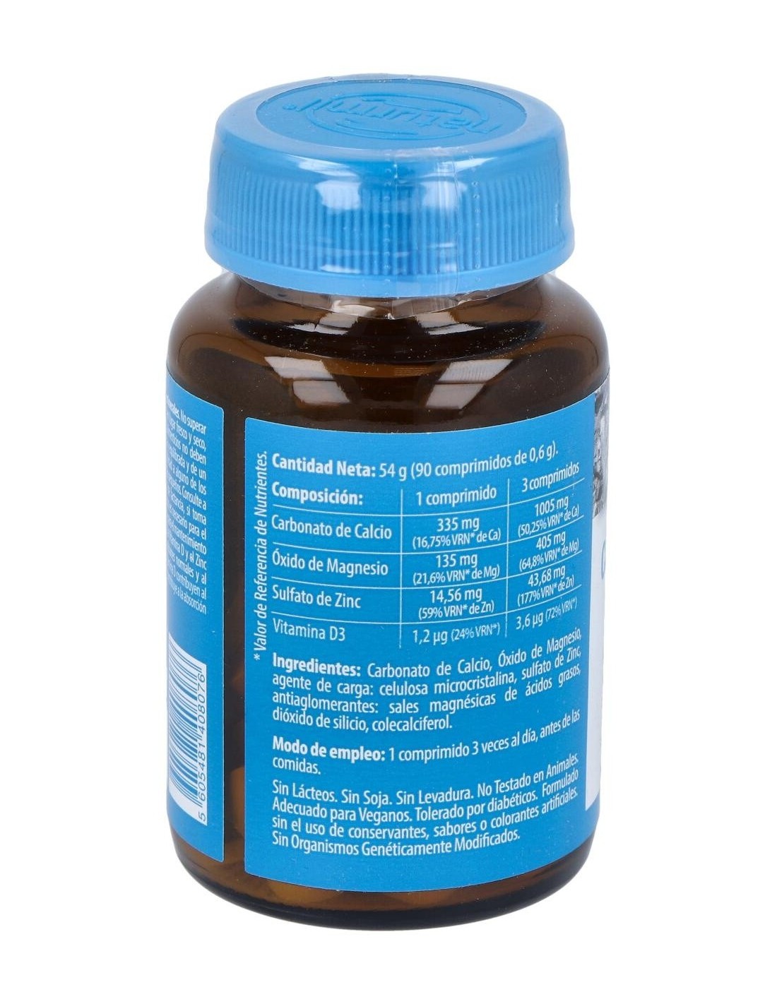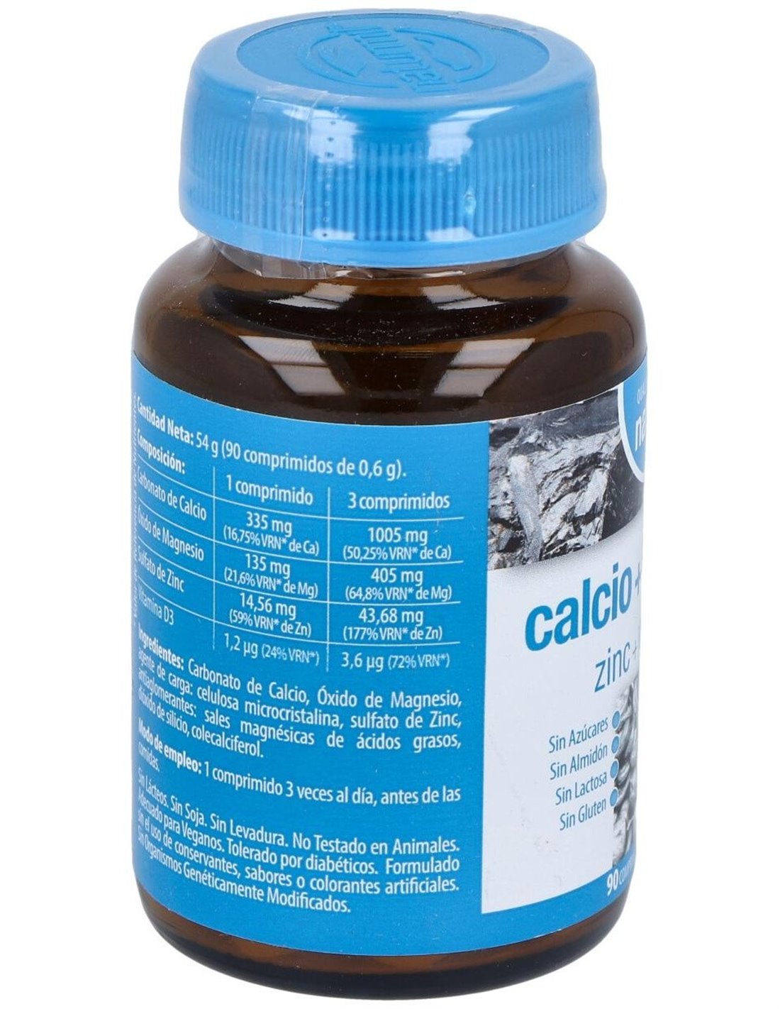 3 comprimidos: Carbonato de Calcio 1005 mg (50,25% VRN* de Ca), Óxido de Magnesio 405 mg (64,8% VRN* de Mg), Sulfato de Zinc 43,68 mg (177% VRN* de Zn), Vitamina D3 3,6 µg (72% VRN*).