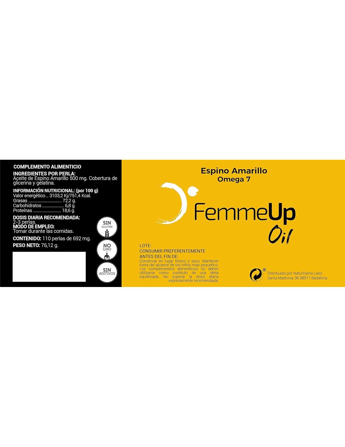 FemmeUp Oil es un complemento alimenticio natural para la piel y las mucosas, a base de espino amarillo 100% natural que puede favorecer la lubricación. El espino amarillo es una planta rica en ácidos grasos esenciales omega 3 6 y 7 y con vitaminas A y E, las cuales ayudan a mantener la piel en condiciones normales por su aporte de antioxidantes.