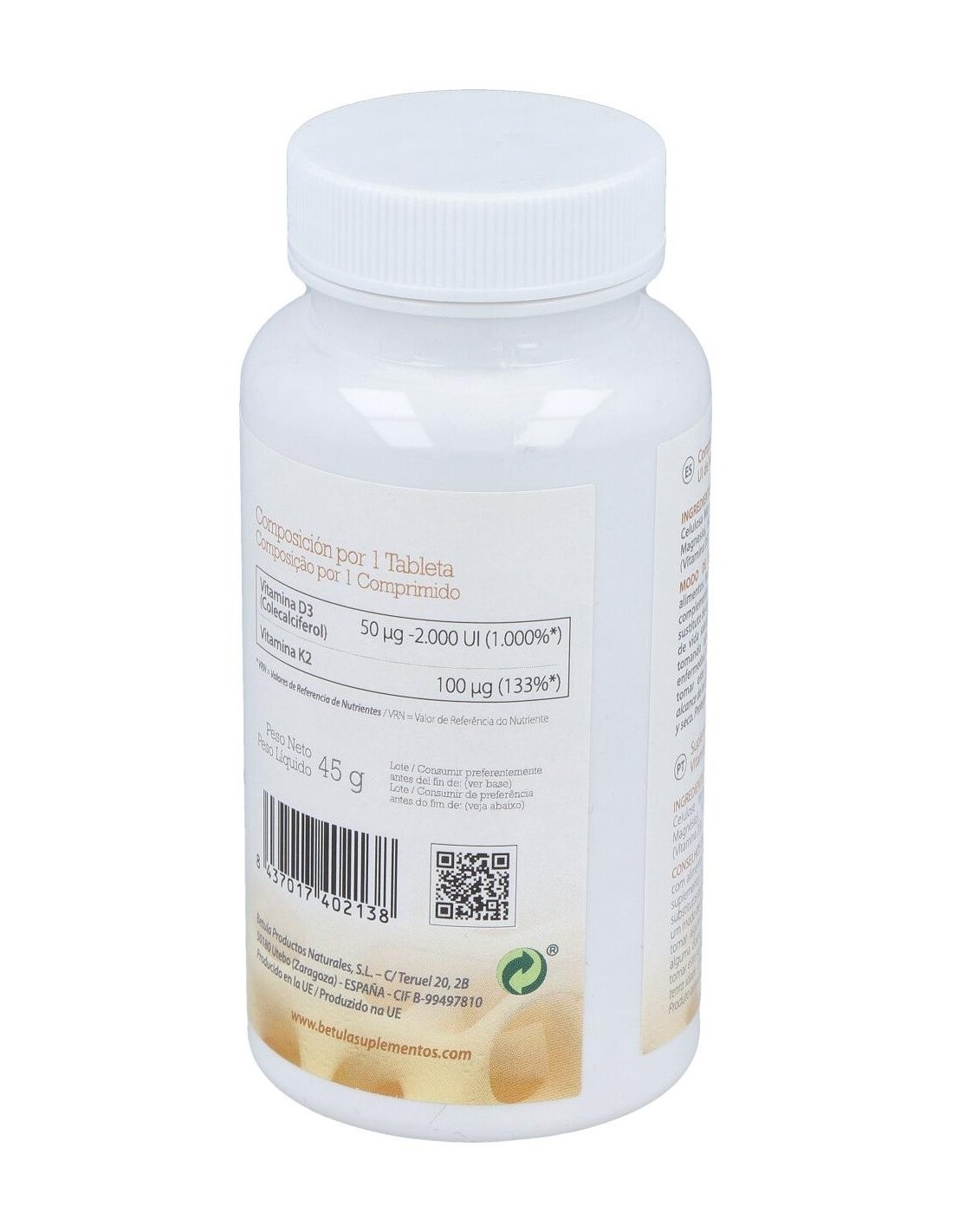 Agentes de Carga (Fosfato Dicálcico, Celulosa Microcristalina), Antiaglomerante (Estearato de Magnesio), Menaquinona (Vitamina K2) en forma de MK7, Colecalciferol (Vitamina D3).