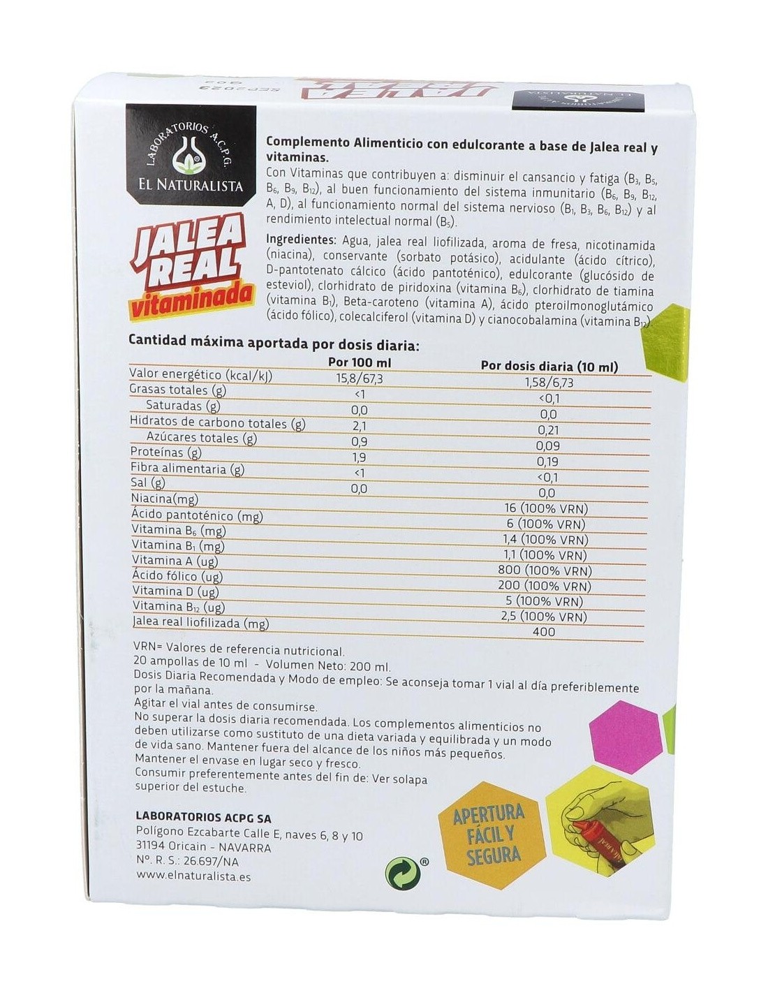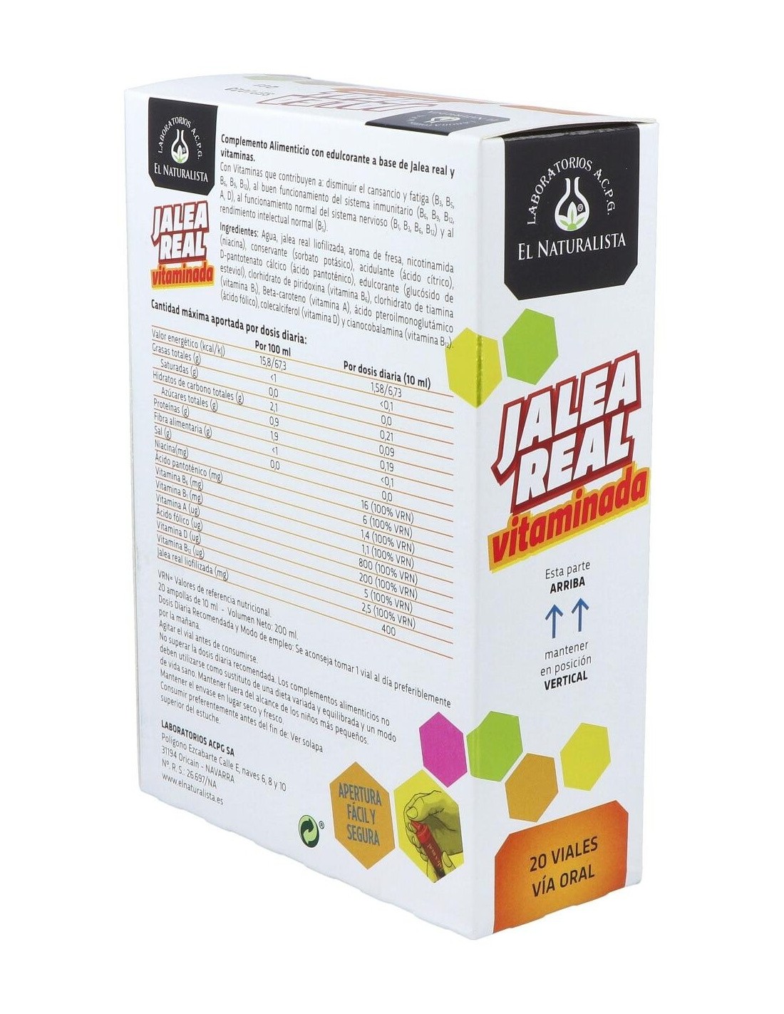 Complemento alimenticio compuesto por Jalea Real liofilizada y 8 Vitaminas: B1, B3, B5, B6, B9, B12, A y D. Puede ser consumido por diabéticos debido a su bajo contenido en azúcares totales (0,09 g/vial).