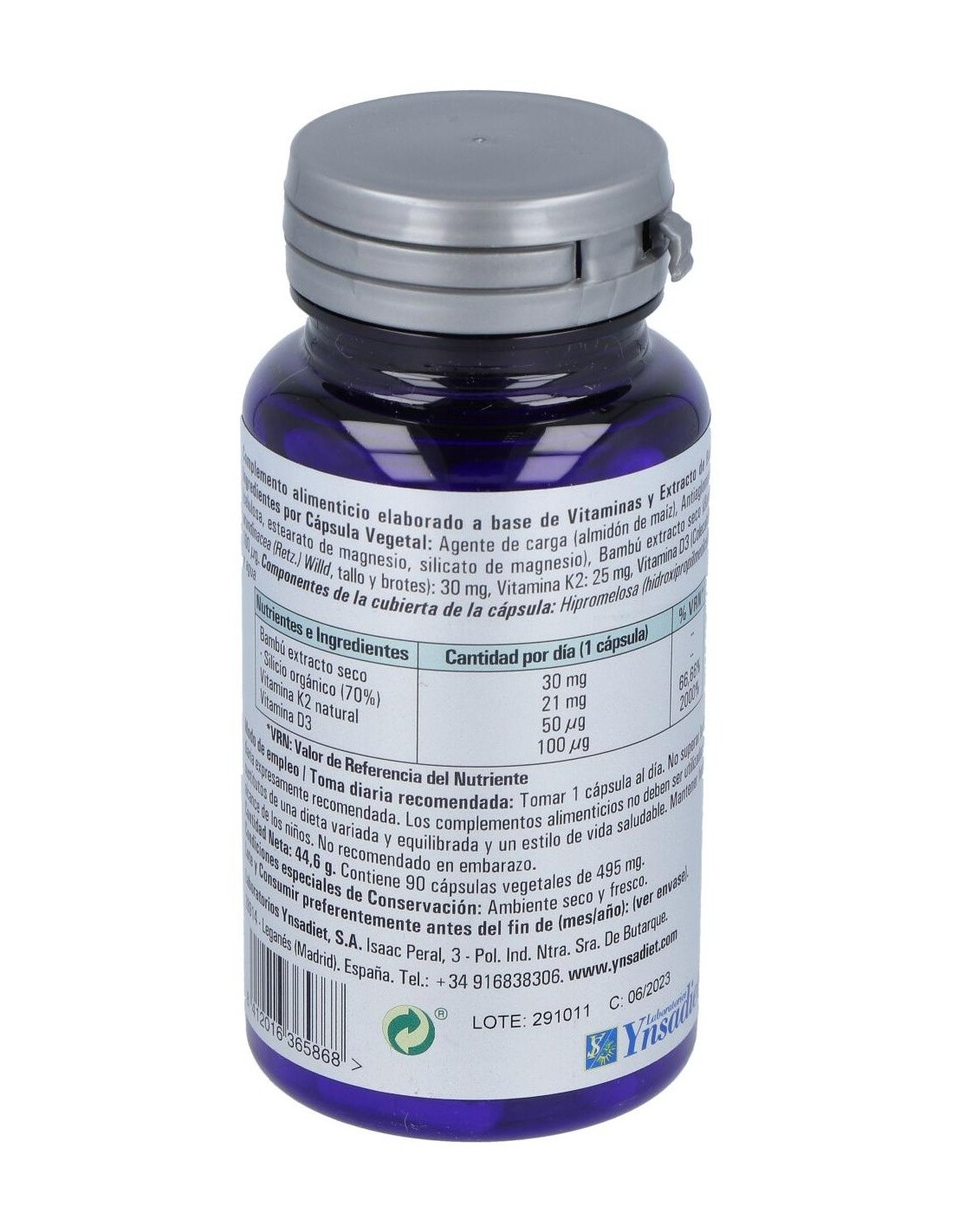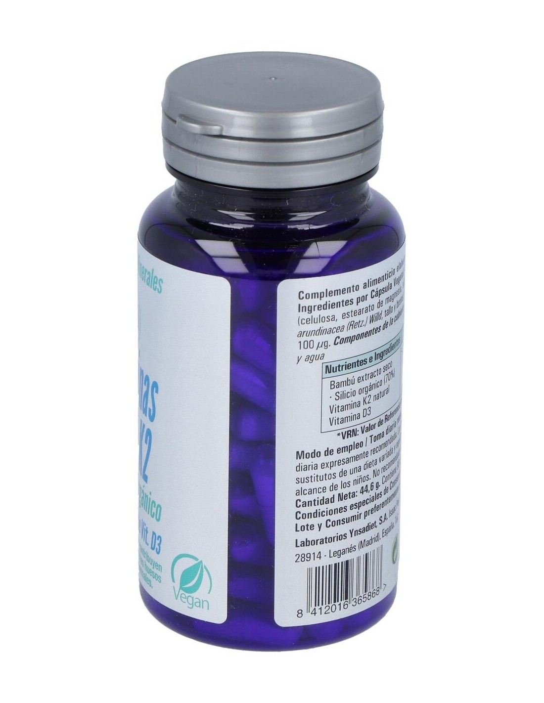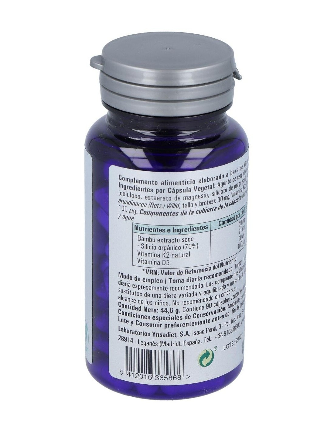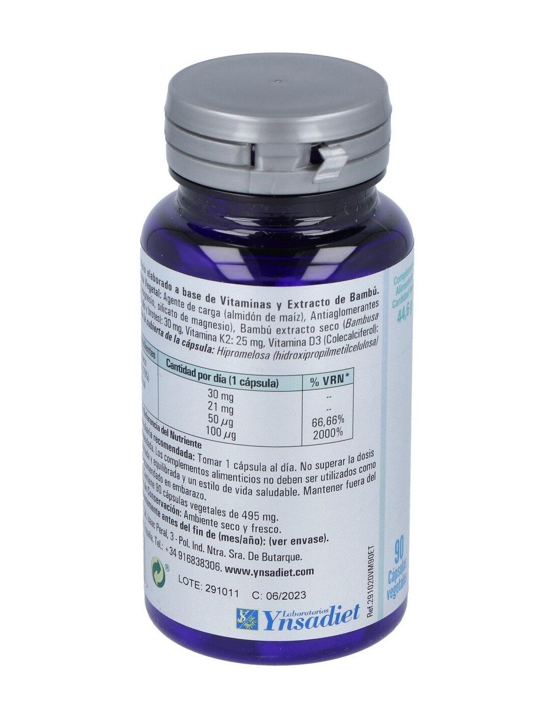 1 Cápsula aporta: Vitamina D3 (100 µg), Vitamina K2 (50 µg), Bambu (30 mg), Silicio orgánico (21 mg), Vitamina D3 / Colecalciferol, Vitamina K2 / Menaquinona.