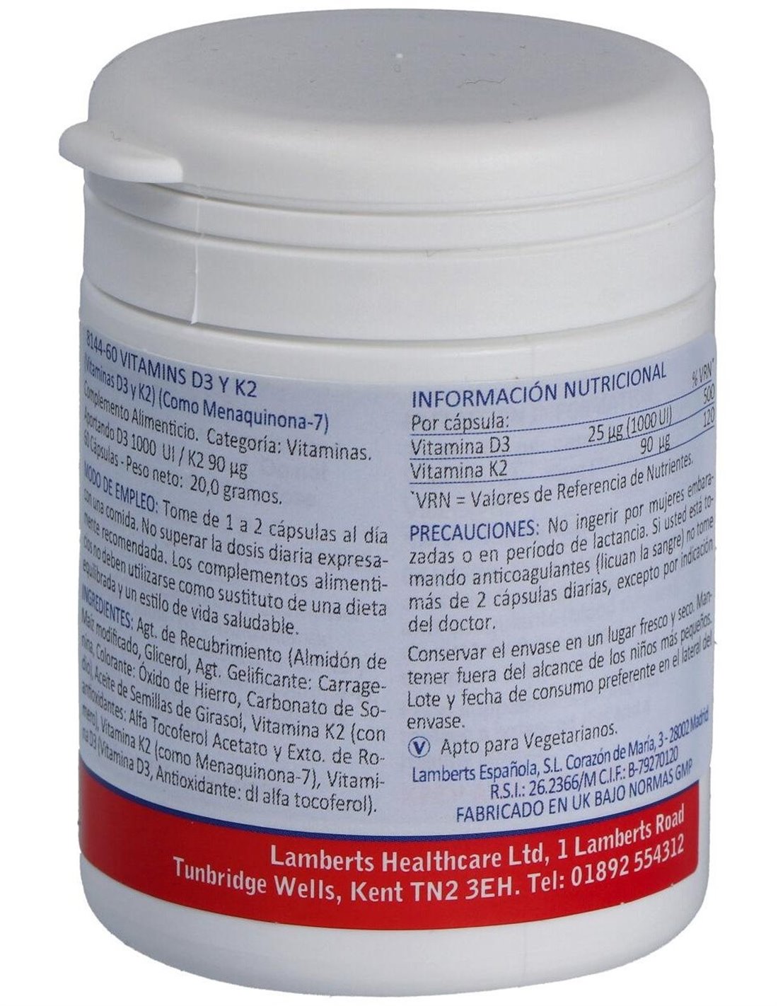 Este producto proporciona 1000 UI (25µg) de vitamina D3 natural (comom colecalciferol), así como 90 µg de vitamina K2 en forma de Menaquinona (MK-7) en pequeñas cápsulas fáciles de tragar. Esta sinergia contribuye al mantenimiento normal de los huesos y a la coagulación normal de la sangre. Apto para vegetarianos.