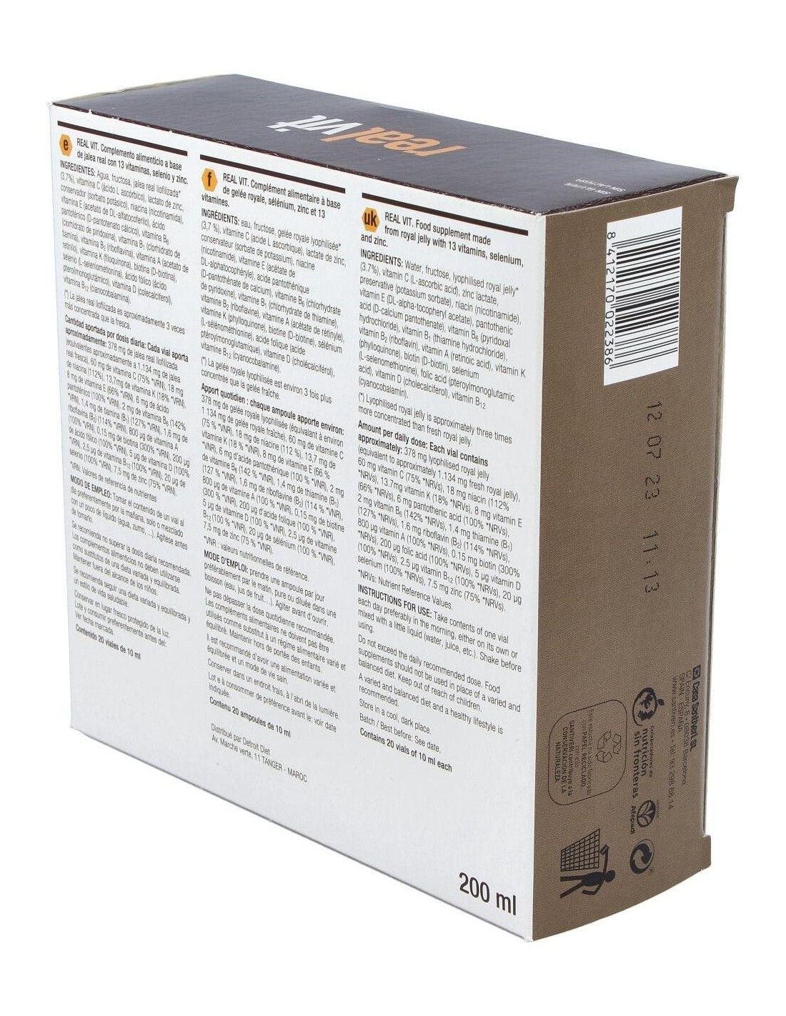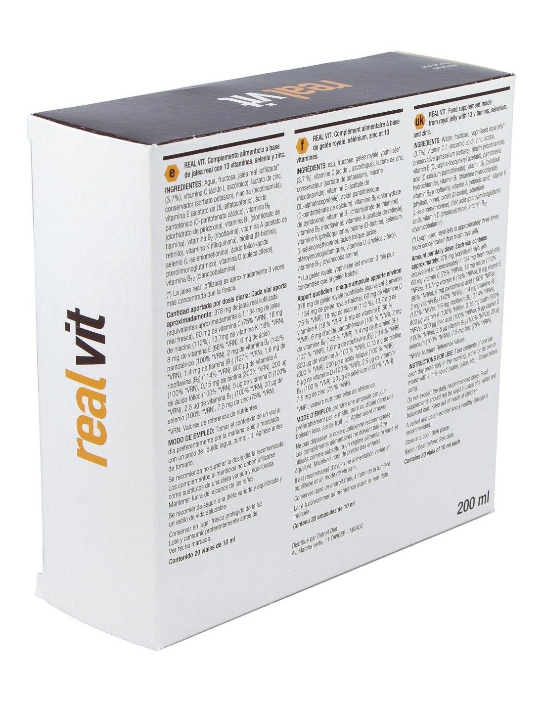 Agua, Fructosa, Jalea real liofilizada (3,7%), Vitamina C (Ácido L Ascórbico), Lactato de Zinc, Conservador (Sorbato Potásico), Niacina (Nicotinamida), Vitamina E (Acetato de DL-alfatocoferilo), Ácido Pantoténico (D-Pantotenato Cálcico), Vitamina B6 (Clorhidrato de Pridoxina), Vitamina B1 (Clorhidrato de Tiamina), Vitamina B2 (Riboflavina), Vitamina A (Acetato de Retinilo), Ácido Fólico (Ácido Pteroilmonoglutámico), Vitamina D (Colecalciferol), Vitamina B12 (Cianocobalamina).