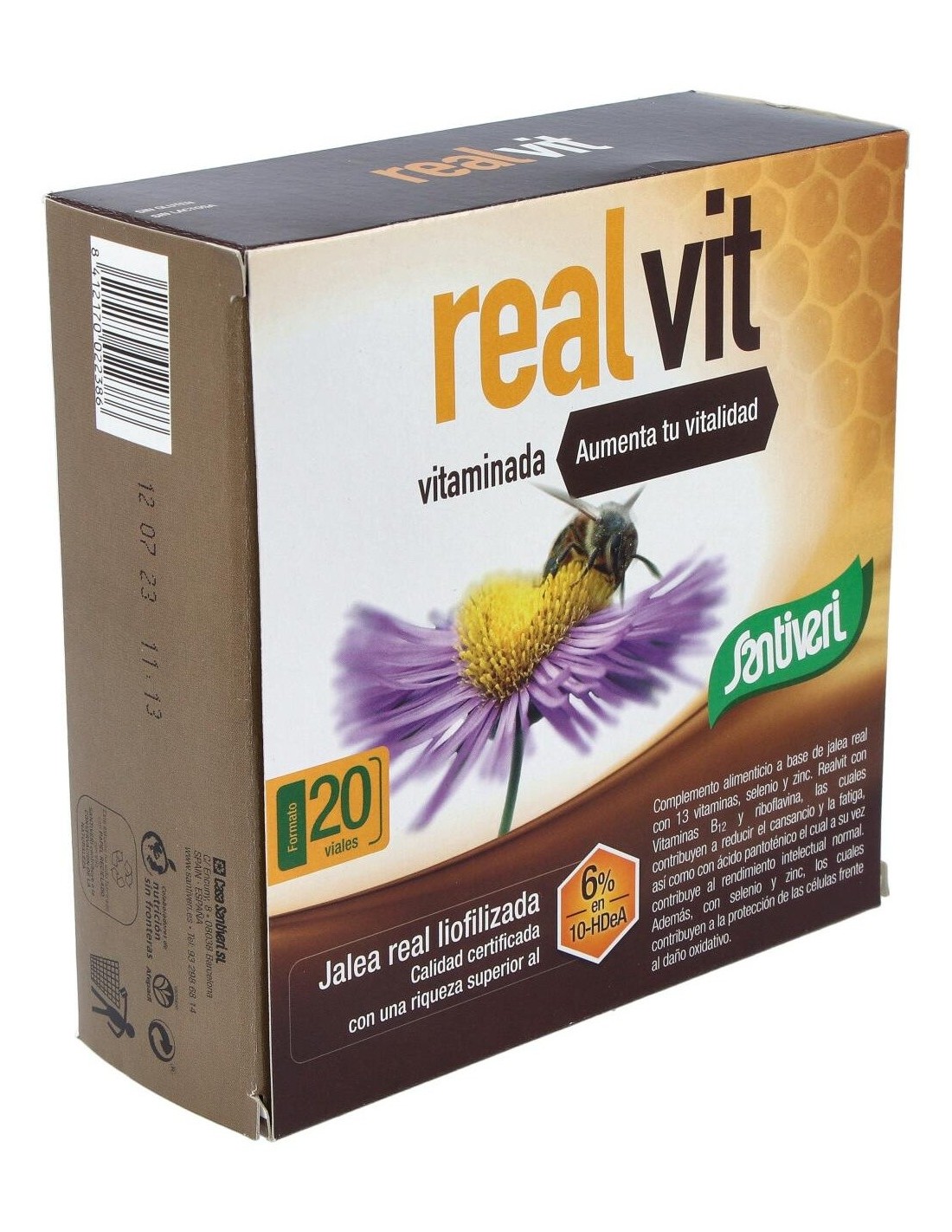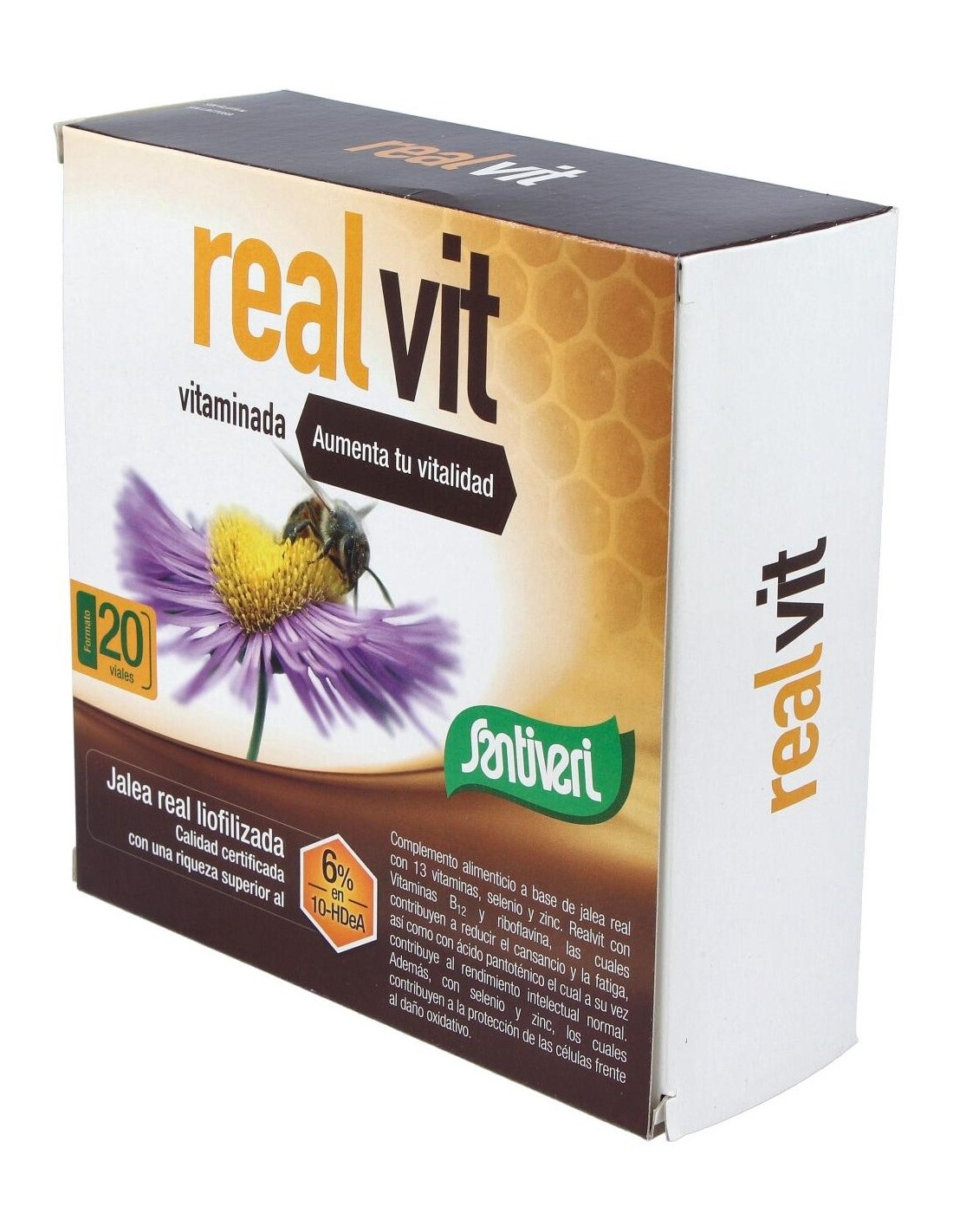Complemento alimenticio realizado a base de jalea real. Se recomienda para aquellas situaciones en las que se necesita una aportación extra de energía y vitalidad. La jalea real de Santiveri Realvit es liofilizada, es decir, tres veces más concentrada que la jalea fresca. Además, cada cápsula aporta 13 vitaminas y dos minerales, selenio y zinc. Todos estos ingredientes te ayudan a reducir la fatiga y el cansancio físico, y favorecen tu rendimiento intelectual, sobre todo en las épocas más exigentes de exámenes o trabajo intenso. Se puede tomar también en los cambios de estación y otros momentos en que necesitas estimular las defensas naturales. Asimismo, el producto aporta antioxidantes. Este producto está especialmente indicado para los estudiantes y profesionales sometidos a un alto nivel de estrés, tanto mental como físico, así como para los deportistas.