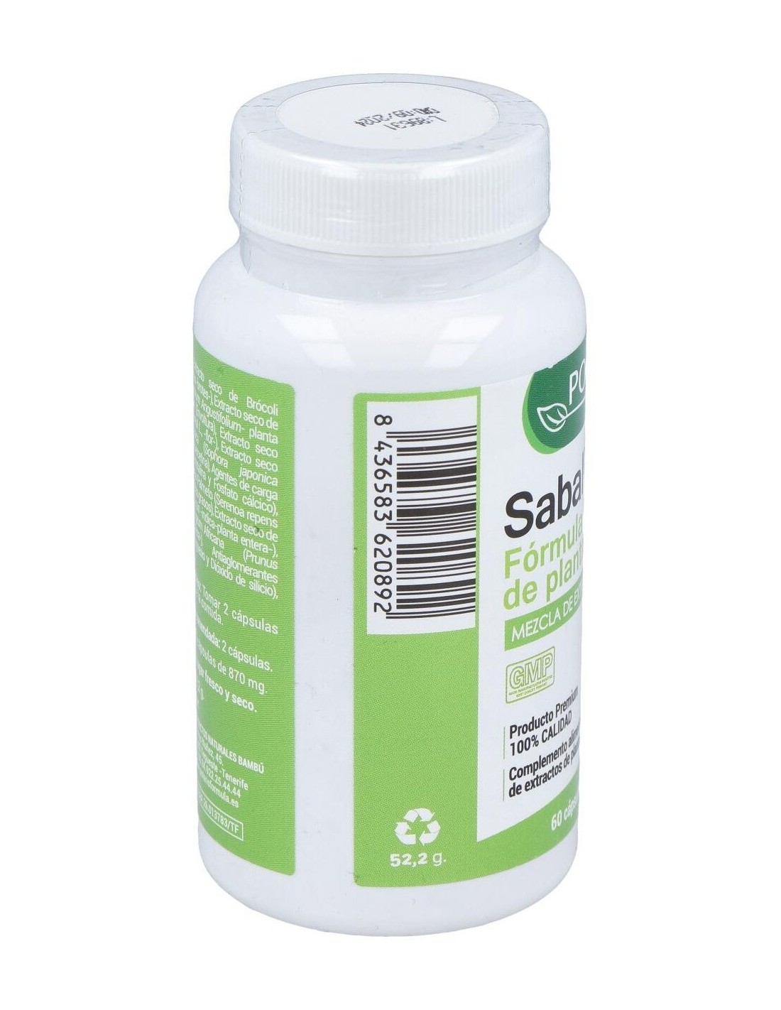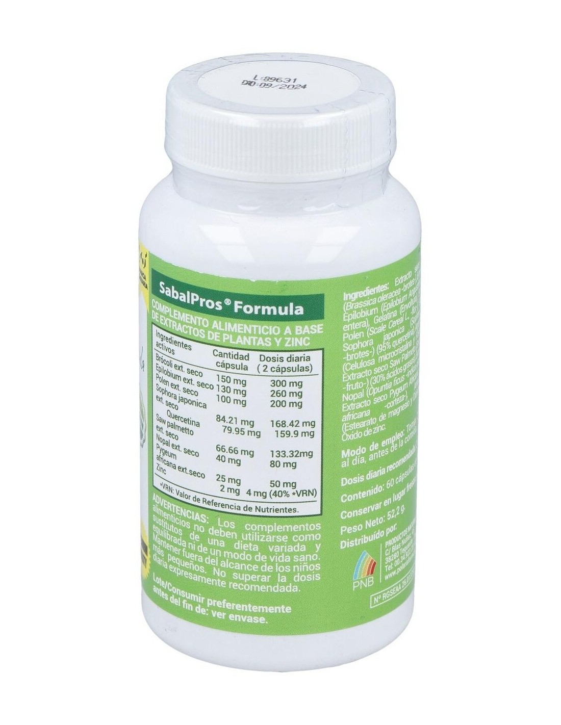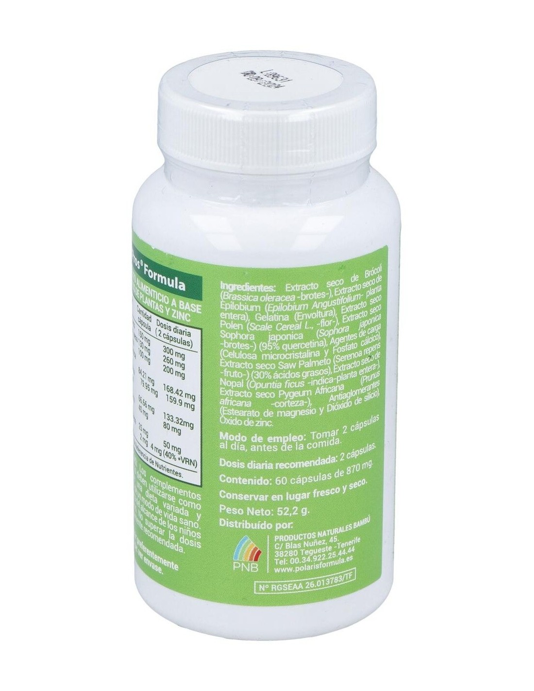 Extracto seco de Brócoli (Brassica oleracea -brotes-), Extracto seco de Epilobium (Epilobium Angustifolum planta entera), Gelatina (Envoltura), Extracto seco Polen (Scale Cereal L., -flor-), Extracto seco Sophora japonica (Sophora japonica-brotes-) (95% quercetina), Agentes de carga (Celulosa microcristalina y Fosfato cálcico), Extracto seco Saw Palmeto (Serenoa repens fruto-) (30% ácidos grasos), Extracto seco de Nopal (Opuntia ficus-indica-planta entera-), Extracto seco Pygeum Africana (Prunus africana -corteza-), Antiaglomerantes (Estearato de magnesio y Dióxido de silicio), Óxido de zinc.