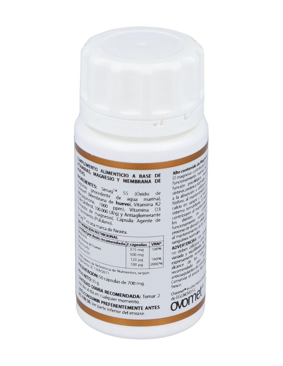 SIMAG 55 (óxido de magnesio procedente de agua marina), 187,5 mg; OVOMET® (membrana interna de huevo, polvo), 150 mg; vitamina K2 (menaquinona), 60 µg; vitamina D3 (colecalciferol), 50 µg. Envoltura: polisacárido de origen vegetal (pululano).