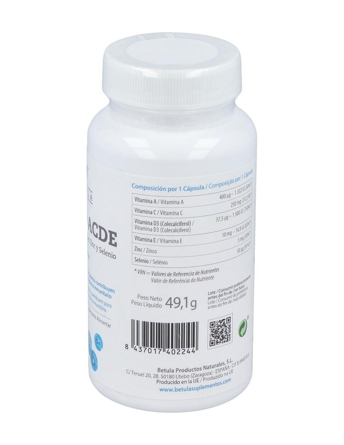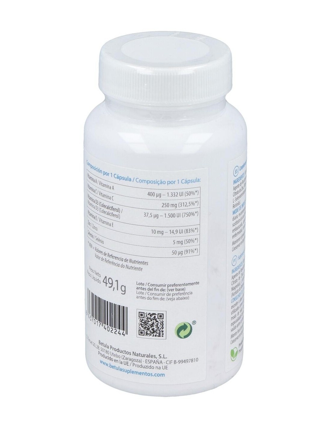 Este complemento una serie de vitaminas como la vitamina A que mantiene la integridad de las mucosas corporales impidiendo el paso de patógenos. La vitamina C que ayuda a que los leucocitos mejoren su eficiencia frente a virus y bacterias. La vitamina D que es inmunoestimulante y reduce incidencia y severidad de enfermedades respiratorias. Modula además la respuesta inflamatoria suavizando la sintomatología de los procesos infecciosos. Finalmente, la vitamina E que potencia inmunidad humoral y celular incrementando la fagocitosis.