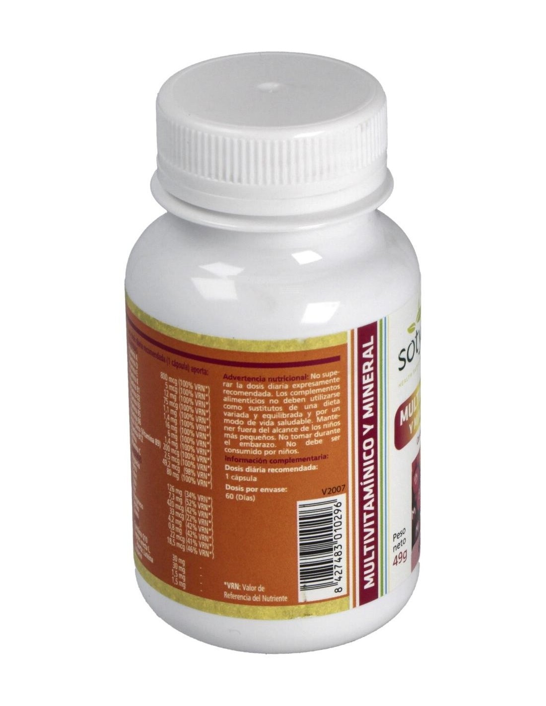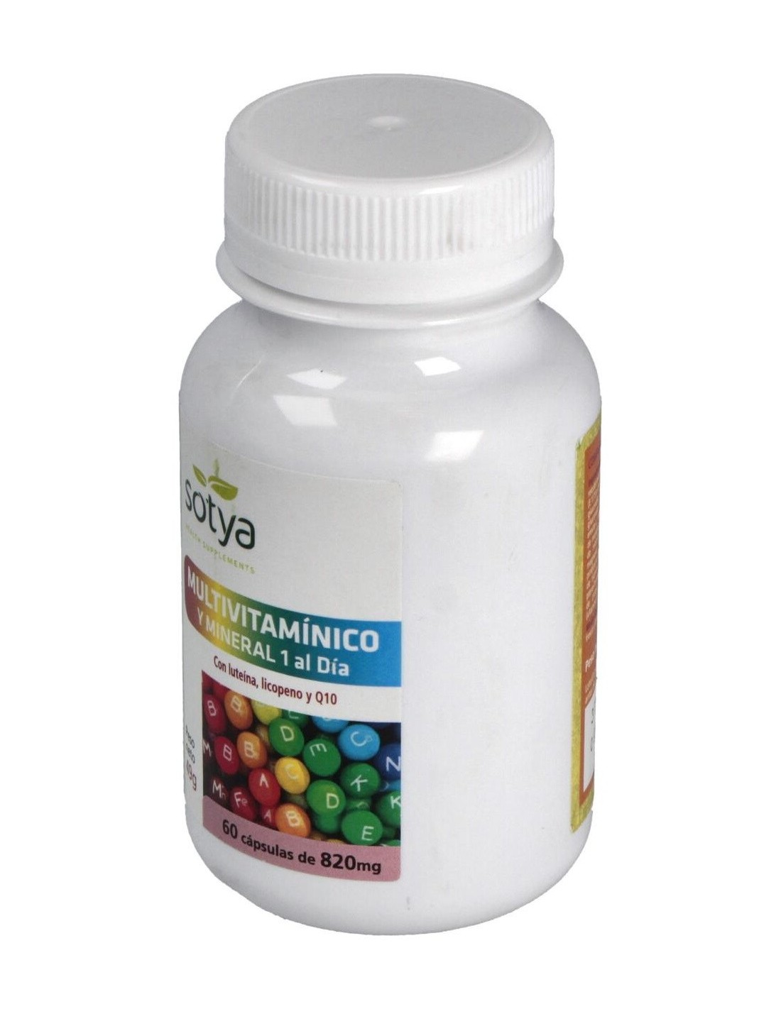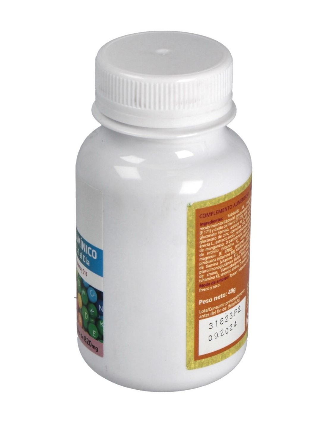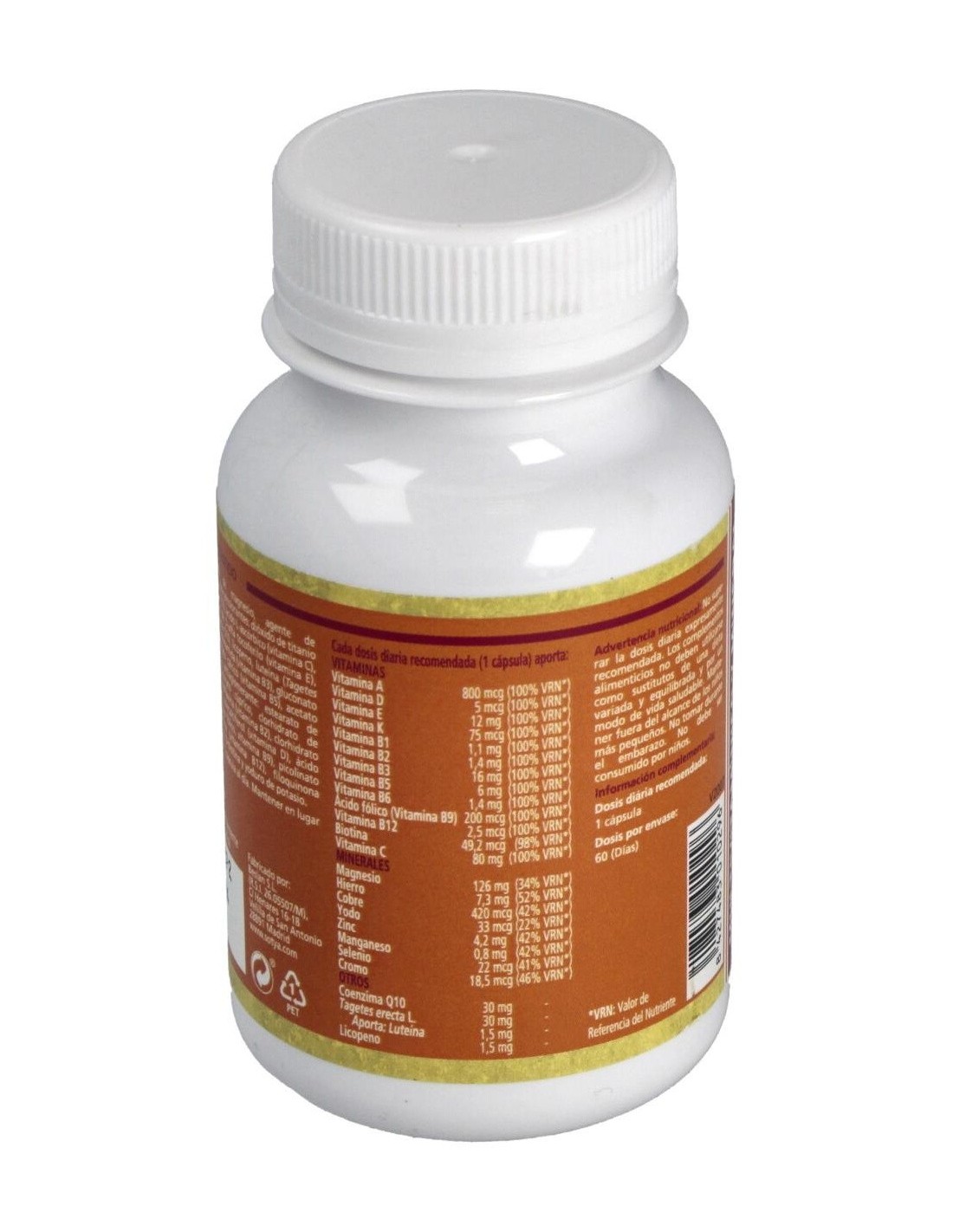 Carbonato de magnesio, ácido l-ascórbico, fibra de bambú (tallo), gluconato ferroso, gluconato de zinc, acetato de D alfa tocoferilo, nicotinamida, colina, gluconato de manganeso, D pantotenato cálcico, coenzima Q10, gluconato cúprico, licopeno, clorhidrato de tiamina, clorhidrato de piridoxina, riboflavina, ácido pteroilmonoglutámico, picolinato de cromo, luteína, acetato de retinilo, selenito sódico, yoduro potásico, filoquinona, D-biotina, colecalciferol, cianocobalamina, celulosa microcristalina E460, sílice E551, estearato de magnesio E470b, gelatina, colorantes E171 y E172.