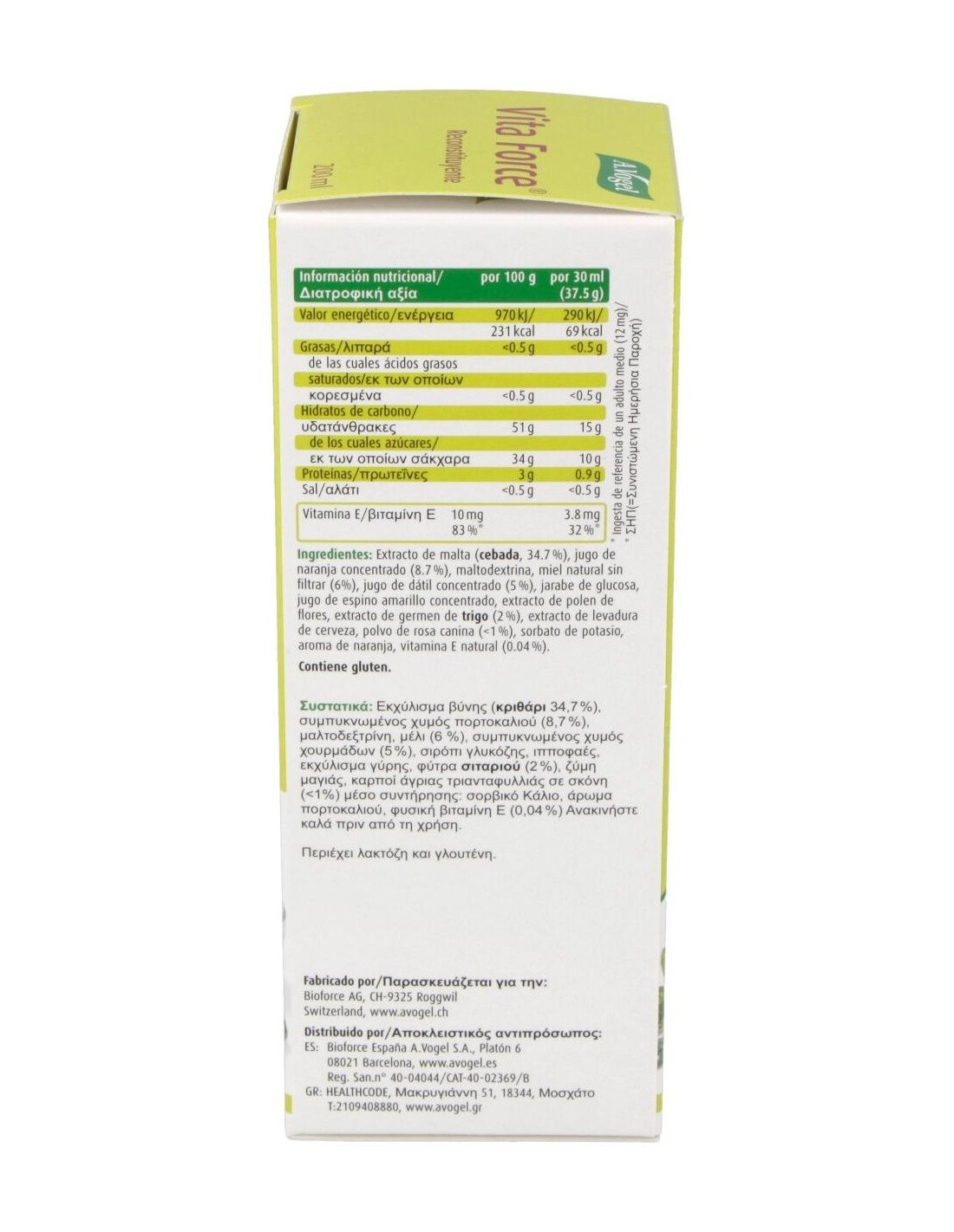 Extracto de malta (33,5%), jugo concentrado de naranja, maltodextrina, miel pura de abeja, jugo concentrado de dátil, jarabe de glucosa, jugo concentrado de espino amarillo, extracto de polen de flores, extracto de germen de trigo, durian (fruto tropical), extracto de levadura de cerveza, rosa canina en polvo, aroma natural de naranja, vitamina E natural (0,01 %).