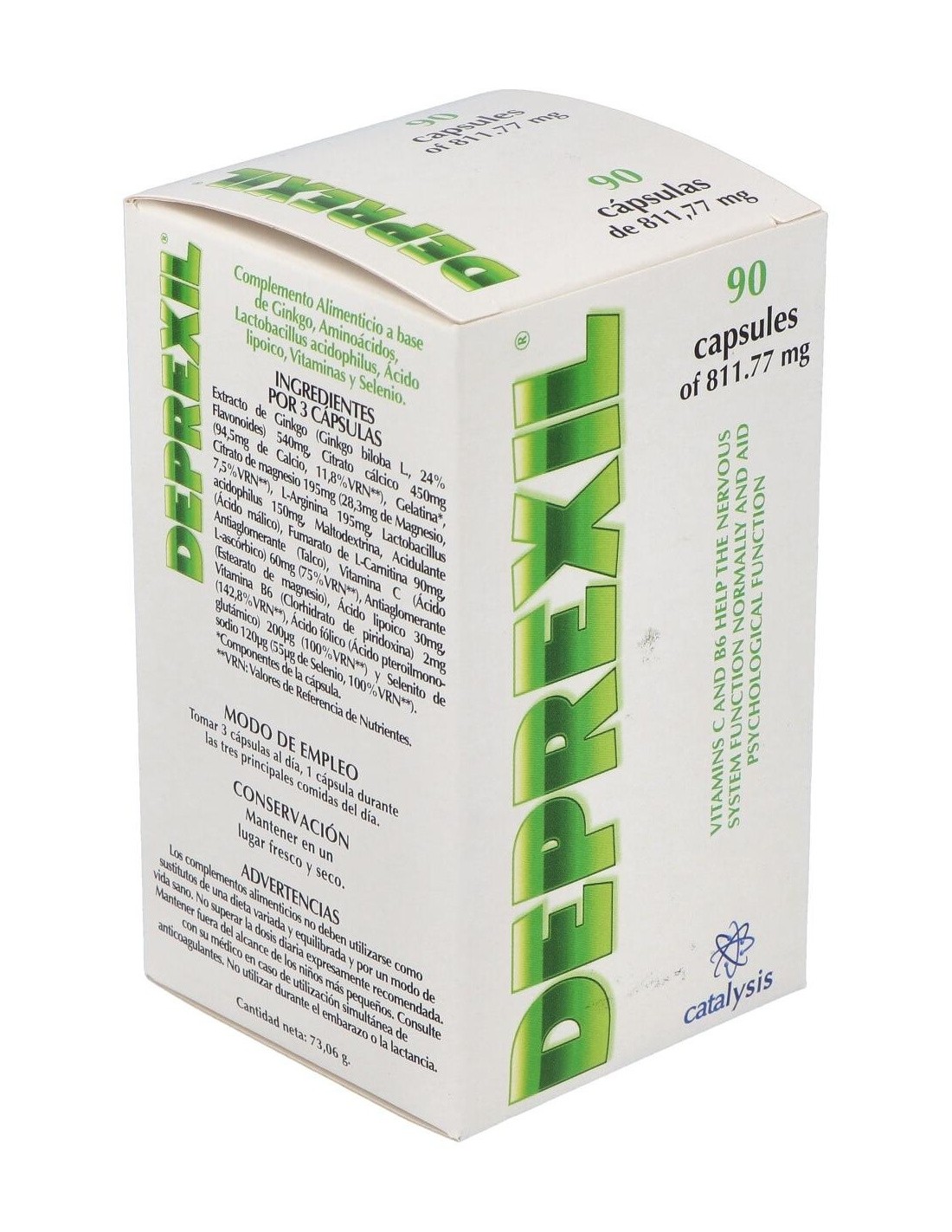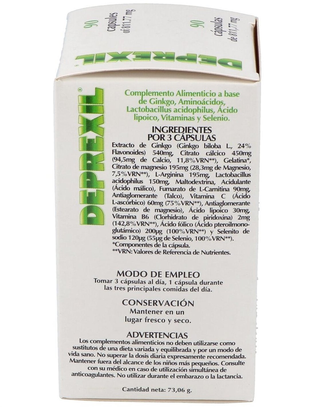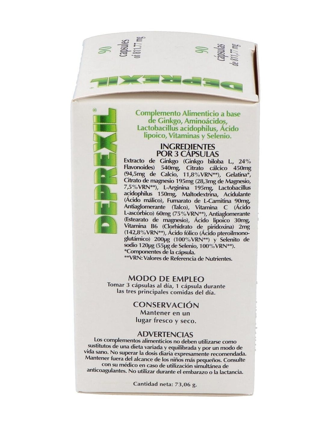 Complemento alimenticio formulado para tratar los estados depresivos leves y moderados asociados a la edad. La rica composición contiene Ginkgo, Citrato cálcico, Citrato de magnesio, L-Arginina, Lactobacillus Acidophilus, L-Carnitina fumarato, Vitamina C, Ácido lipoico, Vitamina B6, Ácido fólico , Selenito sódico, Acidulante (Ácido málico) y envoltura de Gelatina.