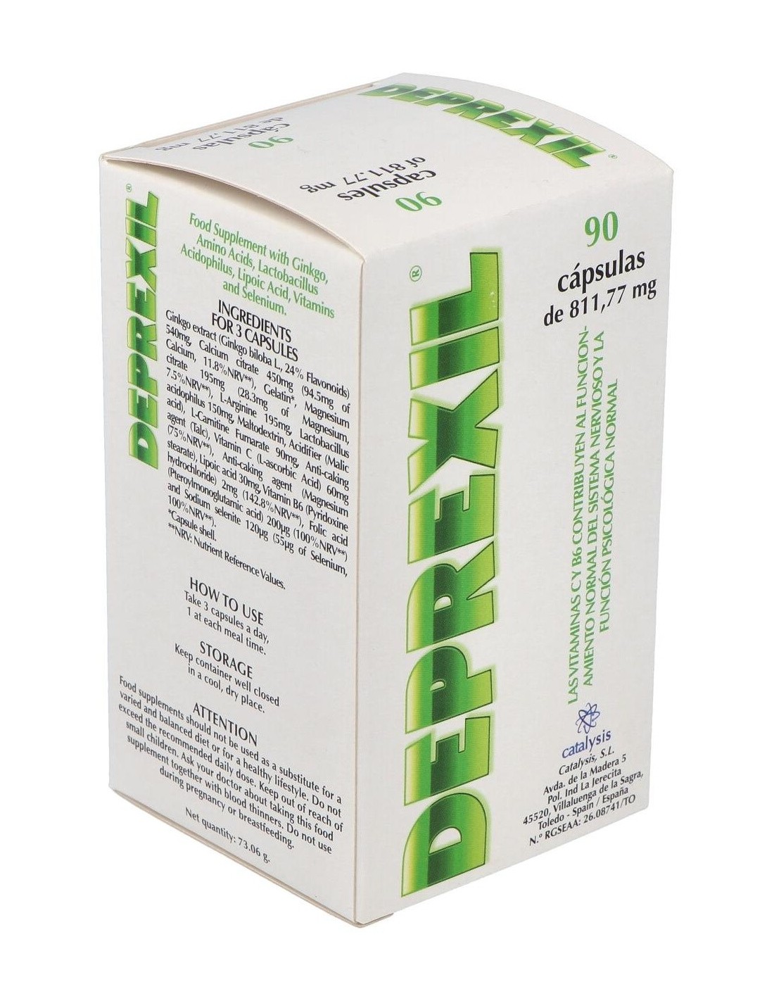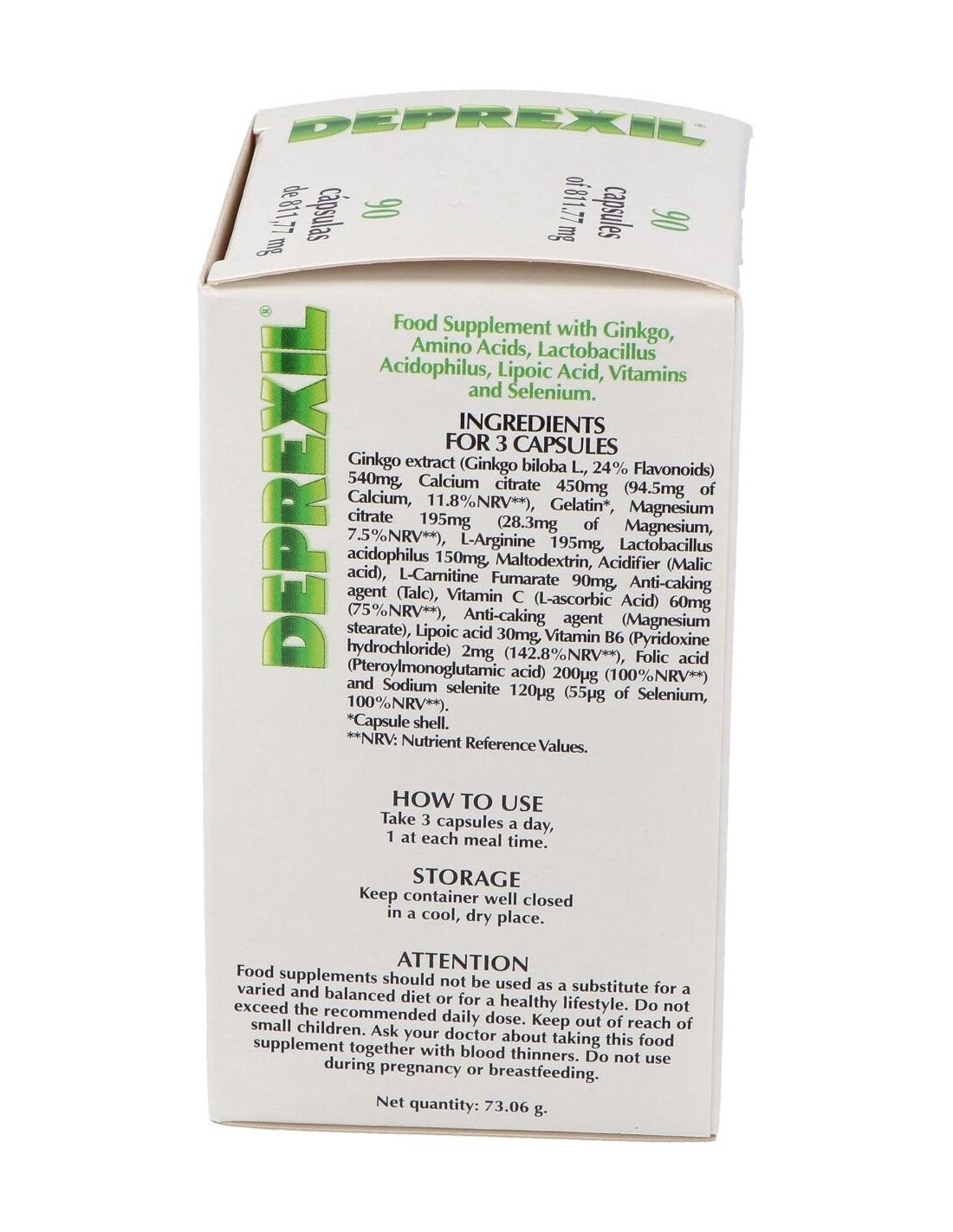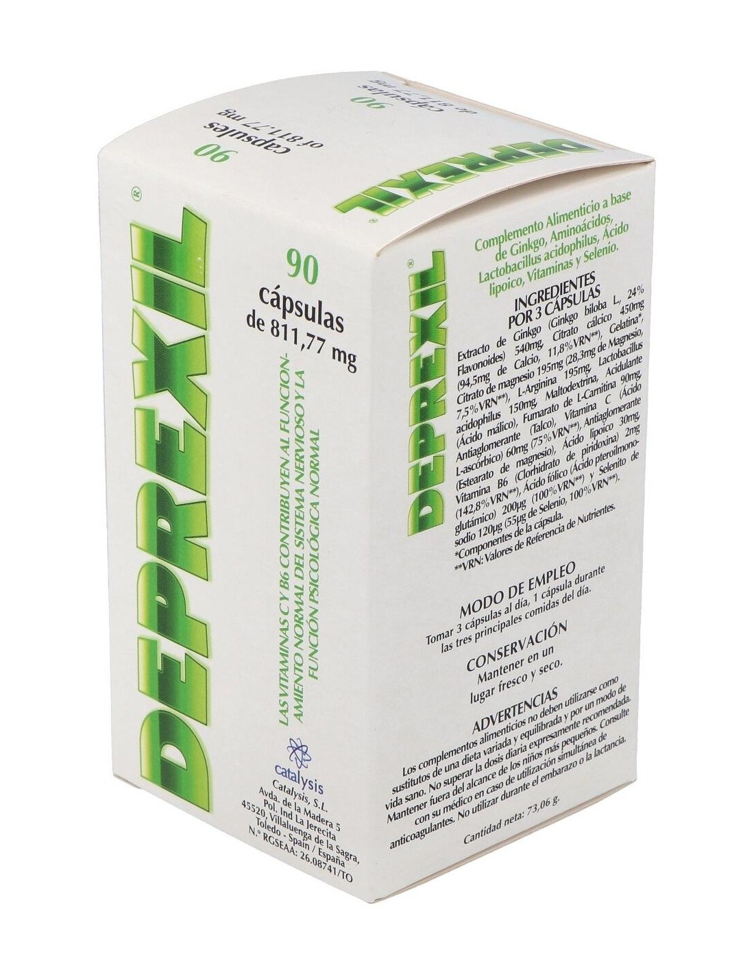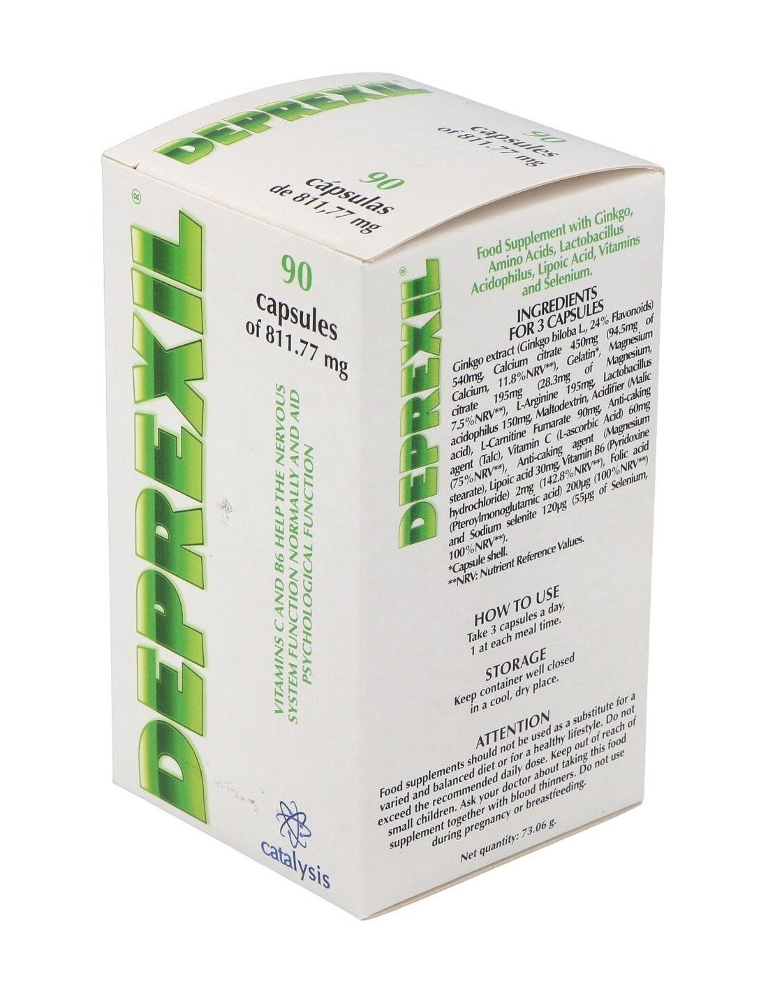 Complemento alimenticio formulado para tratar los estados depresivos leves y moderados asociados a la edad. La rica composición contiene Ginkgo, Citrato cálcico, Citrato de magnesio, L-Arginina, Lactobacillus Acidophilus, L-Carnitina fumarato, Vitamina C, Ácido lipoico, Vitamina B6, Ácido fólico , Selenito sódico, Acidulante (Ácido málico) y envoltura de Gelatina.