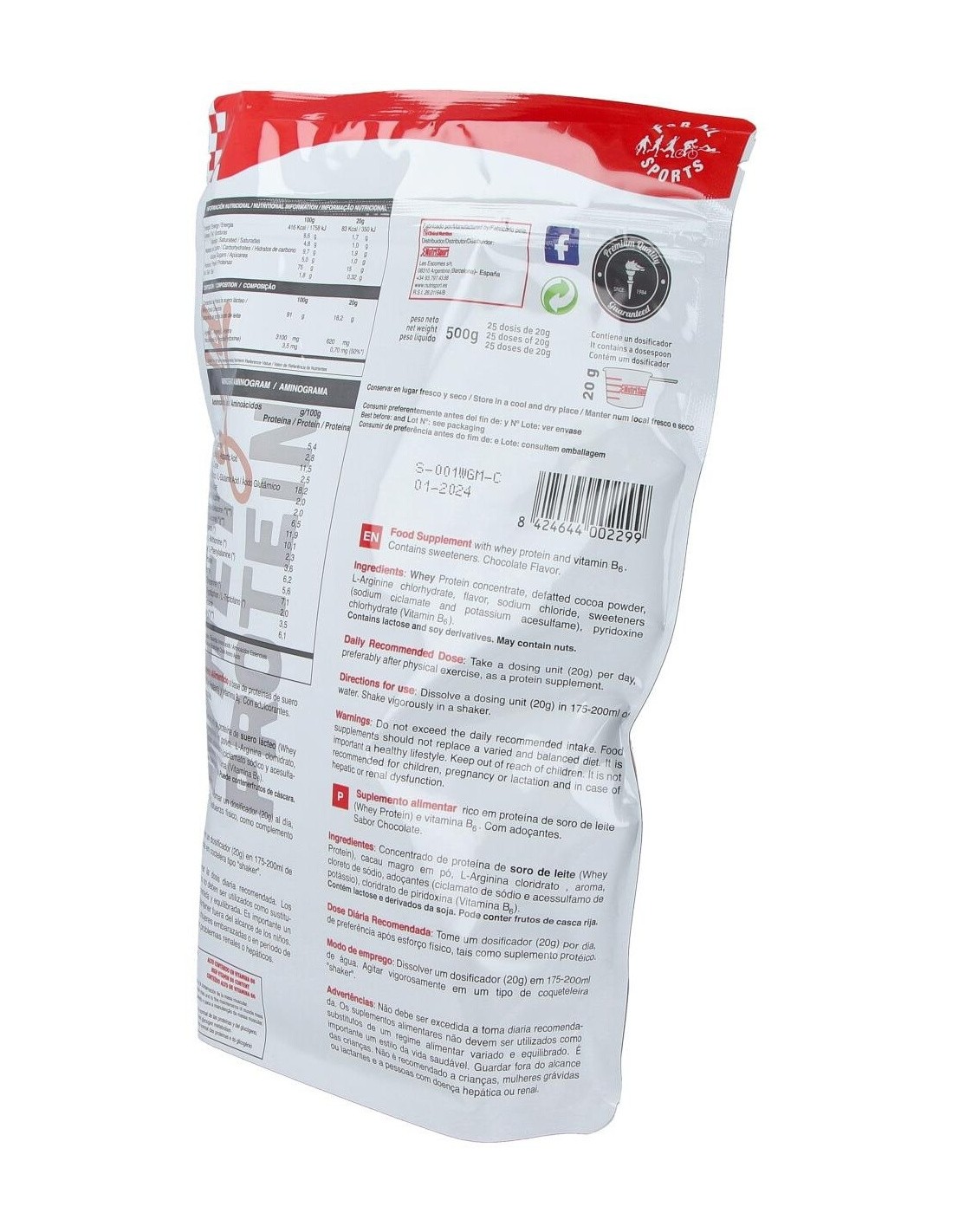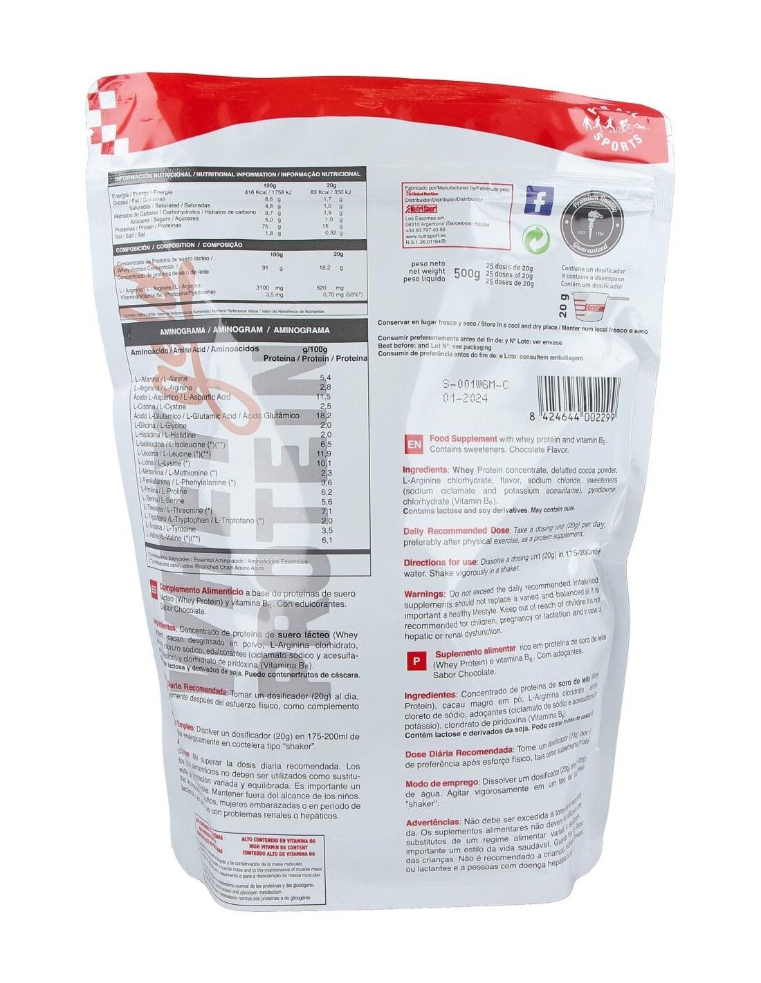 Nutrisport Whey Gold Protein Chocolate 500g es un suplemento nutricional para la vida del deportista a base de proteína de suero de leche, ayuda a aumentar la masa muscular. Recomendado para tomar después del entrenamiento. Aporta vitamina B6 y aminoácidos (BCAAs). Polvo sabor chocolate.