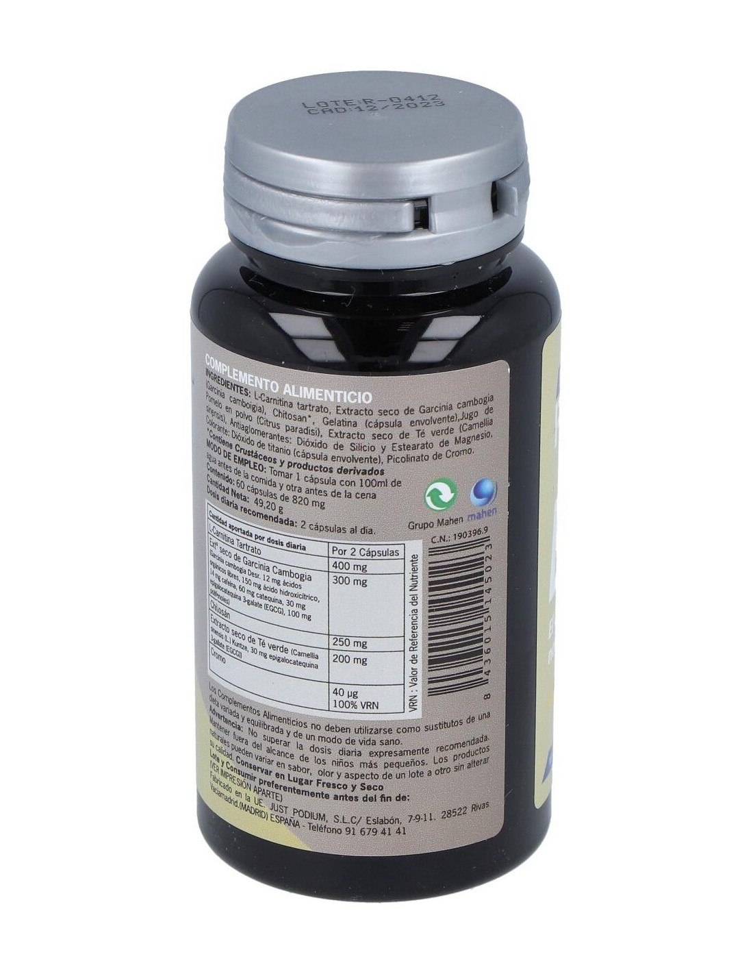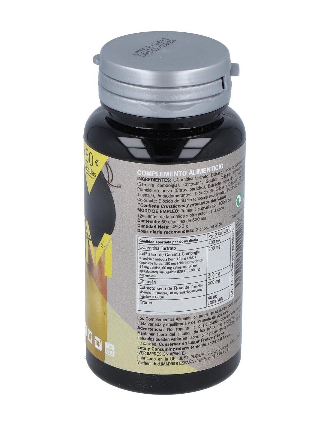 Suplemento alimenticio indicado para ayudar a reducir la acumulación de grasa en el tejido adiposo. Formulado con L-carnitina, extracto seco de garcinia, chitosan, jugo de pomelo, extracto seco de té verde, dióxido de silicio y estearato de magnesio. Favorece la movilización de grasas alojadas en el cuerpo. El té verde es un potente antioxidante, que favorece el buen funcionamiento del cerebro, la combustión de grasas y mejora el rendimiento físico.