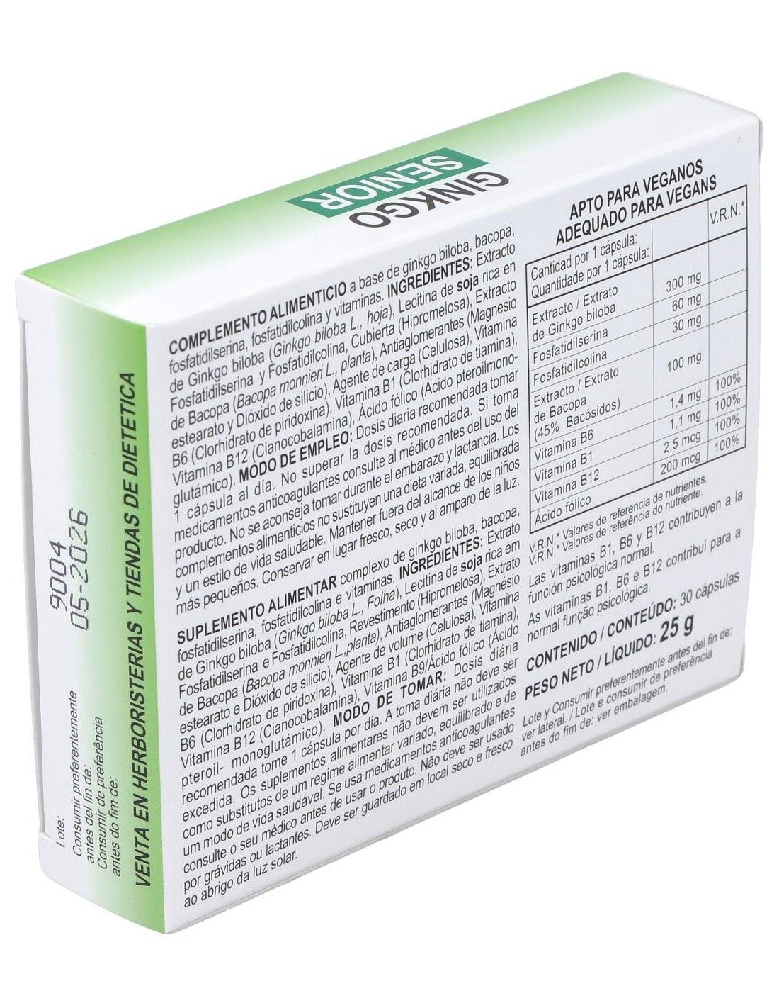 Extracto De Ginkgo (Ginkgo Biloba L., Hoja), Fosfatidilserina, Fosfatidilcolina, Extracto De Bacopa (Bacopa Monnieri L., Planta), Vitamina B1, Vitamina, Vitamina B9, Vitamina B12.