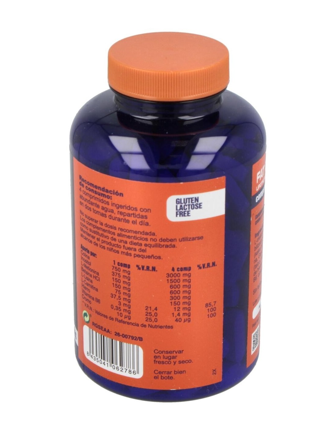 Cafeína, Dióxido de Silicio, Celulosa microcristalina, Picolinato de Cromo, Dióxido de titanio, Inositol, L-taurina, Extracto seco de Garcinia Cambogia, Sales magnésicas de ácidos grasos, L-Carnitina Tartrato, Gelatina comestible, Extracto seco de Citrus auriantium.