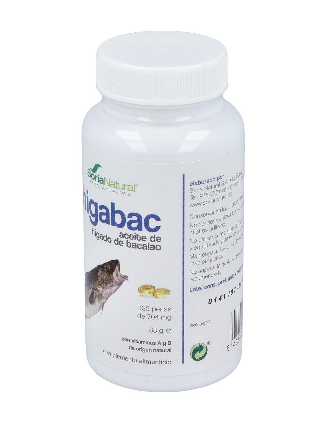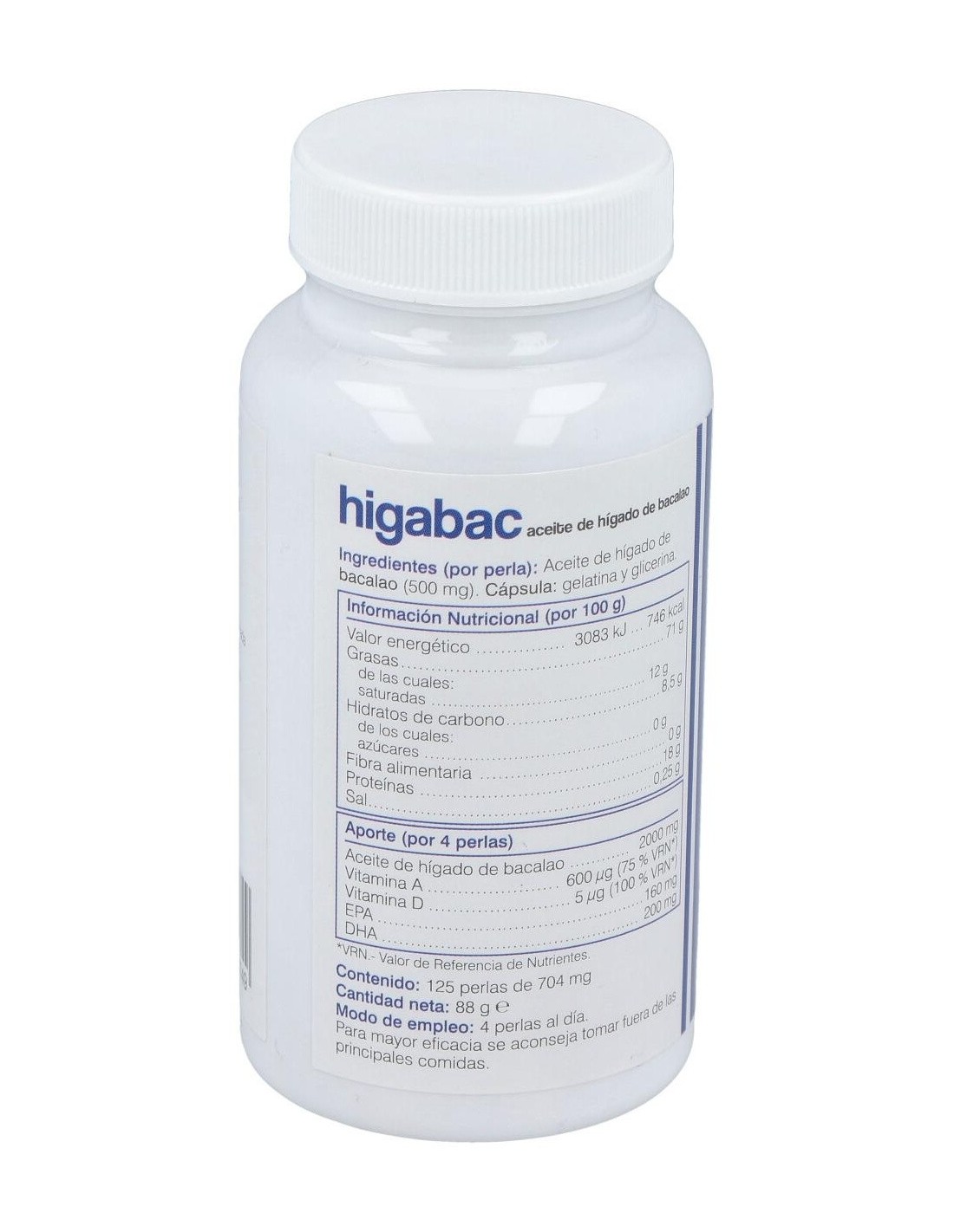 Higabac Aceite De Higado De Bacalao 125 Perlas es un complemento alimenticio a base de aceite de hígado de bacalao que se caracteriza por tener un elevado contenido en ácidos grasos omega 3, que son grasas insaturadas saludables que aportan muchos beneficios para el organismo, pues contribuyen a mantener la salud cardiovascular. Además, este producto contiene vitaminas A y D, que son liposolubles e imprescindibles para las funciones del organismo: