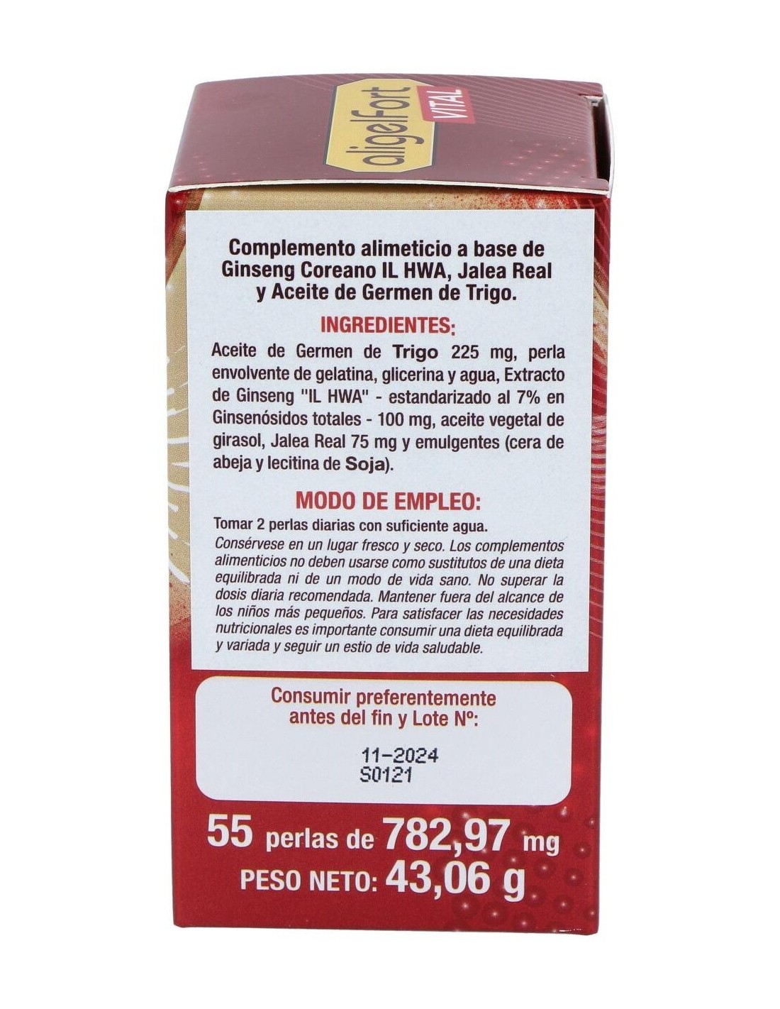 Es un complemento alimenticio a base de extracto seco de raíz entera de Ginseng Coreano IL HWA 5:1 (Panax ginseng C.A Meyer) de 6 años de edad, Jalea Real y aceite de germen de trigo. Contribuye a las defensas naturales y al buen funcionamiento del sistema inmune y a mantener niveles normales de glucosa en sangre. Ayuda a mantener un buen rendimiento cognitivo y a promover el estado de alerta. Contribuye al rendimiento de la memoria y ayuda a mantener buenas relaciones sexuales. Ayuda a contrarrestar la fatiga y promueve la vitalidad.