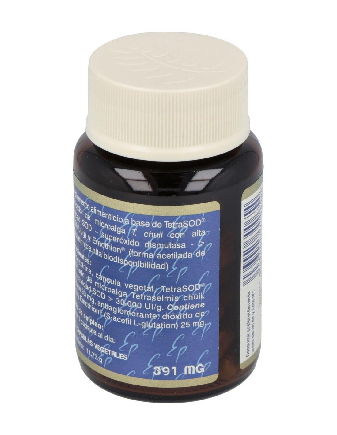 Complemento alimenticio a base de TetraSOD® (liofilizado de microalga T. chuii con alta actividad SOD superóxido dismutasa-) y Emothion® (forma acetilada de Glutation de alta biodisponibilidad). Apto para veganos.