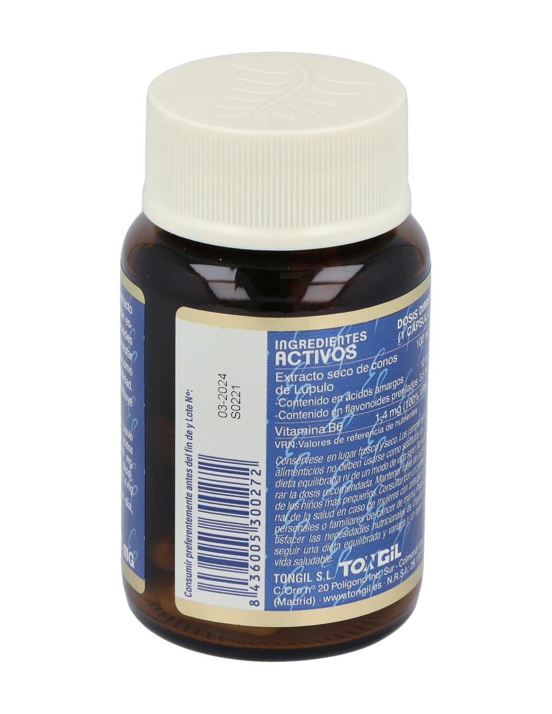 Por 1 cápsula: Extracto seco de conos de Lúpulo (100 mg): (Contenido en ácidos amargos 10 mg, Contenido en flavonoides prenilados (3,5 mg)); Vitamina B6 (1,4 mg).