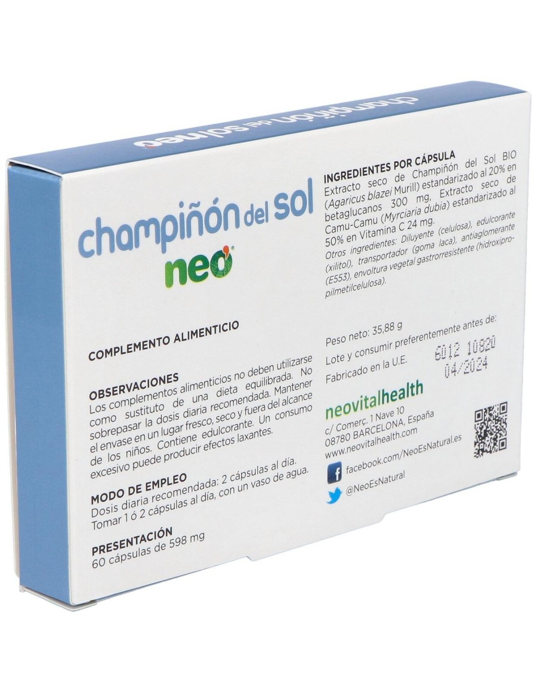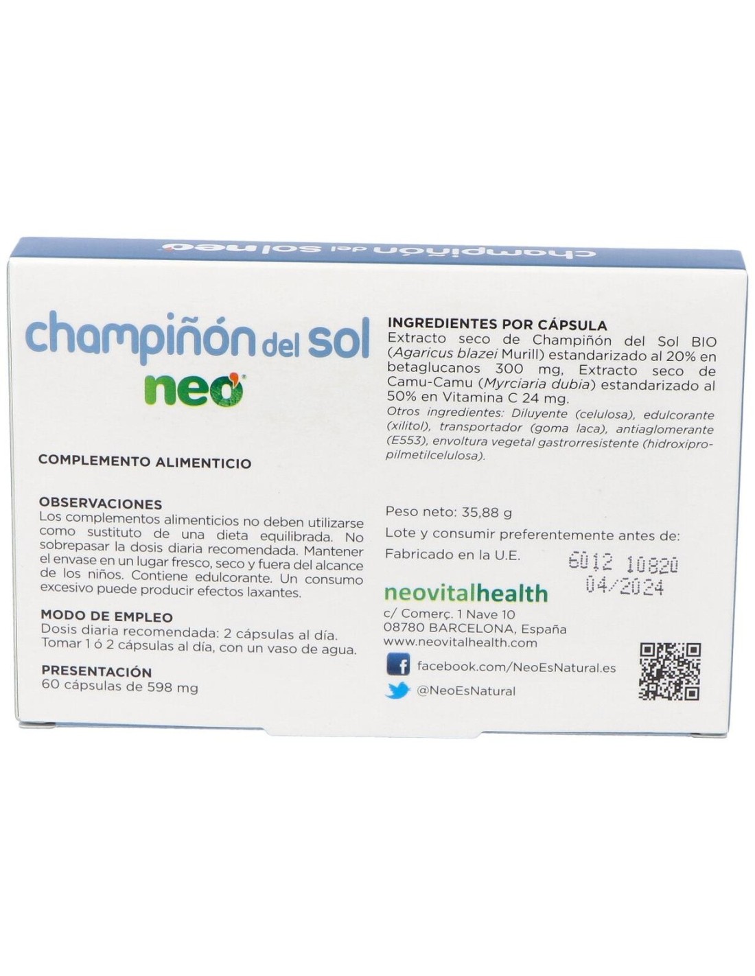 EXTRACTO SECO DE CHAMPIÑÓN DEL SOL BIO (AGARICUS BLAZEI MURILL) ESTANDARIZADO AL 20% EN BETAGLUCANOS: 300mg. EXTRACTO DE CAMU-CAMU (MYRCIARIA DUBIA) ESTANDARIZADO AL 50% EN VITAMINA C: 24mg.