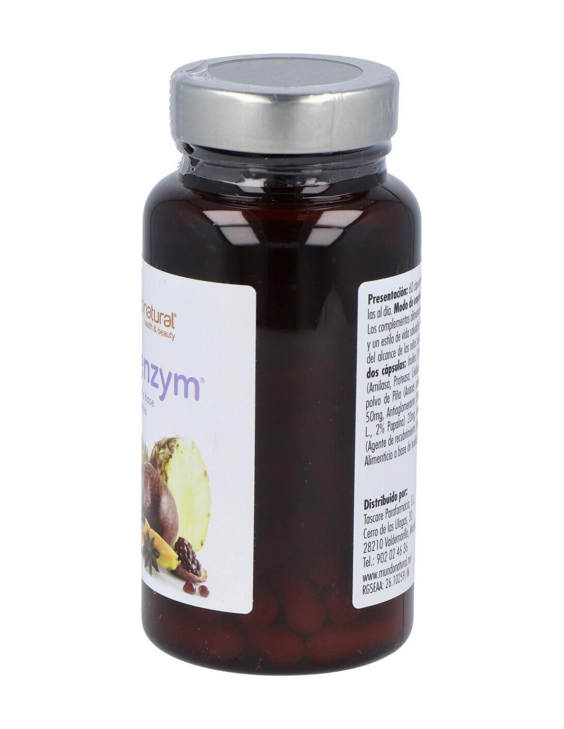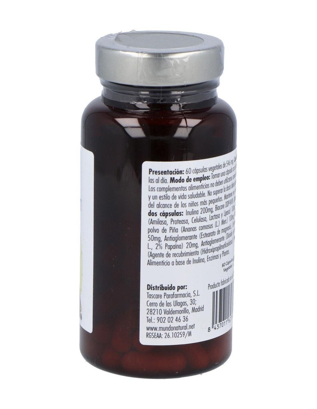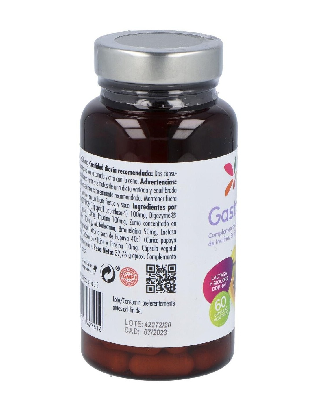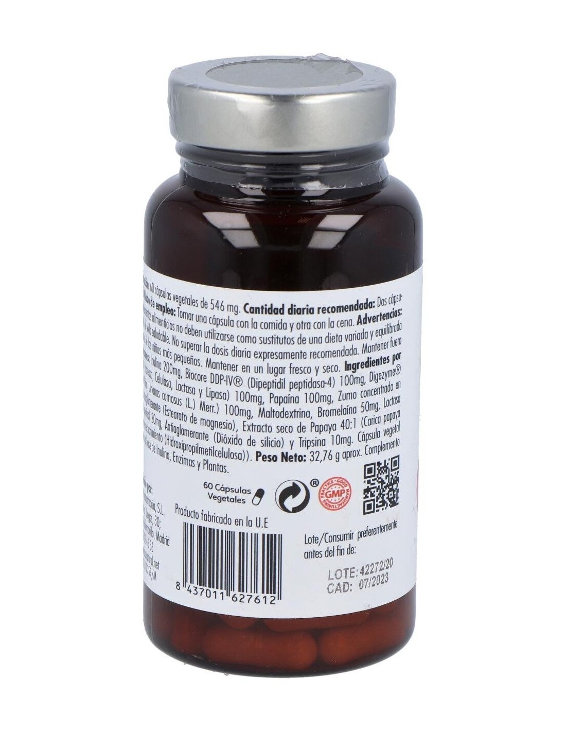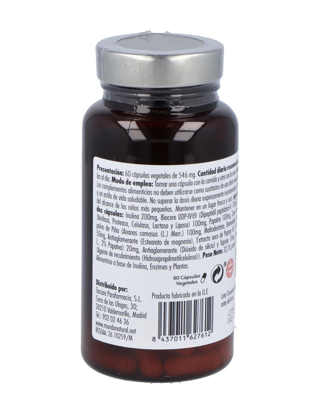 Por 2 cápsulas: Inulina 200 mg, Biocore DDP-IV® (Dipeptidil peptidasa-4) 100 mg, Digezyme® (Amilasa, Proteasa, Celulasa, Lactasa y Lipasa) 100 mg, Papaína 100 mg, Zumo concentrado en polvo de Piña (Ananas comosus (L.) Merr.) 100 mg, Maltodextrina, Bromelaína 50 mg, Lactasa 50 mg, Antiaglomerante (Estearato de magnesio), Extracto seco de Papaya 40:1 (Carica papaya L. 2% Papaína) 20 mg, Antiaglomerante (Dióxido de silicio) y Tripsina 10 mg, Cápsula vegetal (Agente de recubrimiento (Hidroxipropilmetilcelulosa)).