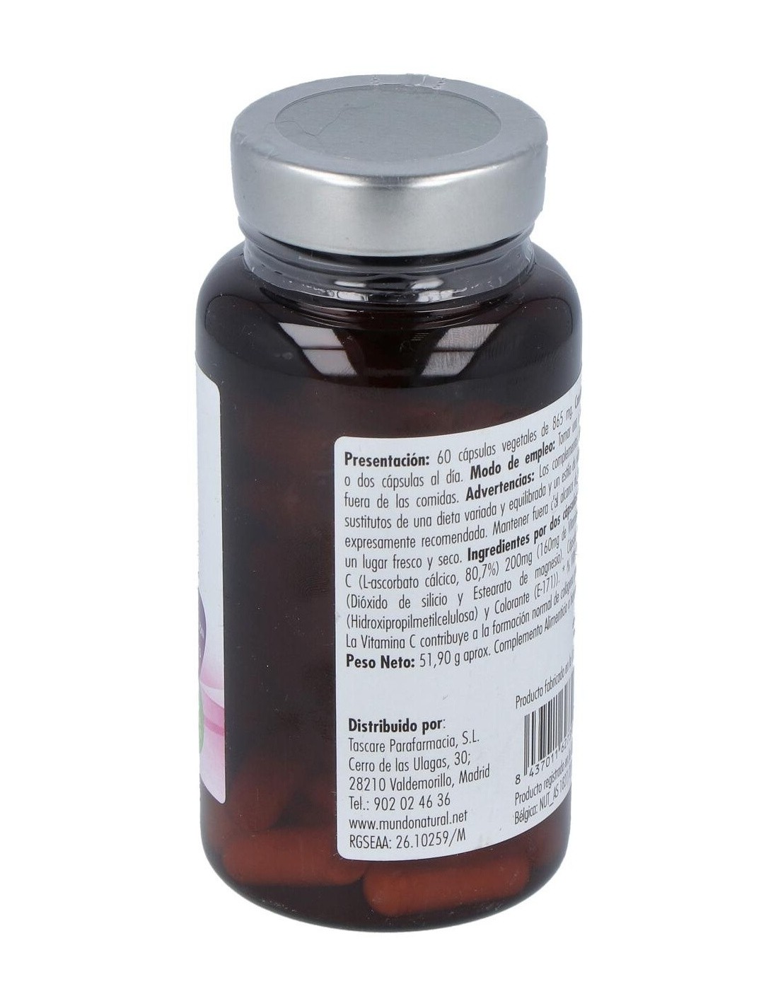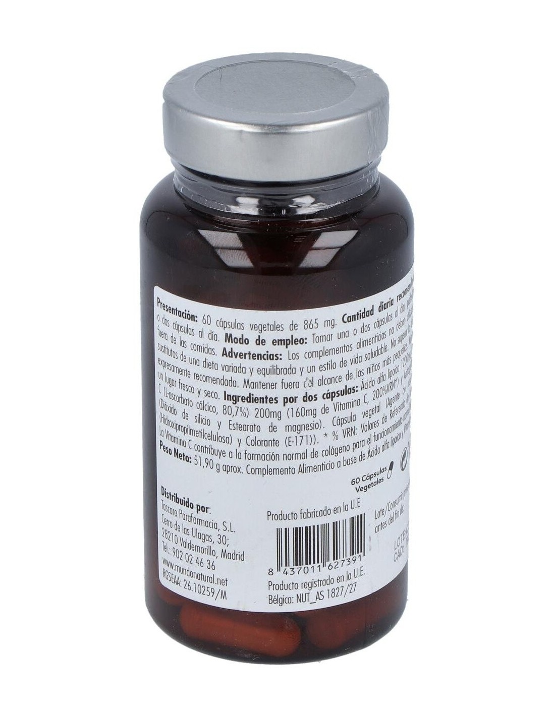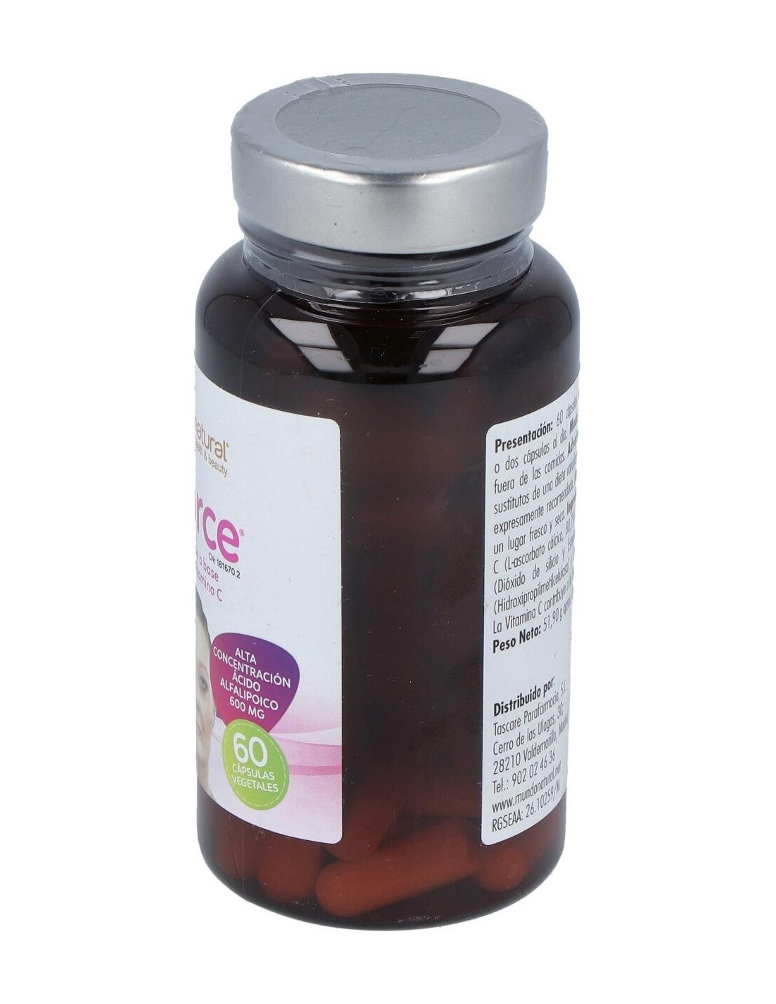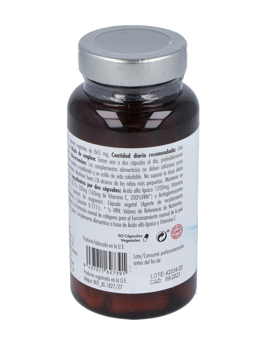 Por 2 cápsulas: Ácido alfa lipoico: 1200 mg, Vitamina C (Ácido L-ascórbico): 160 mg, Antiaglomerantes: Estearato de magnesio y Dióxido de silicio, Cápsula: Gelatina (Envoltura y colorante (E 171)).