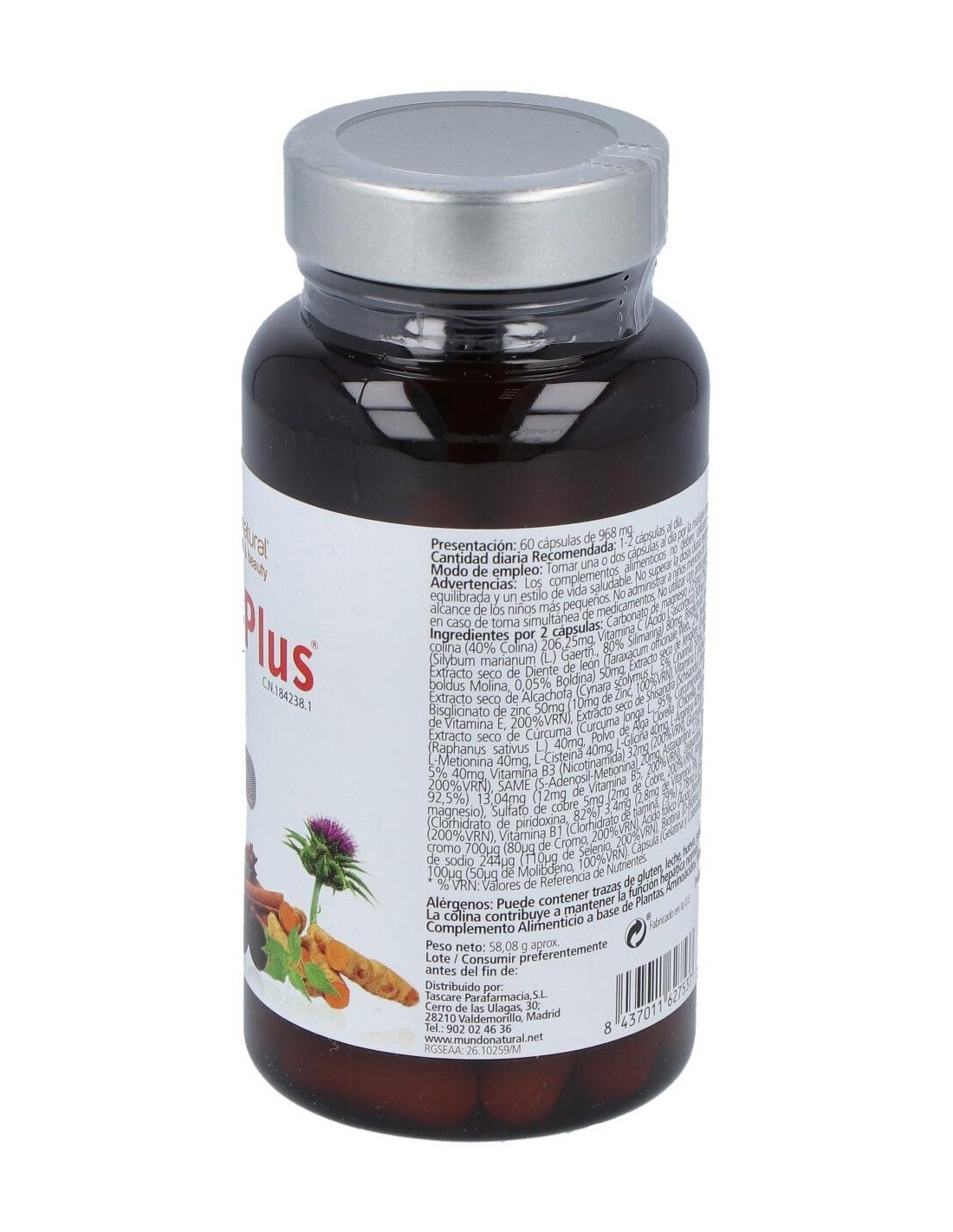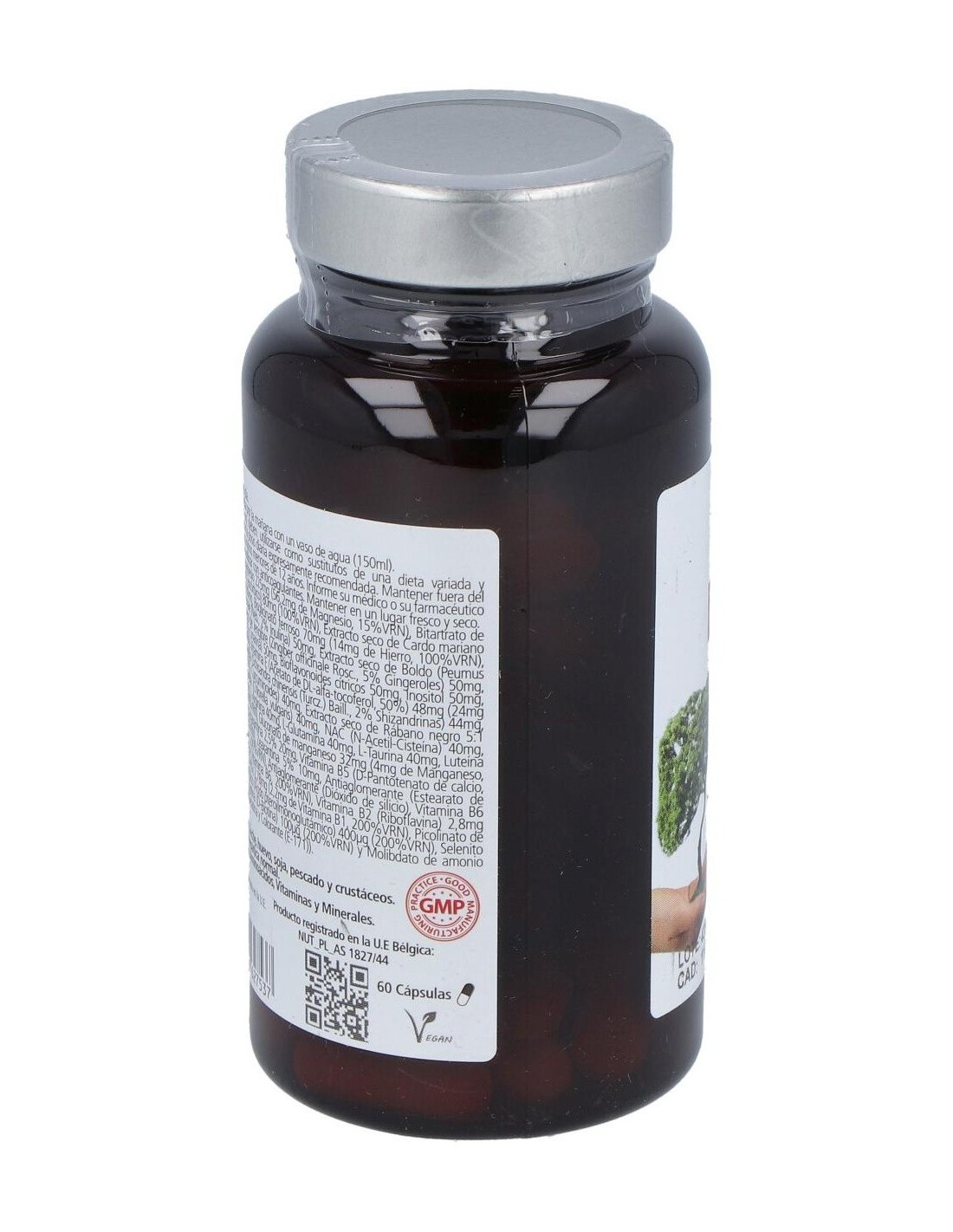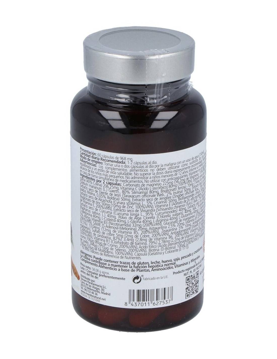 Ingredientes por dos cápsulas: Cardo mariano (Silybum marianum (L.) Gaertn., 80% Silimarina) 80 mg. Diente de león (Taraxacum of?cinale Web., 2% Inulina) 50 mg. Boldo(Peumus boldus Molina, 0,05% Boldina) 50 mg. Jengibre (Zingiber of?cinale Rosc., 5% Gingeroles) 50 mg. Alcachofa (Cynara scolymus L., 5% Cinarina) 50 mg. Shisandra (Schisandra chinensis (Turcz.) Baill., 2% Shizandrinas) 44 mg. Rábano negro 5:1 (Raphanus sativus L.) 40 mg. Cúrcuma (Cúrcuma longa L., 95% Curcuminoides) 40 mg. Bitartrato de colina (40% Colina) 206,25 mg. Inositol 50 mg. Biotina (D-Biotina) 100 µg (200%VRN). Bio?avonoides cítricos 50 mg. NAC (N-Acetil-Cisteína) 40 mg. SAME (S-Adenosil-Metionina) 20 mg. Vitamina B1 (Clorhidrato de tiamina, 79%) 2,78 mg (2,2mg de Vitamina B1, 200%VRN). Vitamina B2 (Ribo?avina) 2,8 mg (200%VRN). Vitamina B3 (Nicotinamida) 32 mg (200%VRN). Vitamina B5 (D-Pantotenato de calcio, 92,5%) 13,04 mg (12mg de Vitamina B5, 200%VRN). Vitamina B6 (Clorhidrato de piridoxina, 82%) 3,4 mg (2,8mg de Vitamina B6, 200%VRN). Ácido fólico (Ácido pteroilmonoglutámico) 400 µg (200%VRN). Vitamina C (Ácido L-ascórbico) 80 mg (100%VRN). Vitamina E(Acetato de DL-alfa-tocoferol, 50%) 48 mg (24mg de Vitamina E, 200%VRN). Alga Clorella (Chlorella vulgaris) 40 mg. Luteína 5% 40 mg. Astaxantina 2,5% 20 mg. Zeaxantina 5% 10 mg. L-Metionina 40 mg. L-Cisteína 40 mg. L-Glicina 40 mg. L-Arginina 40 mg. L-Glutamina 40 mg. L-Taurina 40 mg. Carbonato de magnesio 225 mg (56,2 mg de Magnesio, 15% VRN*). Bisglicinato de Zinc 50 mg (10mg de Zinc, 100% VRN). Gluconato de manganeso 32 mg (4mg de Manganeso, 200%VRN). Sulfato de cobre 5 mg (2mg de Cobre, 200%VRN). Bisglicinato ferroso 70 mg (14mg de Hierro, 100%VRN). Picolinato de cromo 700 µg (80µg de Cromo, 200 %VRN). Selenito de sodio 244 µg (110µg de Selenio, 200%VRN). Molibdato de amonio 100 µg (50 µg de Molibdeno, 100%VRN). Antiaglomerantes: Estearato de magnesio y Dióxido de silicio. Cápsula: Gelatina y Colorante (E-171).