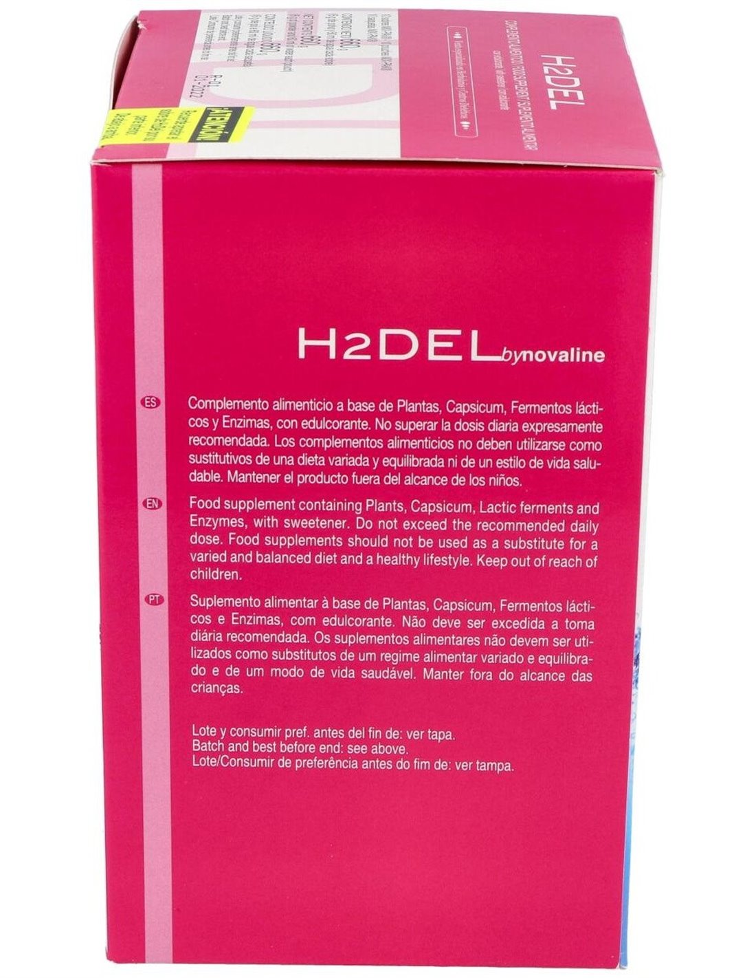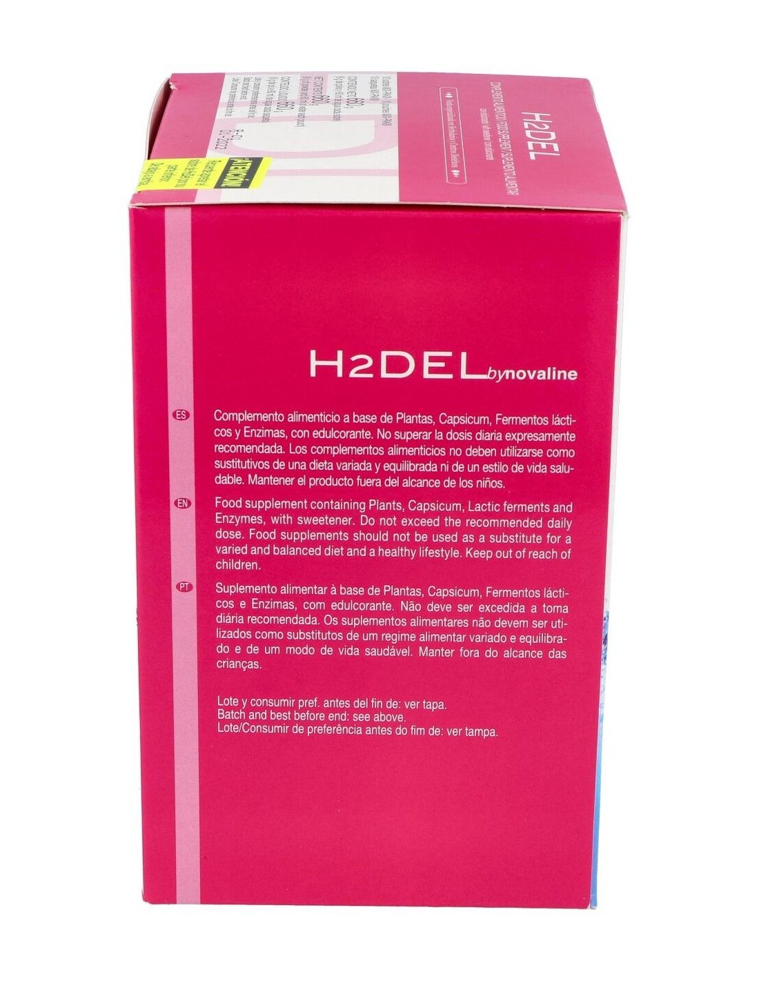 Agua, Maltodextrina, Mezcla de extractos secos de plantas: Hibisco (125 mg), Alcachofa (125 mg), Cola de caballo (100 mg), Diente de león (75 mg), Cardo mariano (50 mg), Capsicum (0,36 mg): Fermentos lácticos (200 mg) (Bifidobacterium lactis, Enterococcus faecium, Lactobacillus acidophilus, Lactobacillus paracasei, Lactobacillus plantarum, Lactobacillus salivarius, Lactococcus lactis) (soja, leche), Acidulante (ácido cítrico), Aroma, Papaína (50 mg), Bromelaína (50 mg), Antiaglomerante (dióxido de silicio), Edulcorante (sucralosa).