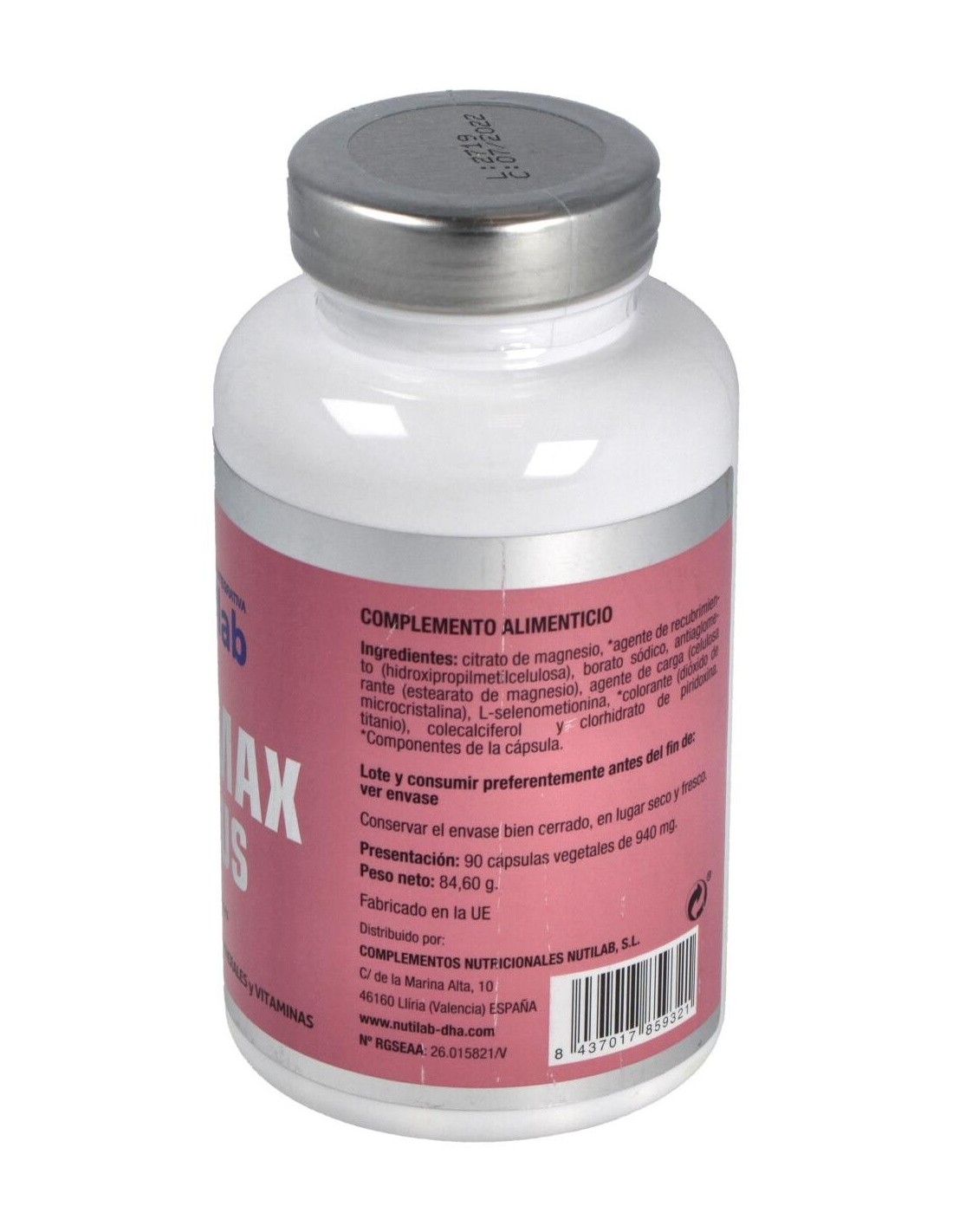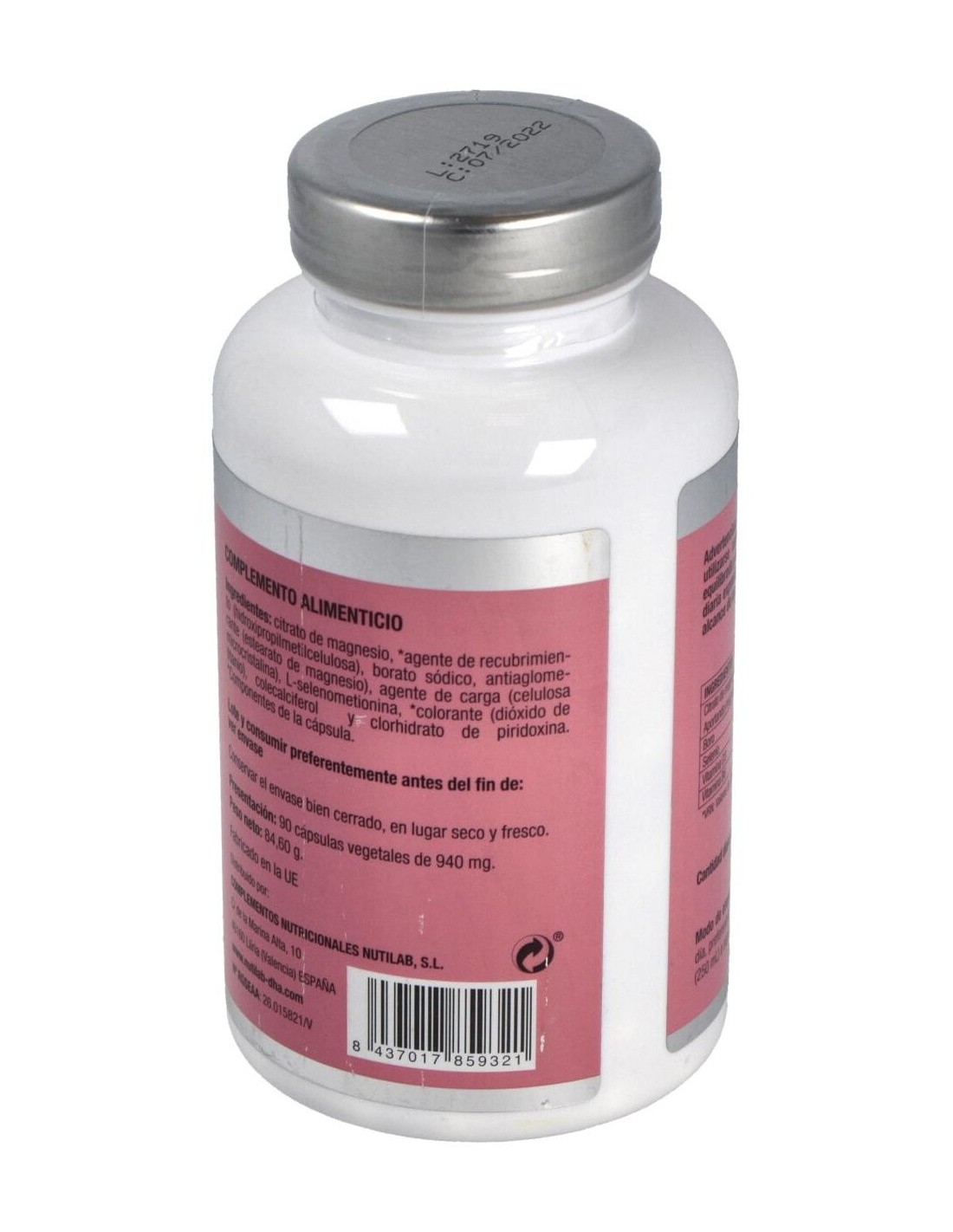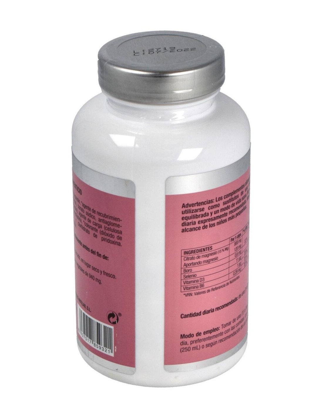 Citrato de magnesio, agente de recubrimiento (hidroxipropilmetilcelulosa), borato sódico, antiaglomerante (estearato de magnesio), agente de carga (celulosa microcristalina), L-selenometionina, colorante (dióxido de titanio), colecalciferol y clorhidrato de piridoxina.