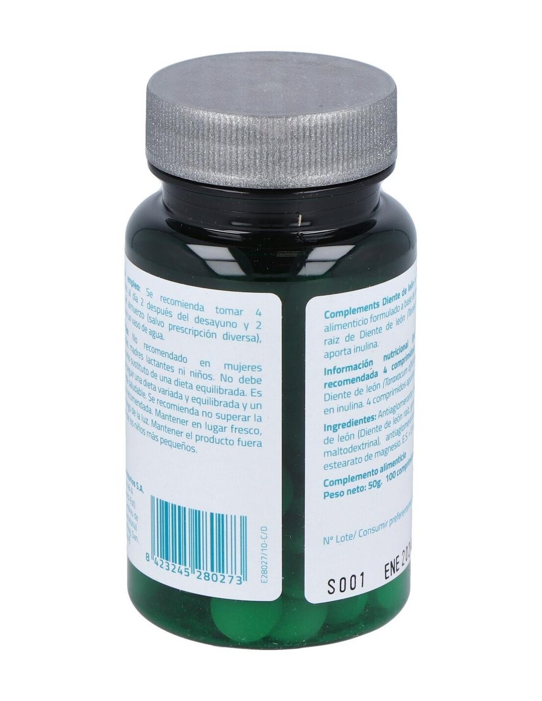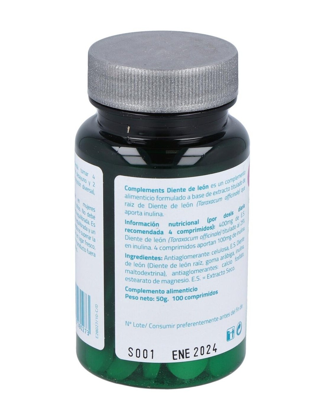 Antiaglomerante: celulosa: E.S. Diente de León (Diente de León raíz, goma arábiga, inulina, maltodextrina): antiaglomerantes: estearato de magnesio, calcio fosfato.